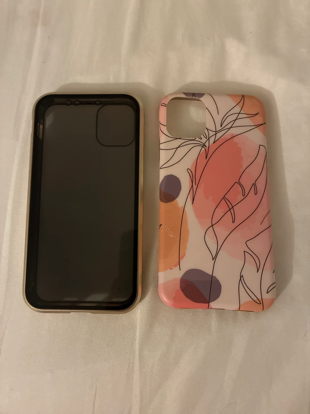 This is a phone case for an iPhone 11 It features a white base with a pink and coral abstract floral design and purple circles. The inner lining is black with a gold-colored bumper.