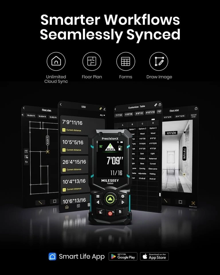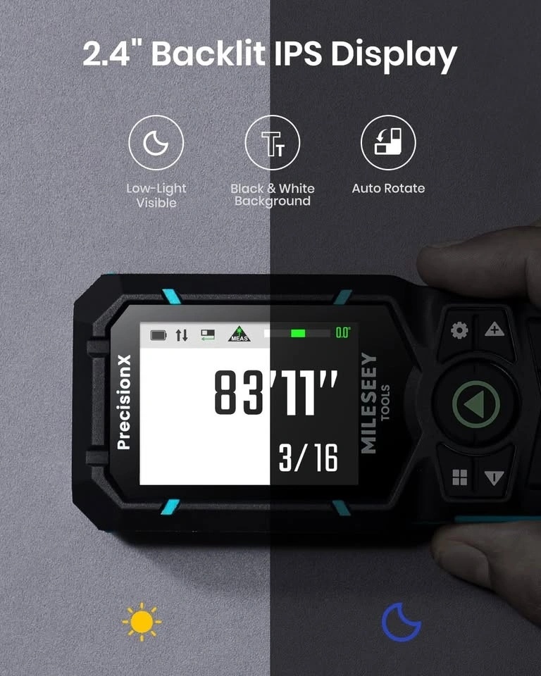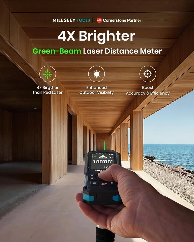 Awesome MILESEEY S50 Green-Beam Laser Distance Measure. This tool has a 400ft range and is super accurate with ±1/16". It's rechargeable and has a bright 2.4" IPS display. Great for indoor and outdoor projects, does P2P, area, volume measurements. Super bright green laser, 4x brighter than red ones, even works well in sunlight thanks to PowerBurst Technology.