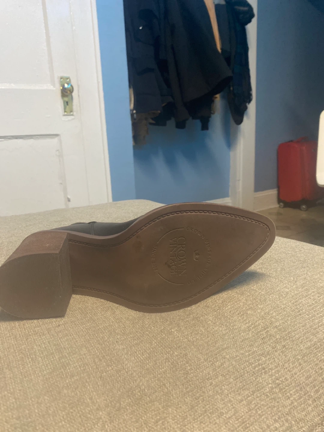 Selling a pair of Crown Vintage black leather heeled booties. These are in good condition and ready for a new owner! They feature a comfortable heel and a stylish design, perfect for dressing up or down. The leather material adds a touch of sophistication to any outfit
