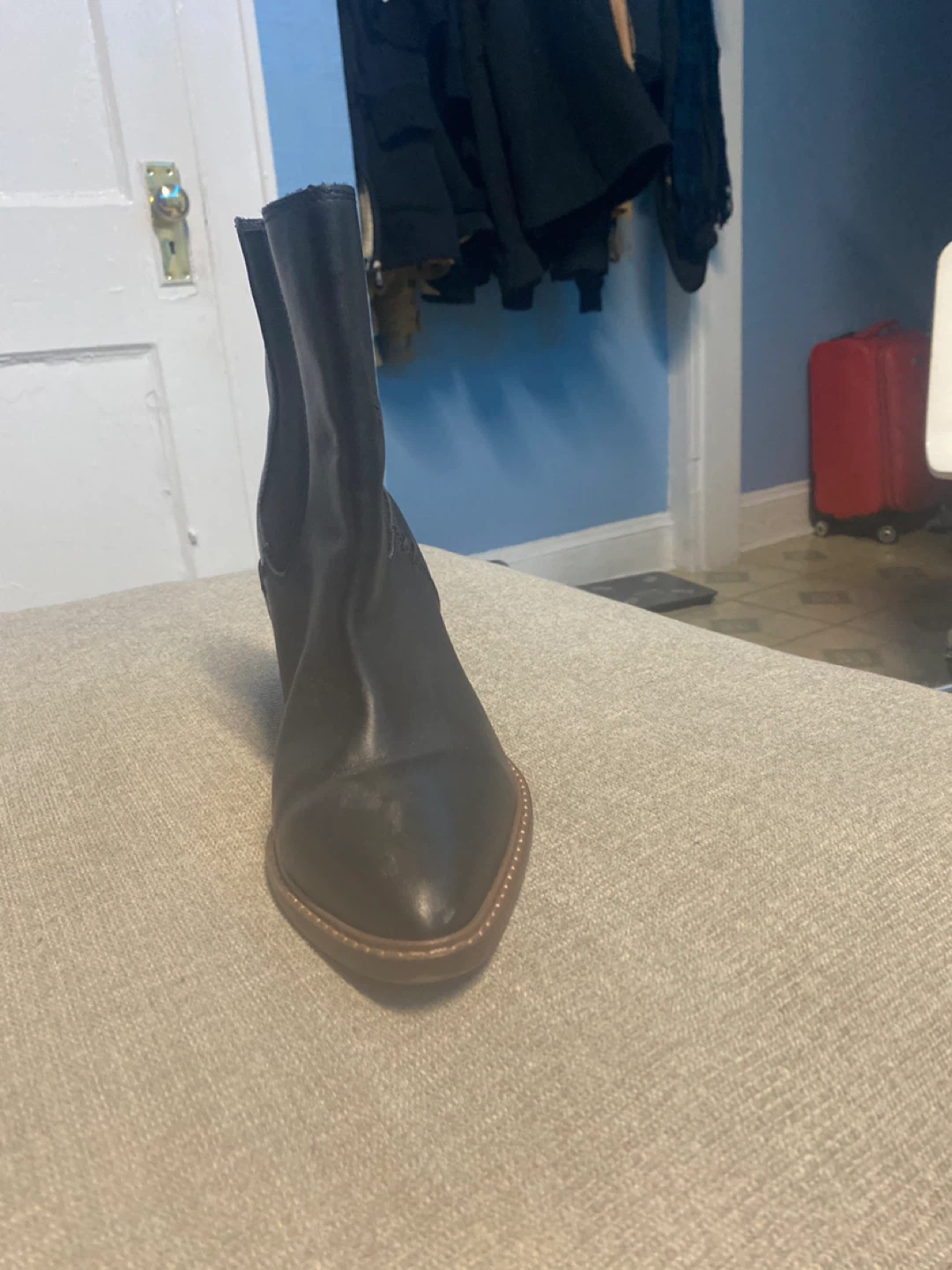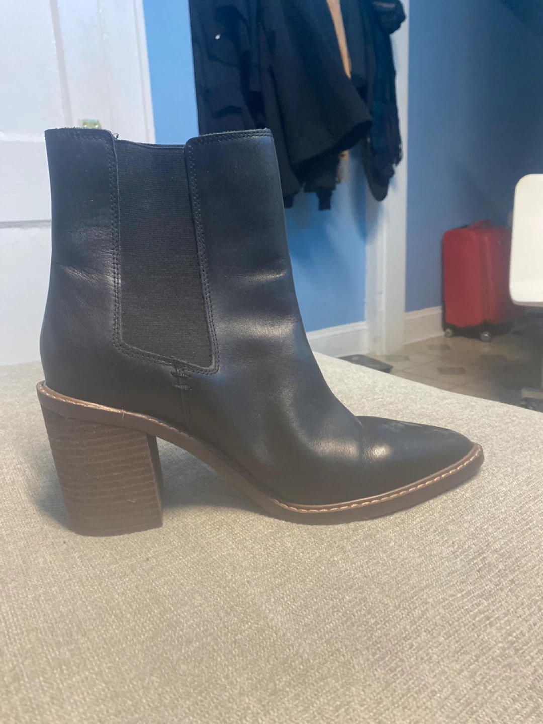 Selling a pair of Crown Vintage black leather heeled booties. These are in good condition and ready for a new owner! They feature a comfortable heel and a stylish design, perfect for dressing up or down. The leather material adds a touch of sophistication to any outfit