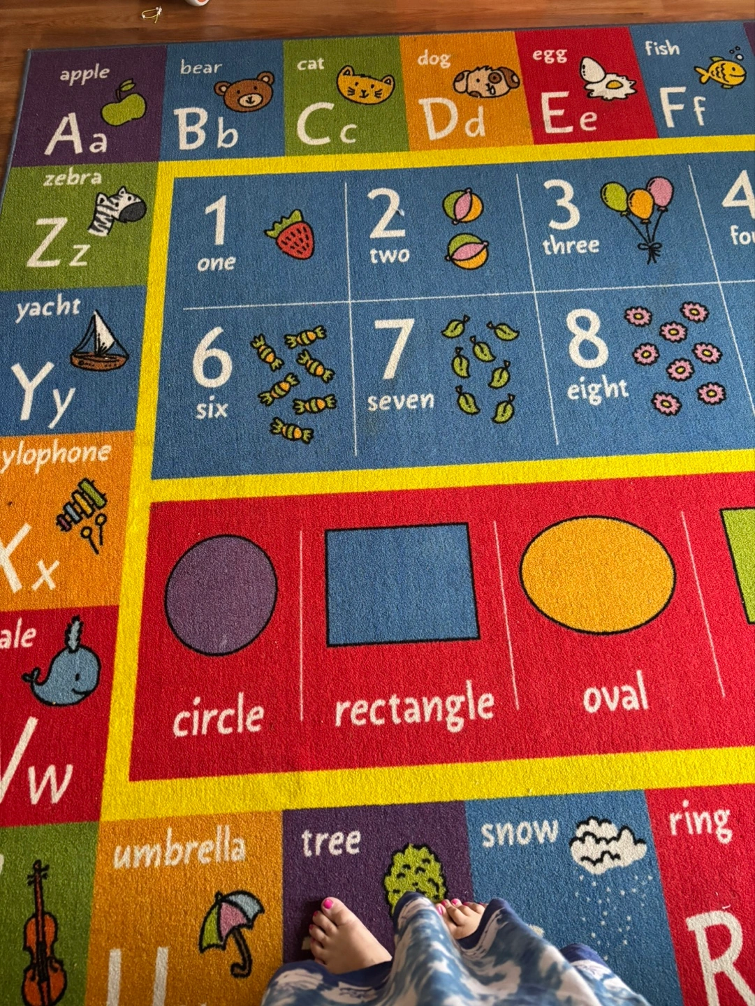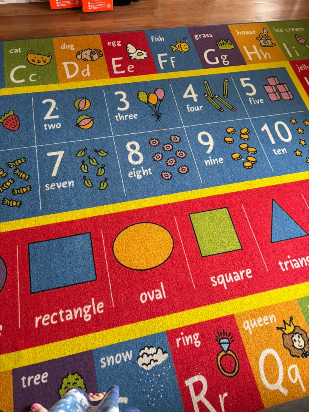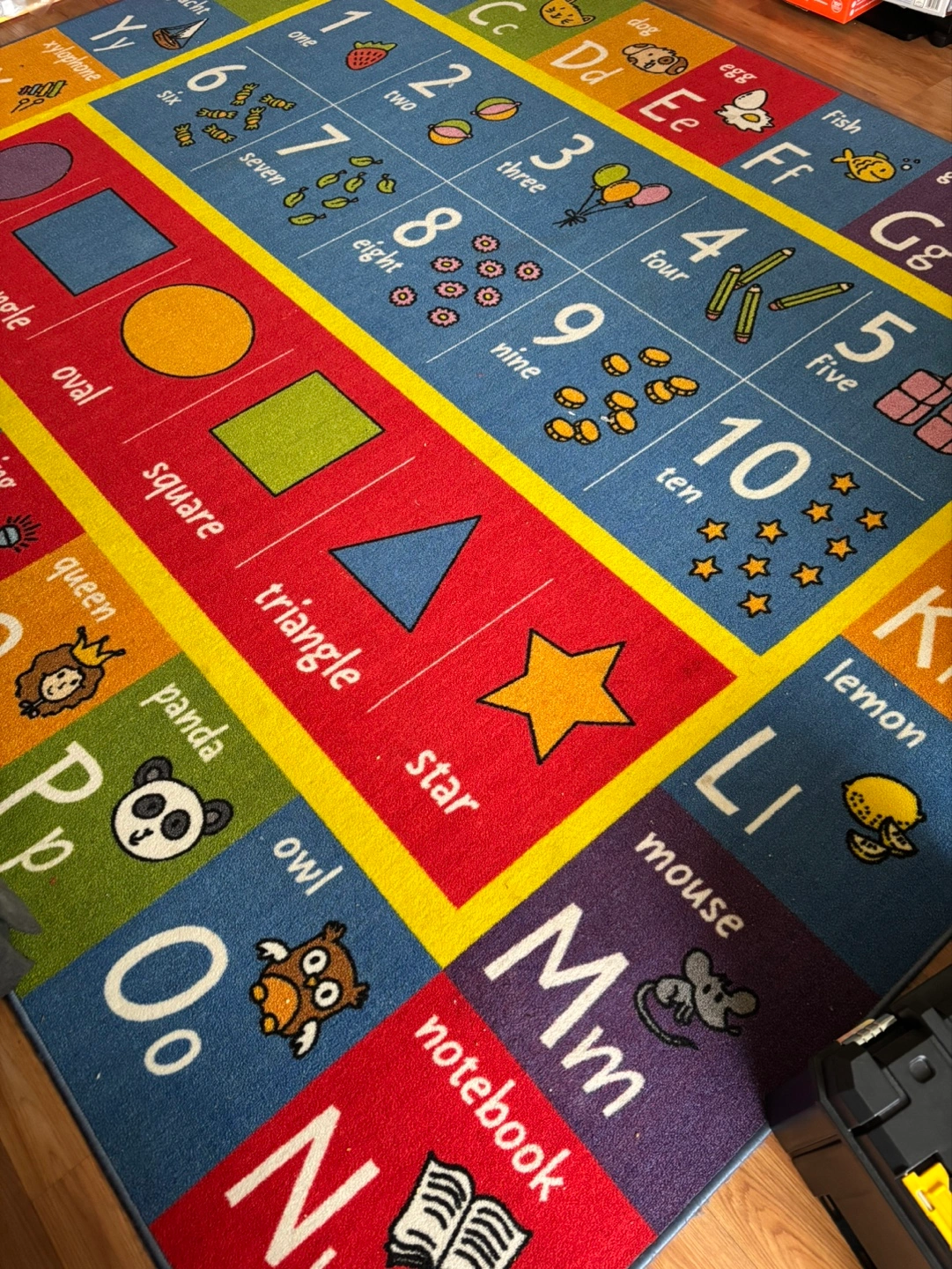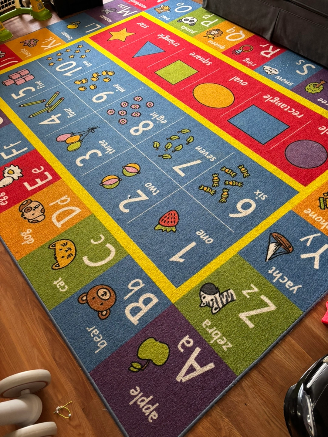 123Colorful rug features alphabet, numbers 1-10, shapes, and pictures. Great for learning and playtime. Good used condition. $20 Approx 9 feet by 9 feet