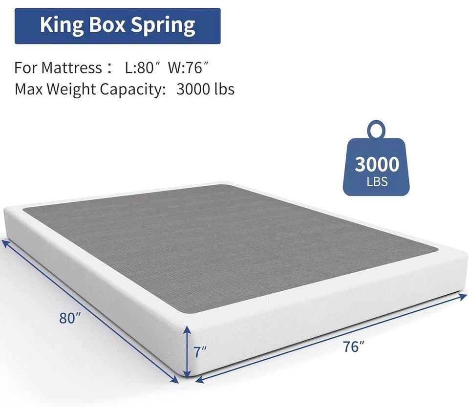 7-inch box spring, low-profile metal mattress base, 3000-pound strong steel structure, easy assembly (King). Variety of measurements of length, width and height ask for the size you are looking for I will answer as soon as possible.
