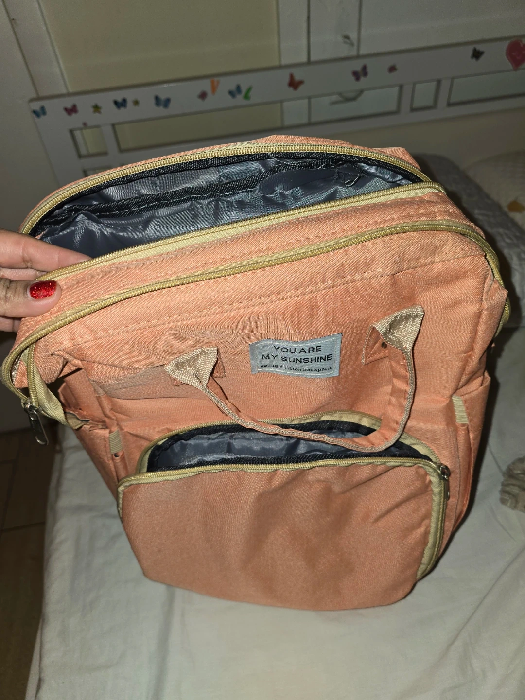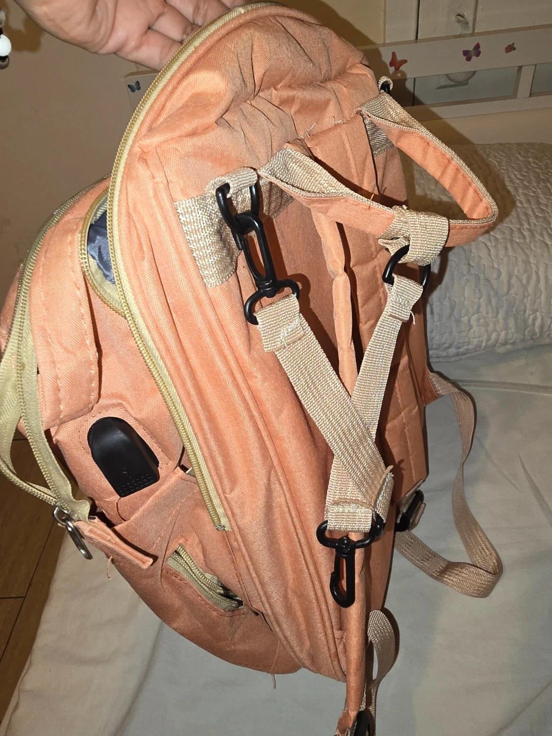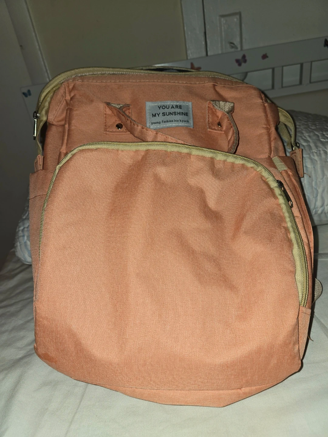 This is a young fashion backpack. It's a lovely peach color with plenty of compartments. It has adjustable straps and a USB charging port.