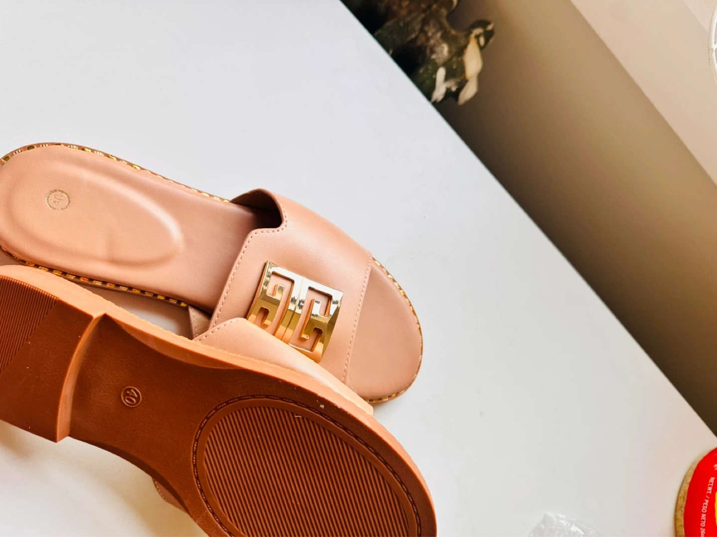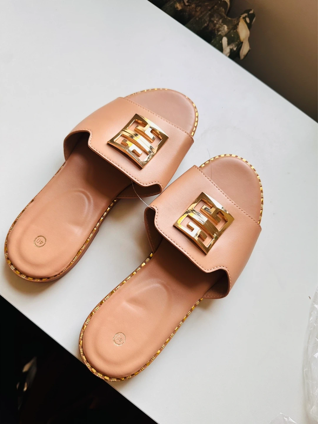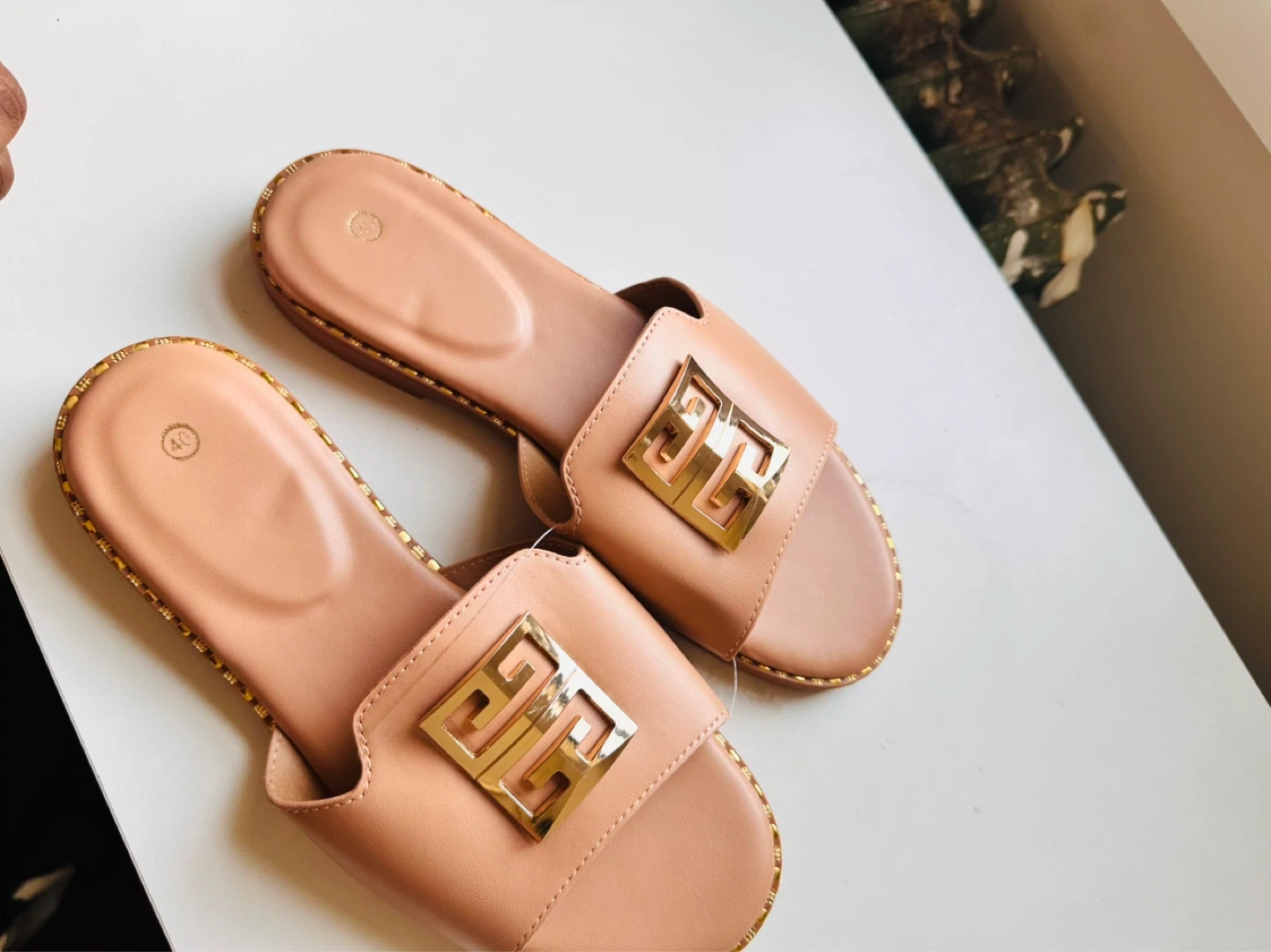 These slip-on slides feature a stylish gold-tone buckle detail. The material appears to be faux leather with a rubber sole. They're a neutral peachy-pink color. Great for casual wear!