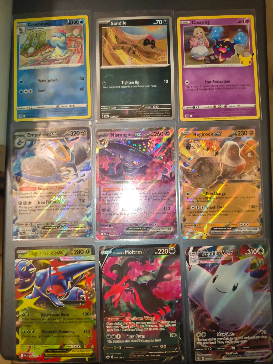 This is a collection of various Pokemon trading cards. Includes EX, V, and VMAX cards like Empoleon EX, Regirock EX, Mega Garchomp EX, and Togekiss VMAX. Also features Sandile, Cosmog, Mismagius, Iron Jugulis, Latias, Umbreon, Flareon, Jolteon, Caterpie, Metapod, Butterfree, Whimsicott, and more. Cards are in good condition.