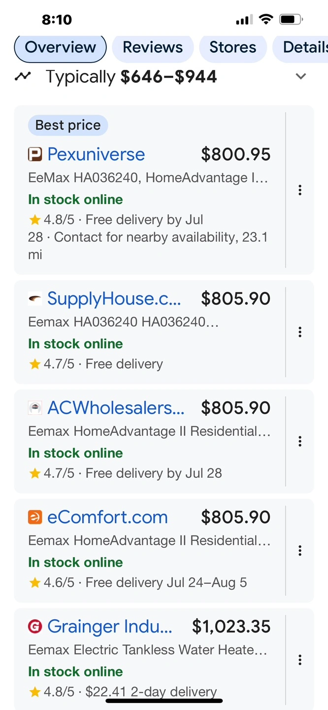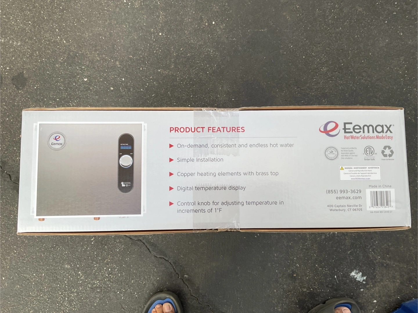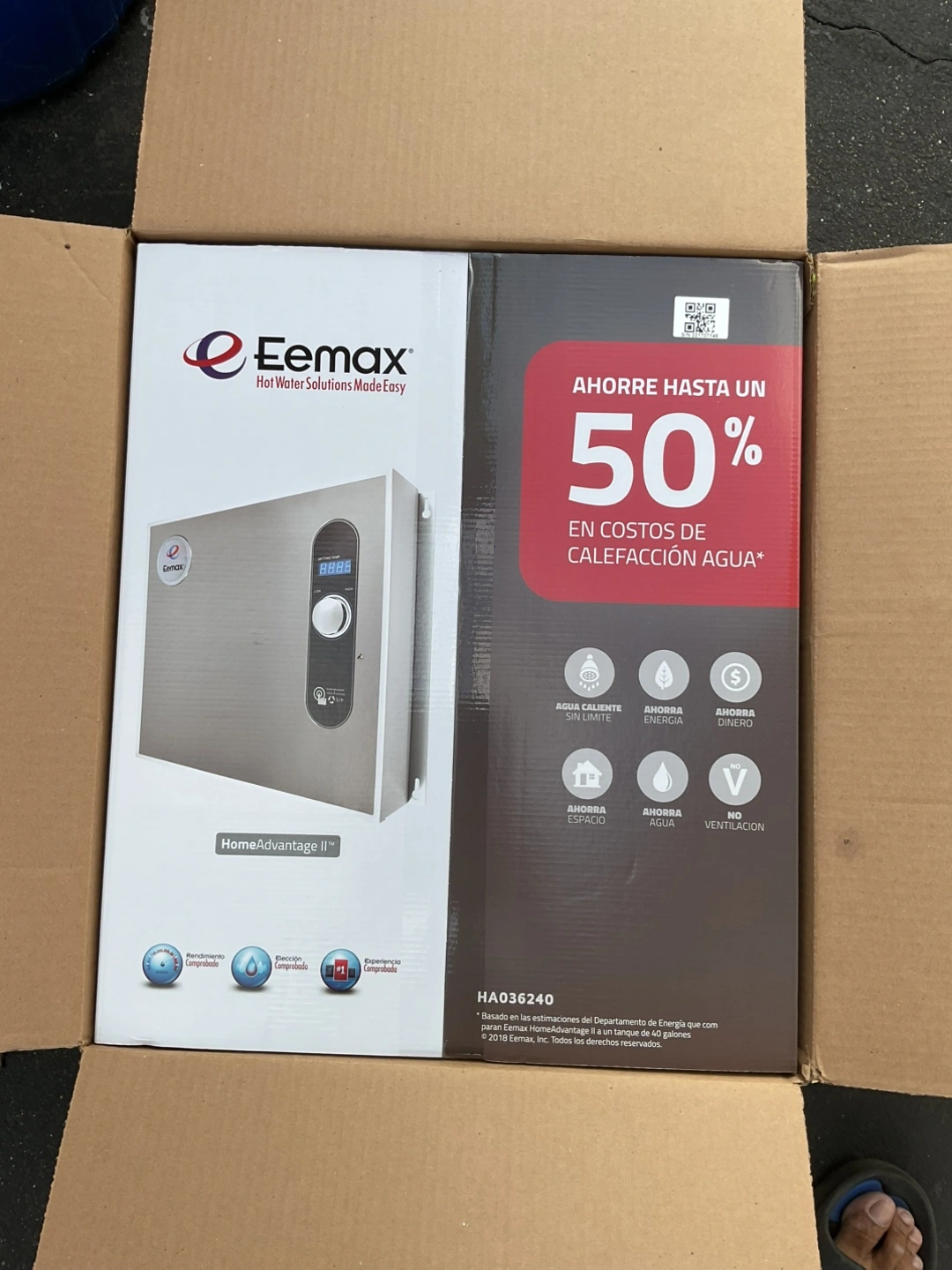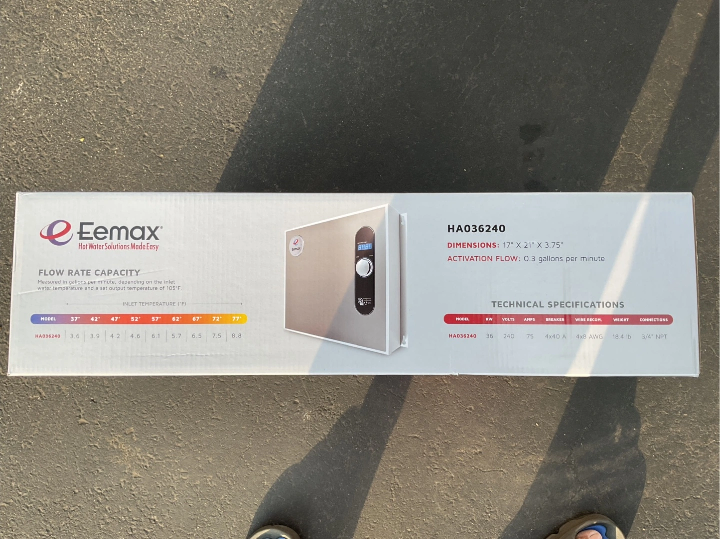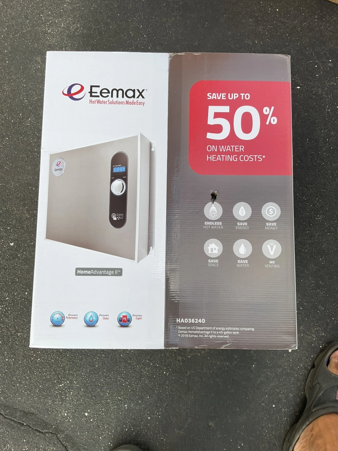 73Selling a brand new Eemax HA036240 HomeAdvantage II Electric Tankless Water Heater! This model offers on-demand, consistent, and endless hot water. It features a digital temperature display and a control knob for adjusting the temperature in increments of 1°F. Key specs: - Dimensions: 17" x 21" x 3.75" - Activation Flow: 0.3 gallons per minute