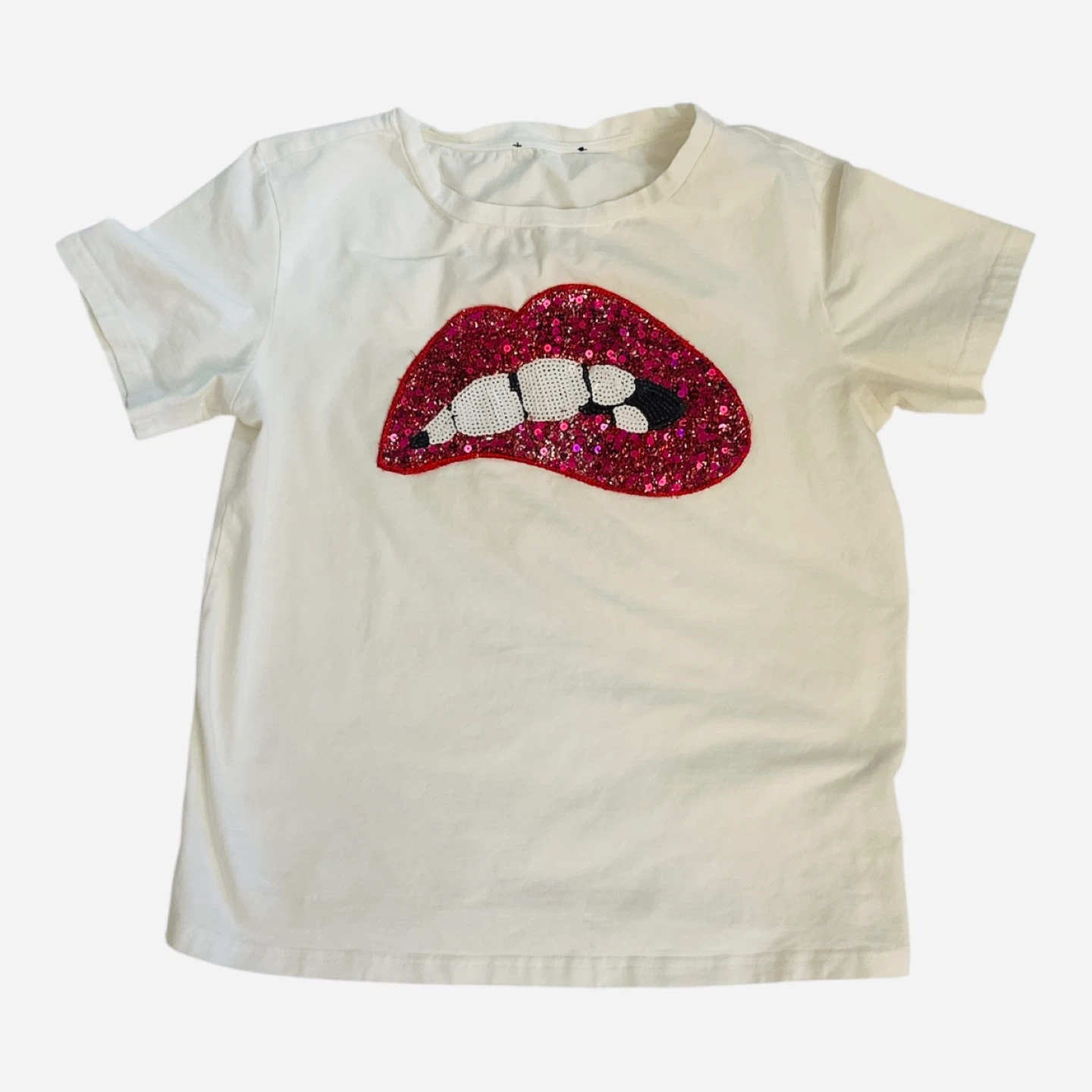 1 / 11 / 1Buy & SellWhite T-Shirt with Glitter Lips GraphicWhite T-Shirt with Glitter Lips Graphic$15White cotton t-shirt with a fun graphic of sparkly red lips biting down. Short sleeves and a comfortable fit.WHERE TO MEET10016View MapSELLERverifiedAleMurray Hill762 reviews0 chats·0 favorites·2 viewsSEND CHAT TO SELLERHi Ale! I’m interested in your listing.Hi Ale! I’m interested in your listing.Get the Karrot app to chatSign In to chat