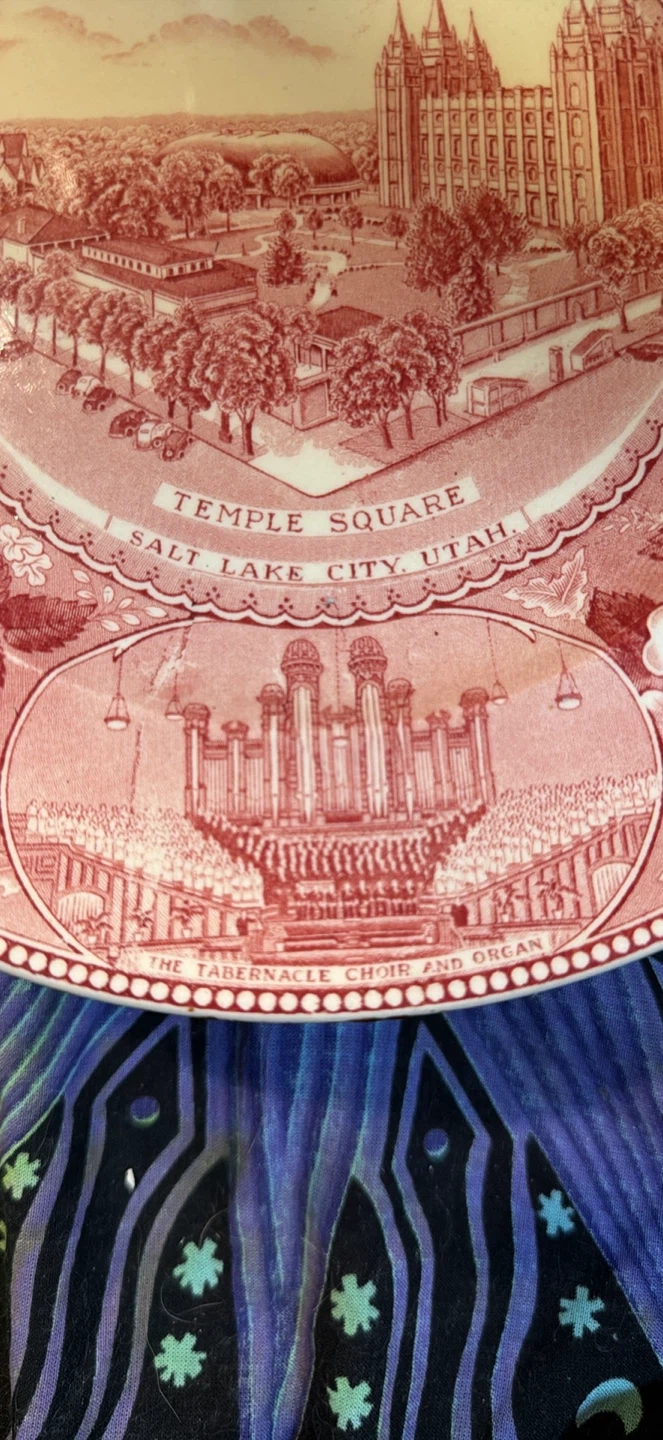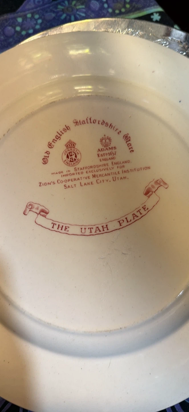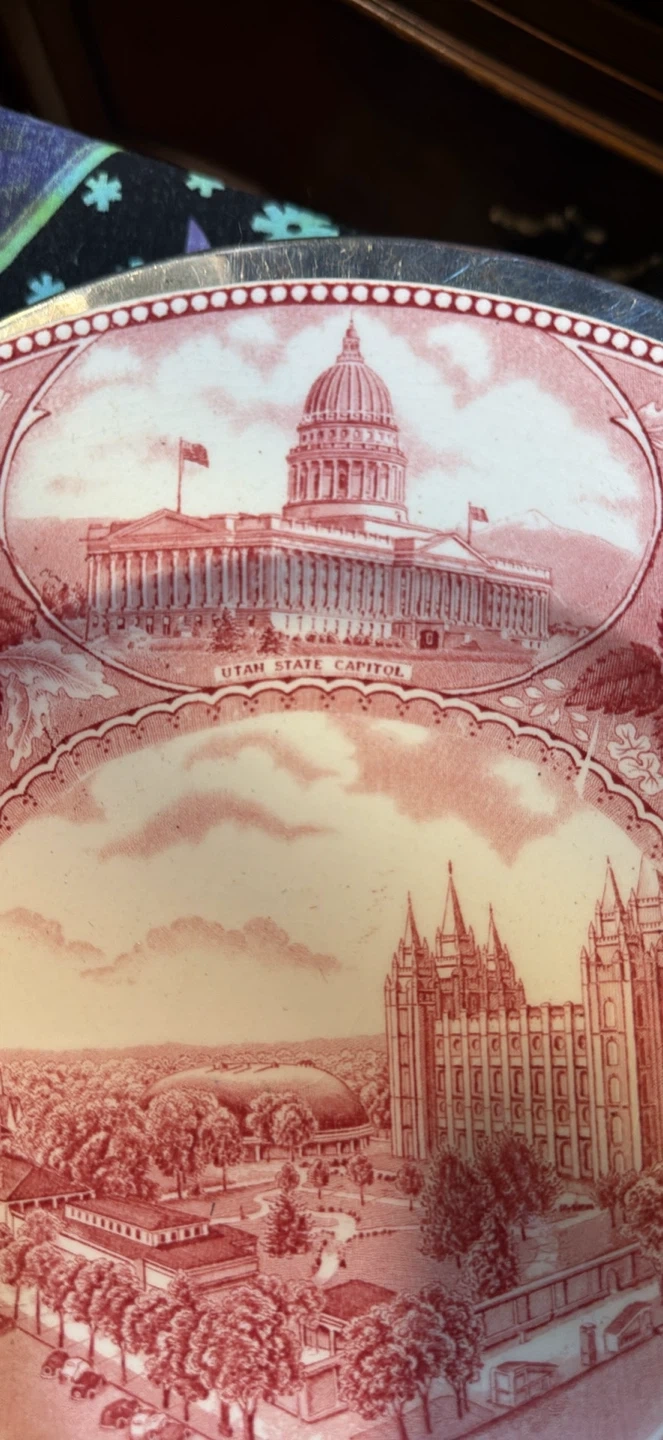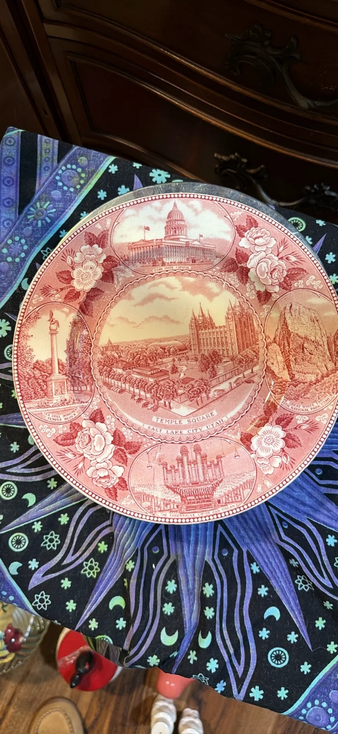 This is a decorative plate featuring scenes from Temple Square in Salt Lake City, Utah. It depicts the Tabernacle Choir and Organ, the Utah State Capitol, and other landmarks. This plate is made of Old English Staffordshire Ware.