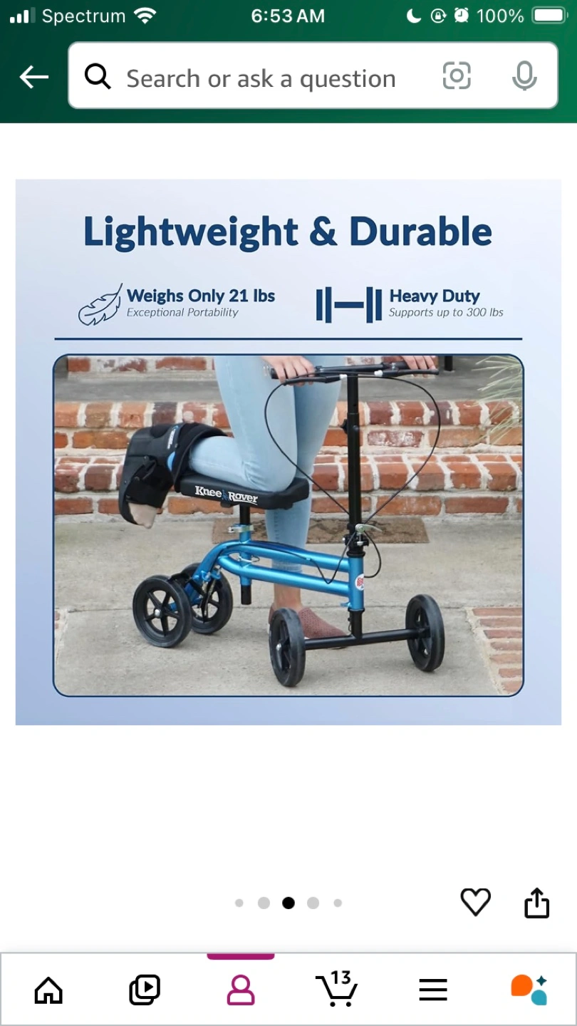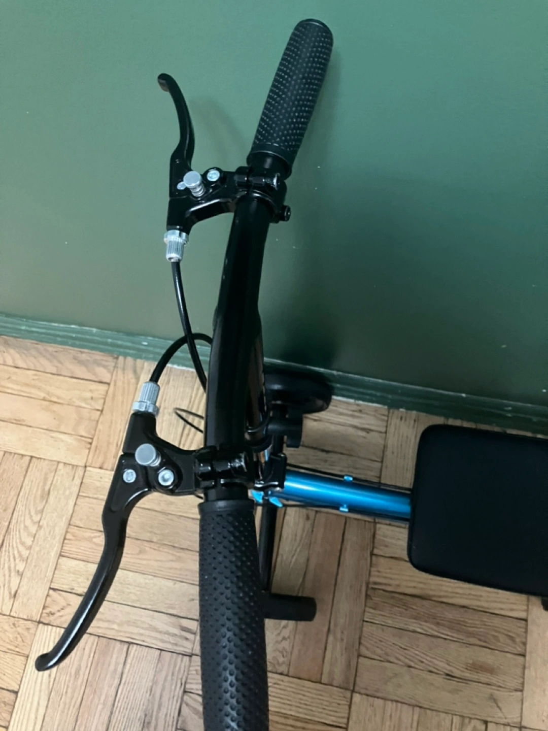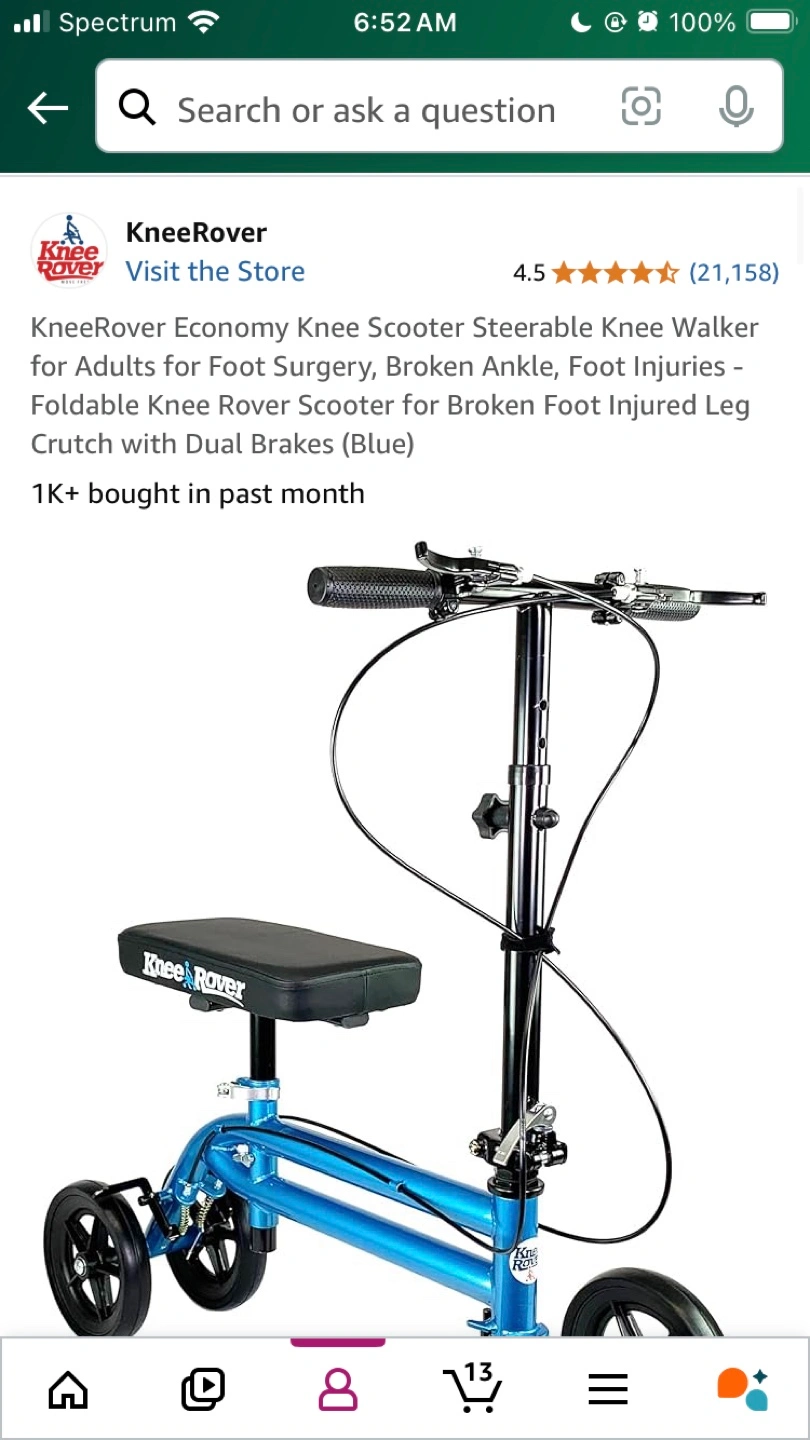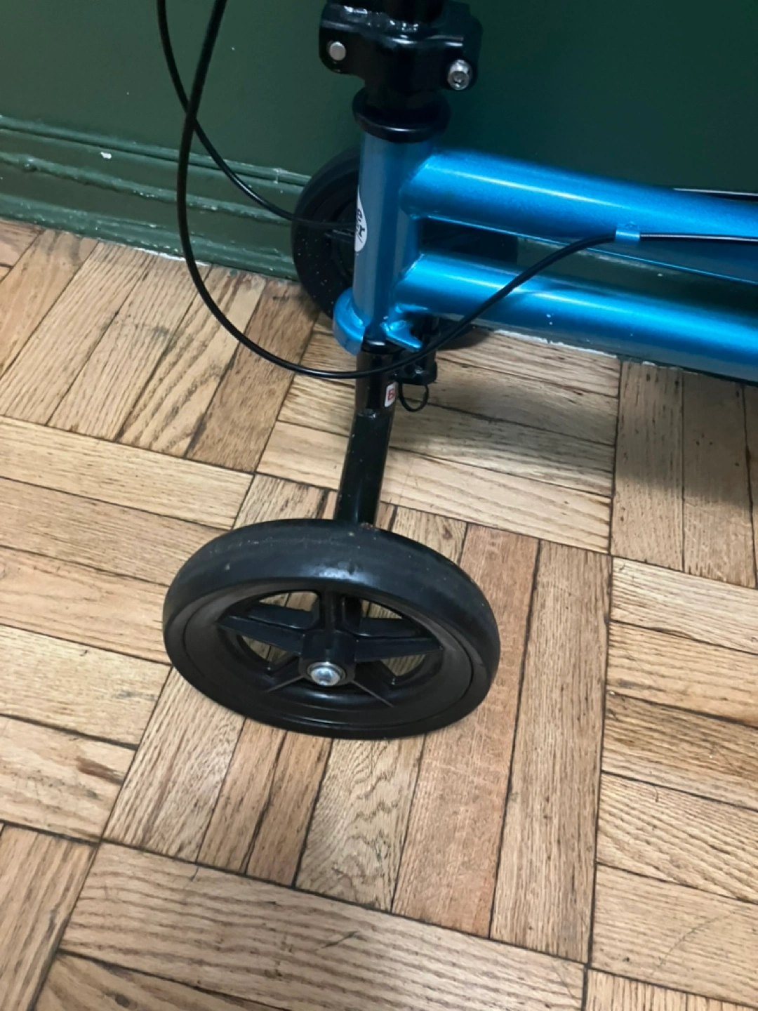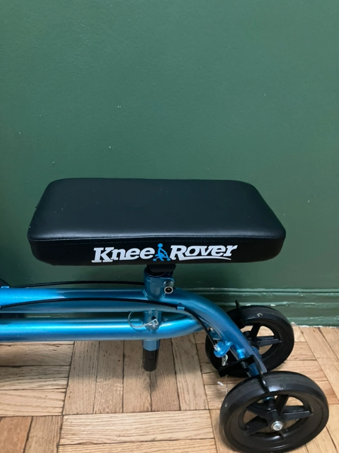 BARELY USED - LIKE NEW!! Blue knee scooter with black wheels and seat. Dual brakes. Foldable. Fabulous alternative to crutches. Retail $116