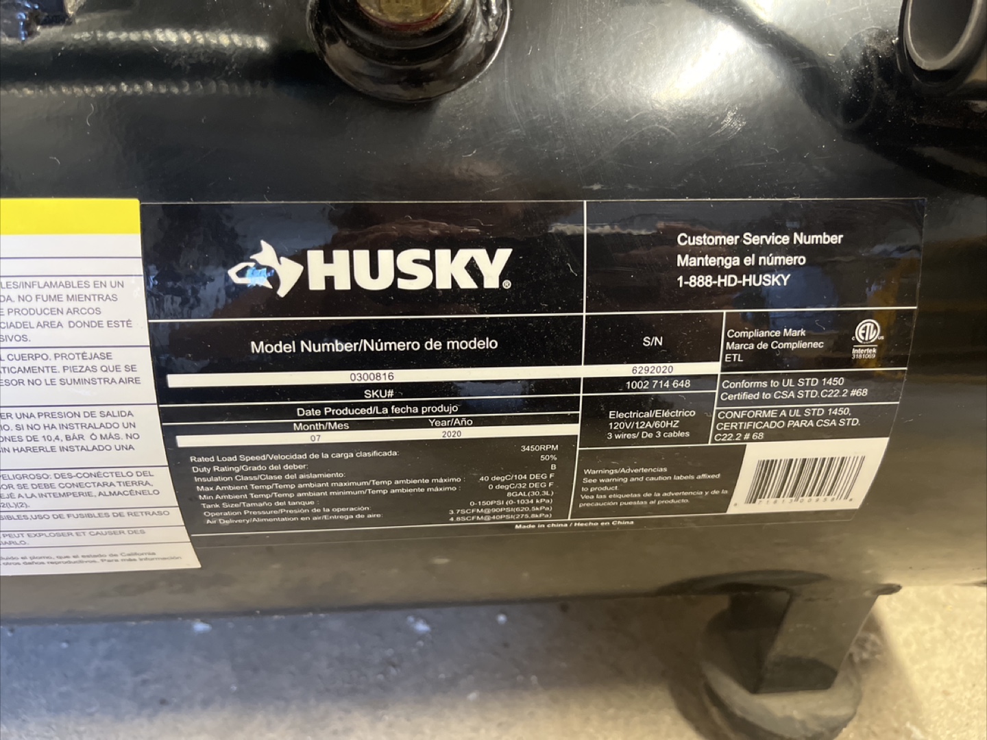 Selling a Husky air compressor, model number 1002 714 648. It's in good working condition and ready to use. Features include a 120V/12A/60Hz electrical connection and 3 wires of 3 cables.
