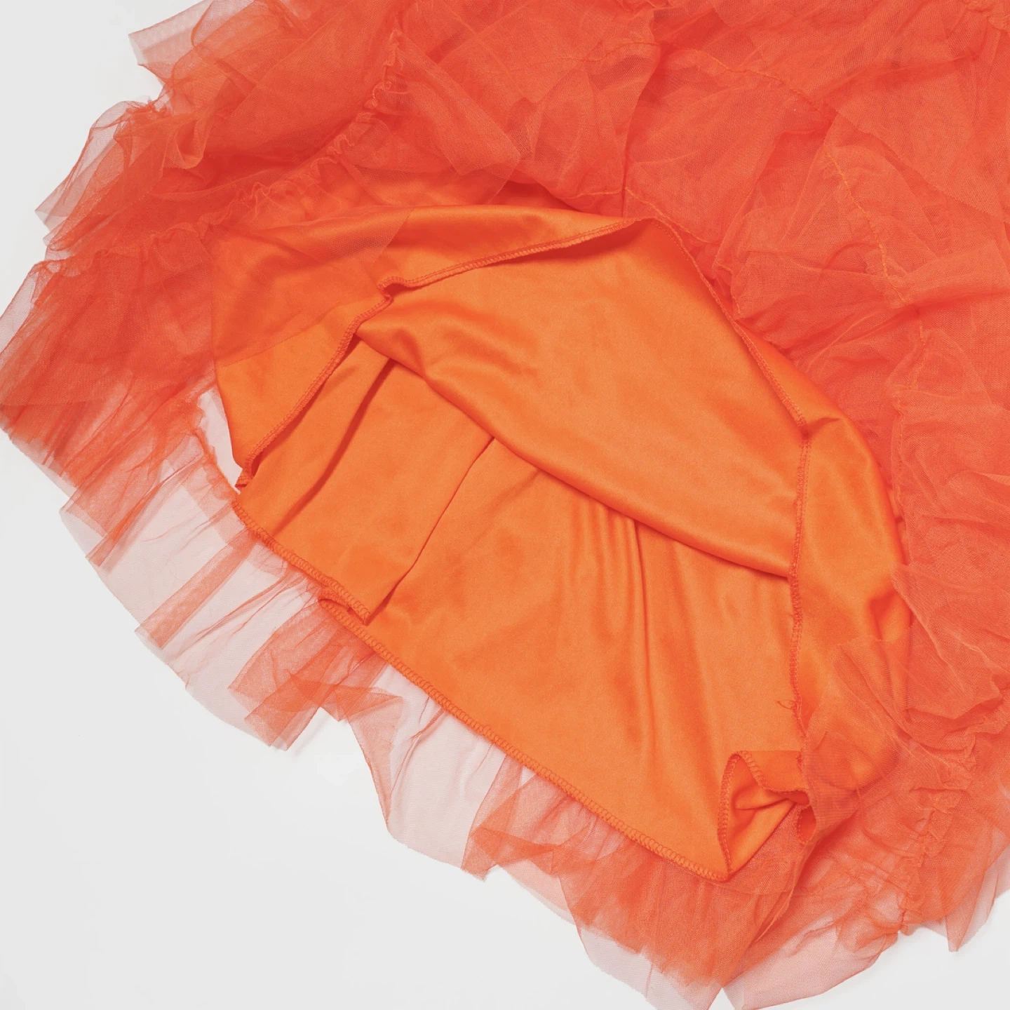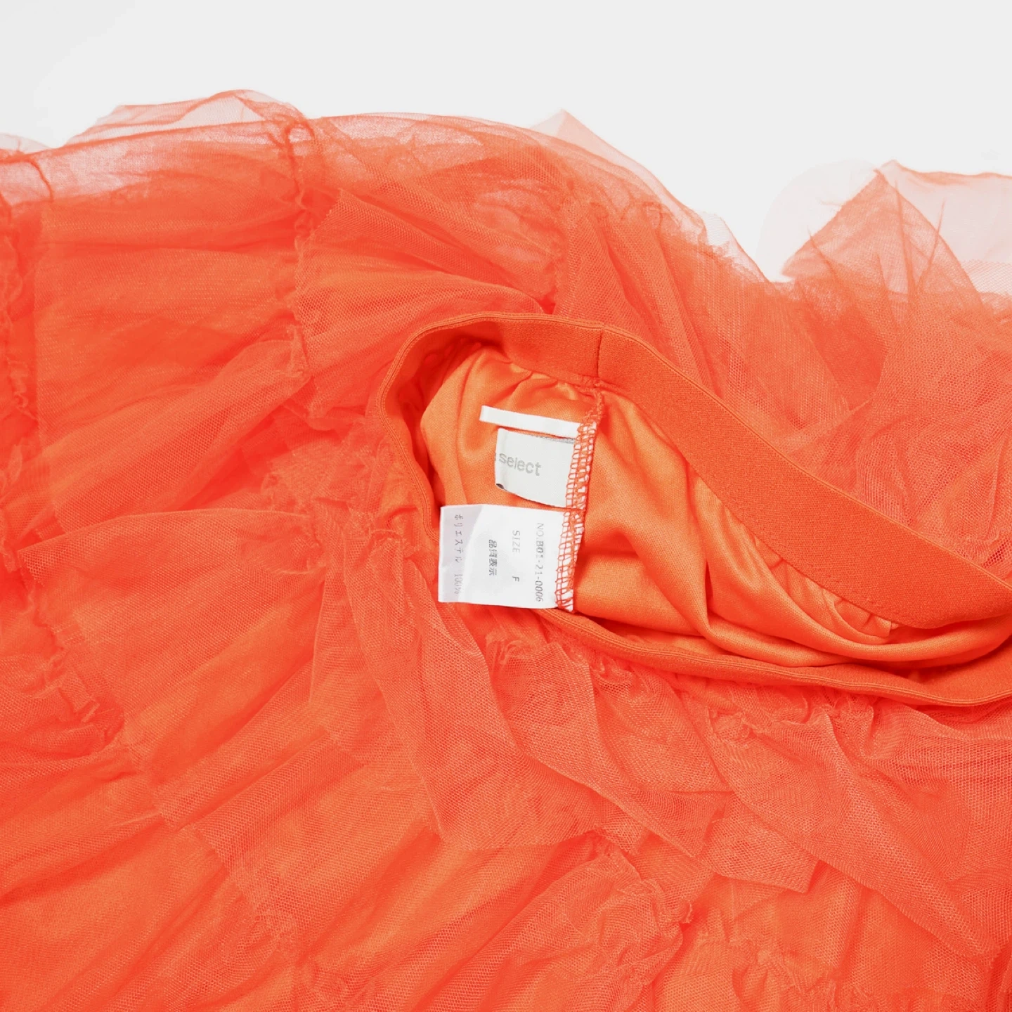 Here's a fun orange skirt with layers of ruffles! It's made of tulle and has a comfortable elastic waistband. The size is marked as Free.