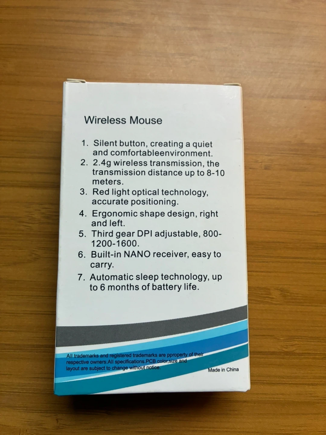 This wireless mouse connects via 2.4g with a transmission distance up to 8-10 meters. It features red light optical technology, ergonomic shape, and adjustable DPI (800-1600). Includes a NANO receiver and has automatic sleep technology for up to 6 months of battery life.