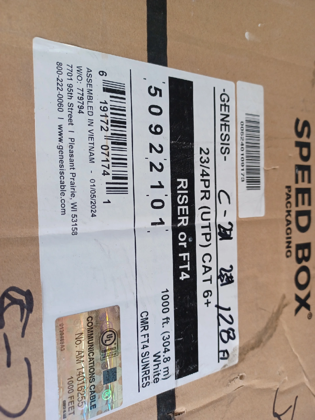 Selling a box of Genesis 23/4PR (UTP) CAT 6+ Riser or FT4 cable. It's a 116 ft white cable. Assembled in Vietnam on 2024 It is a CMR FT4 SUNRES communications cable.