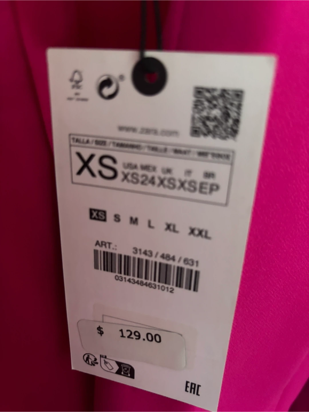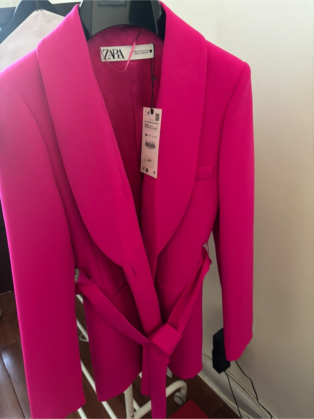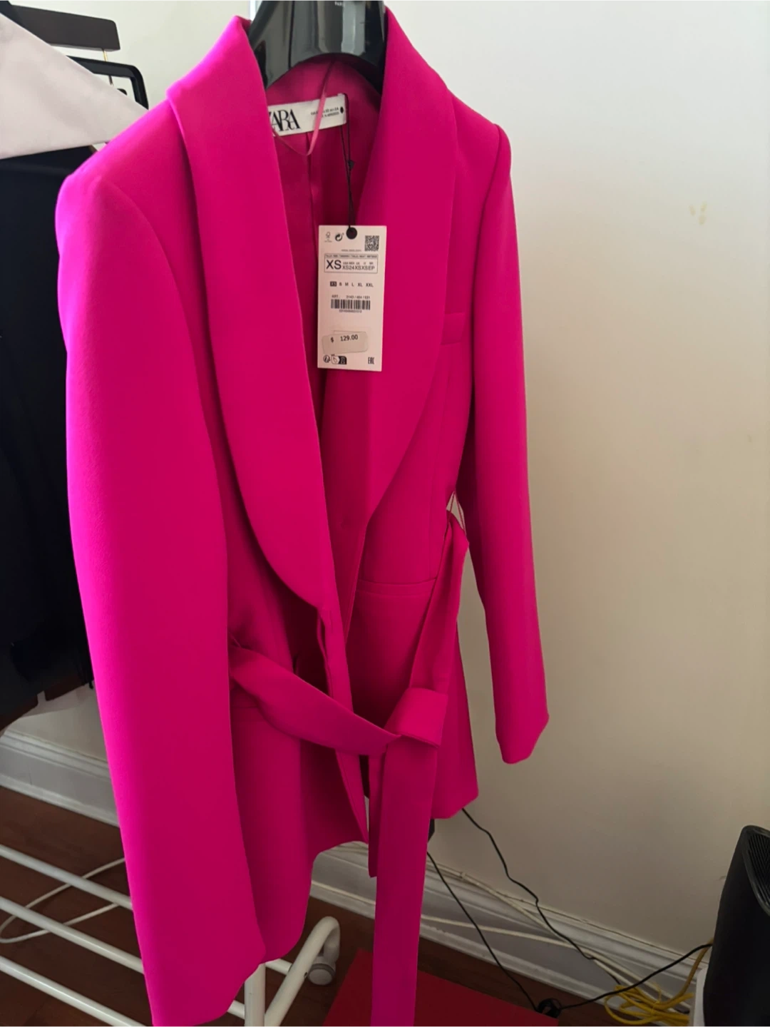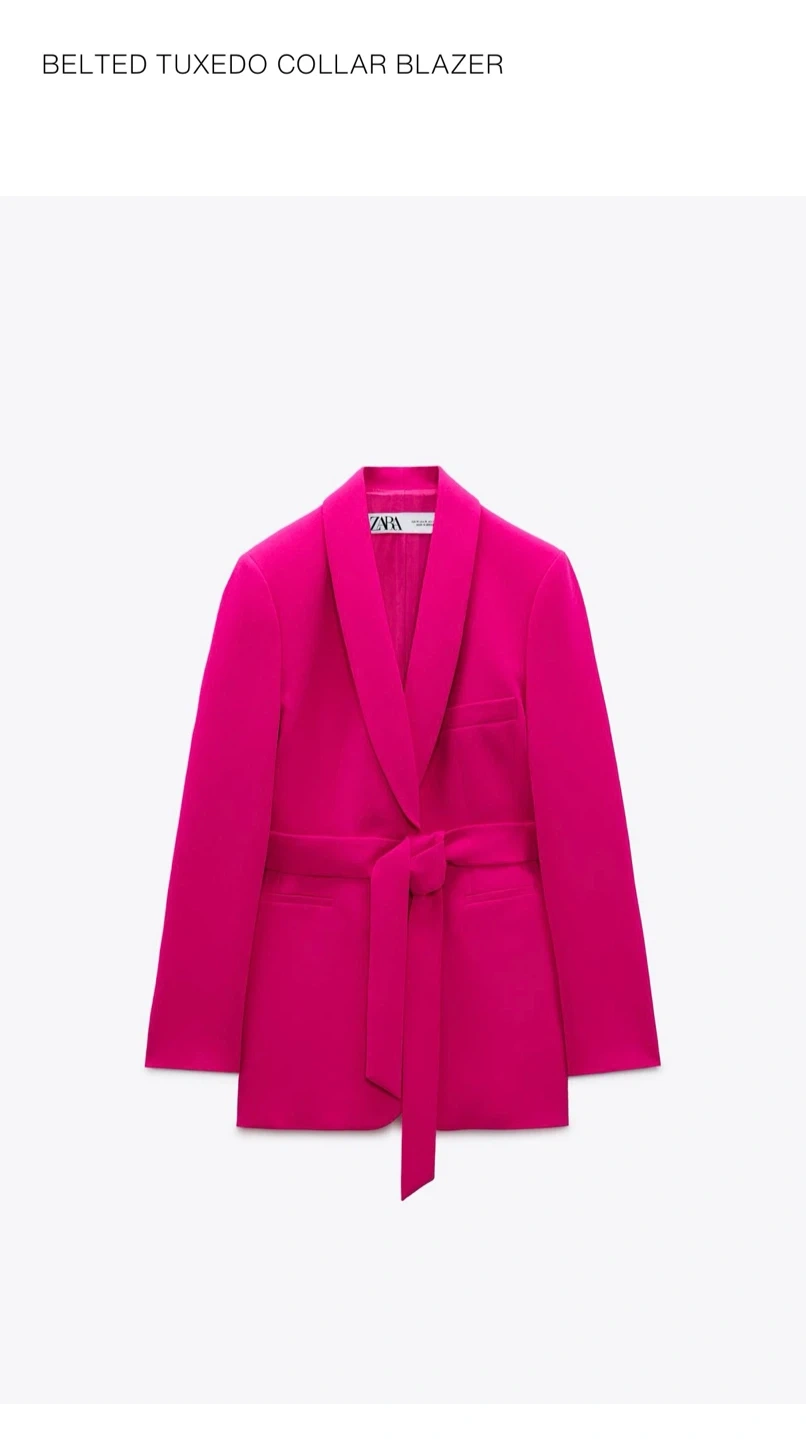 This is a ZARA blazer in a bright pink color. It's a size XS and includes a matching belt. Original price was $129.00.