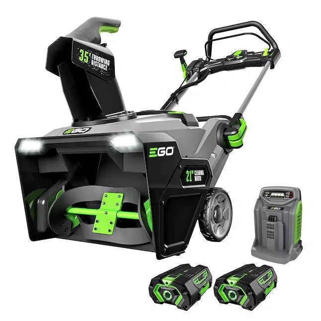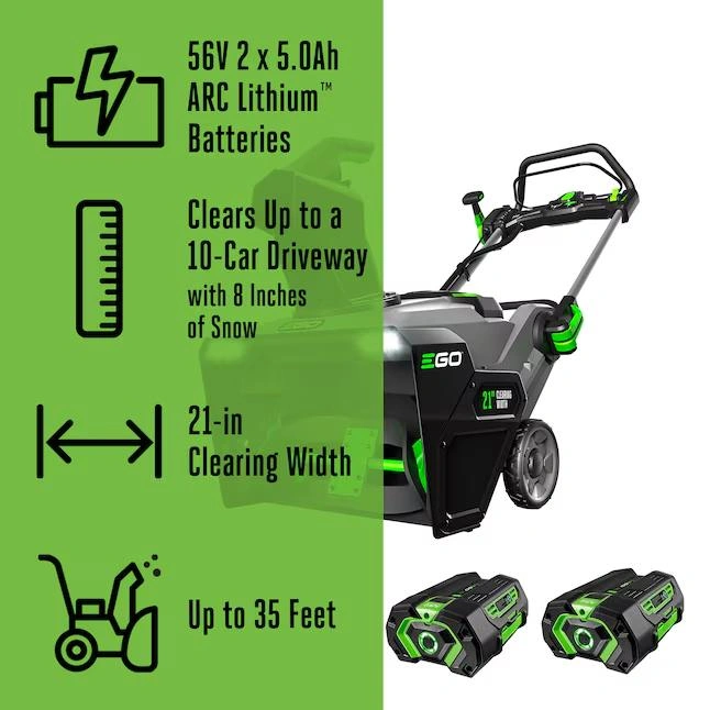 65The EGO POWER+ Snow Blower delivers the power and performance of gas-powered snow blowers without the noise. Featuring Peak Power™ technology, this cordless snow blower combines the power of any two EGO 56V ARC Lithium™ batteries for the performance to clear even the heaviest, wettest snow. Built with a high-efficiency brushless motor and a 21-inch clearing width, this electric snow blower can handle what the city snowplow leaves behind—and throws it up to 35 feet. Easily adjust the variable-speed auger and remote chute adjustment to control how far the snow is thrown. The EGO snow blower kit includes two (2) 5.0Ah batteries and the Rapid Charger. Clears a 10-car driveway with 8 inches of snow on a single charge with the two included 5.0Ah ARC Lithium™ batteries. Two bright LED headlights for increased visibility for nighttime snow removal. Weather-resistant (IPX4). Quick-fold handle for compact storage.