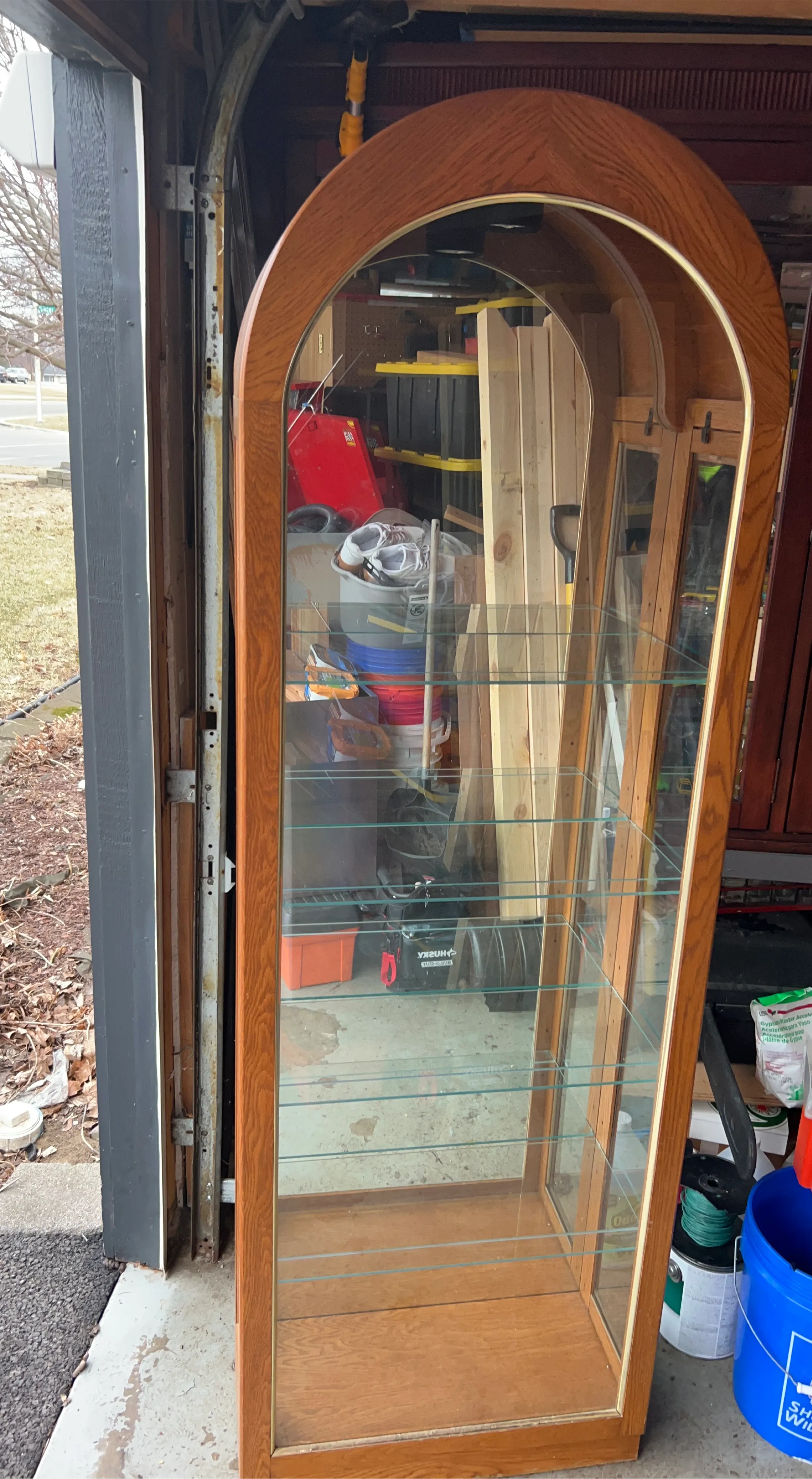 This display cabinet features a warm oak wood frame with a curved top and clear glass doors and shelves. It's perfect for showcasing collectibles or decorative items. The cabinet has multiple glass shelves for ample display space.