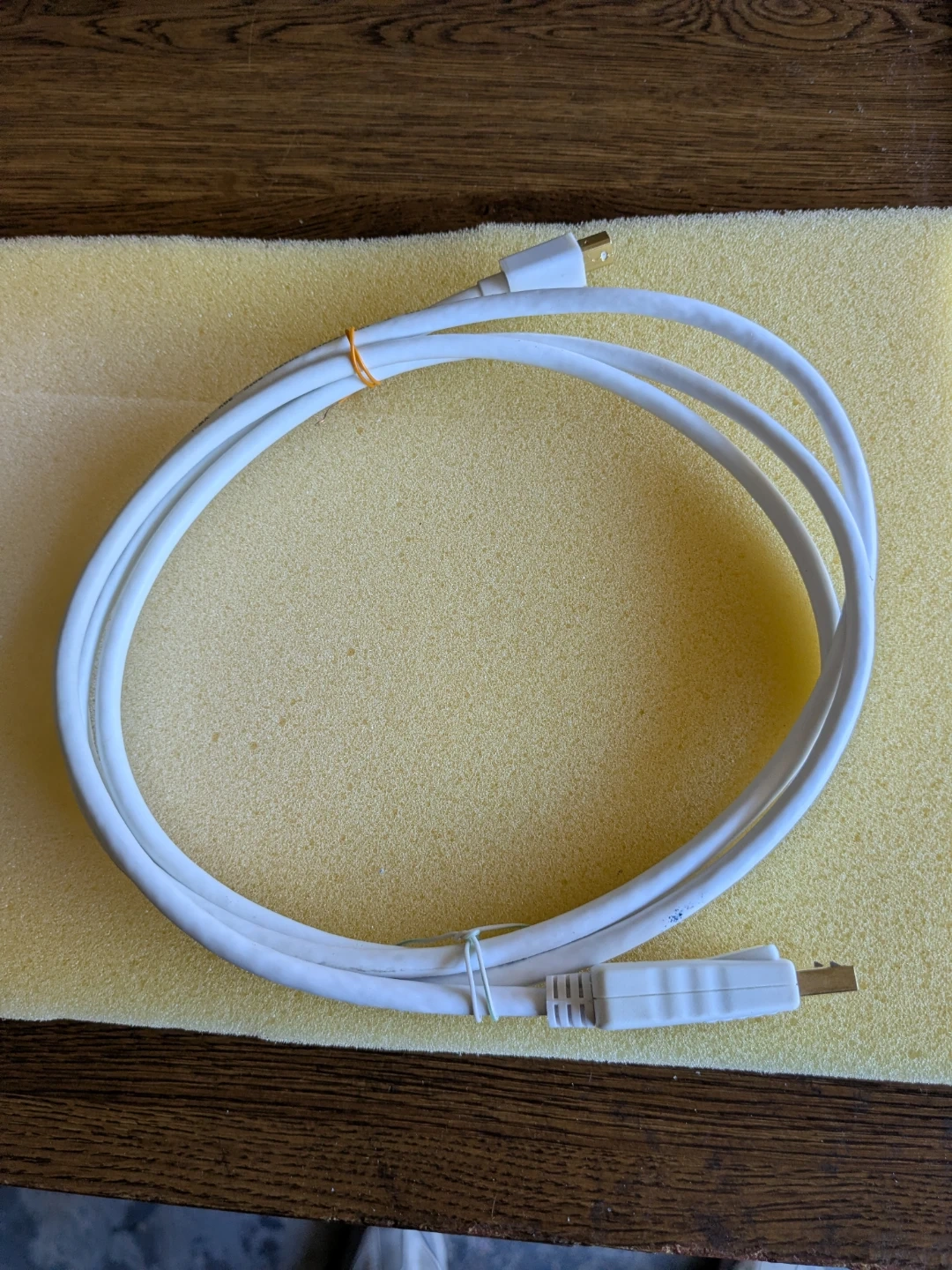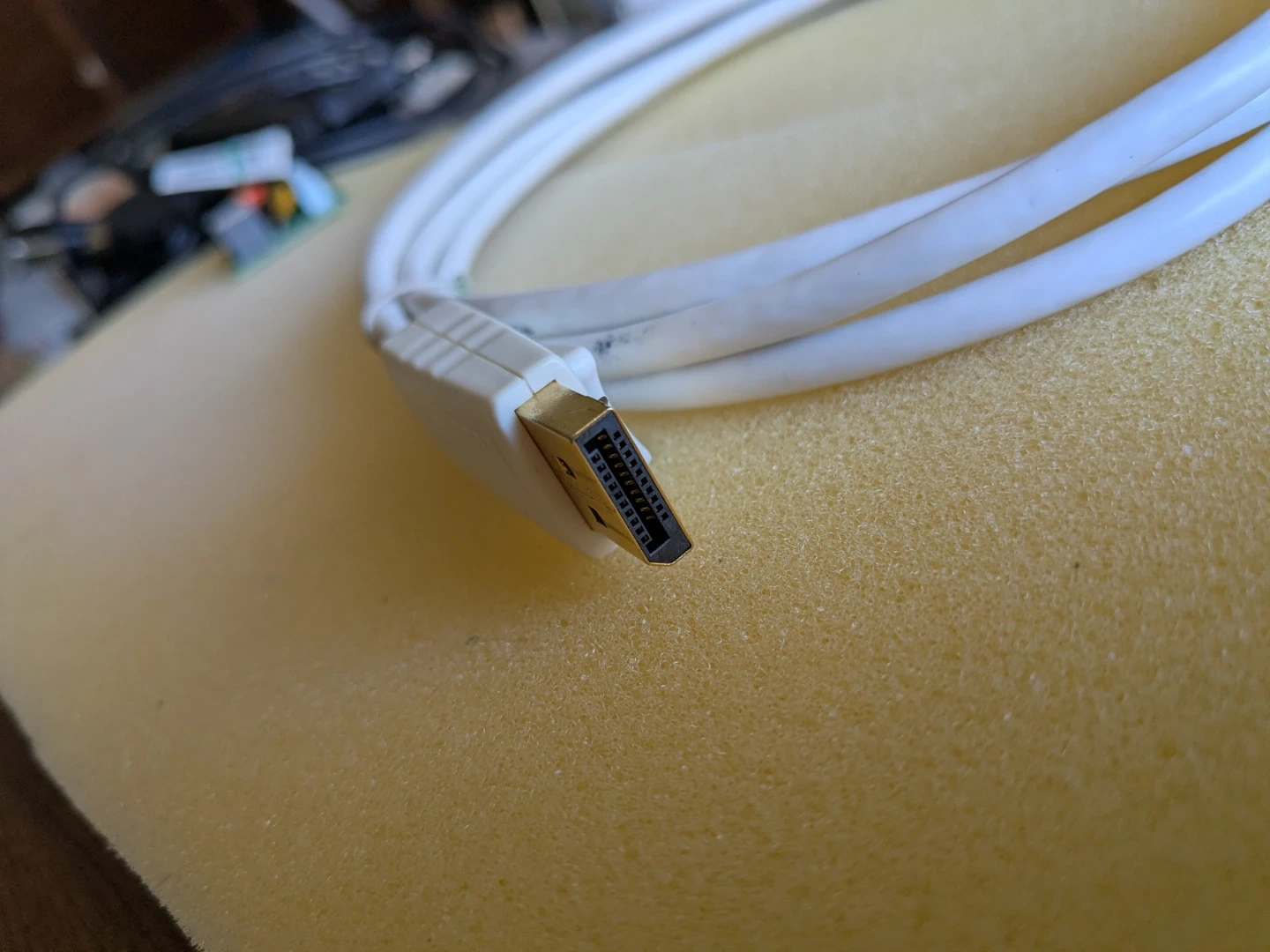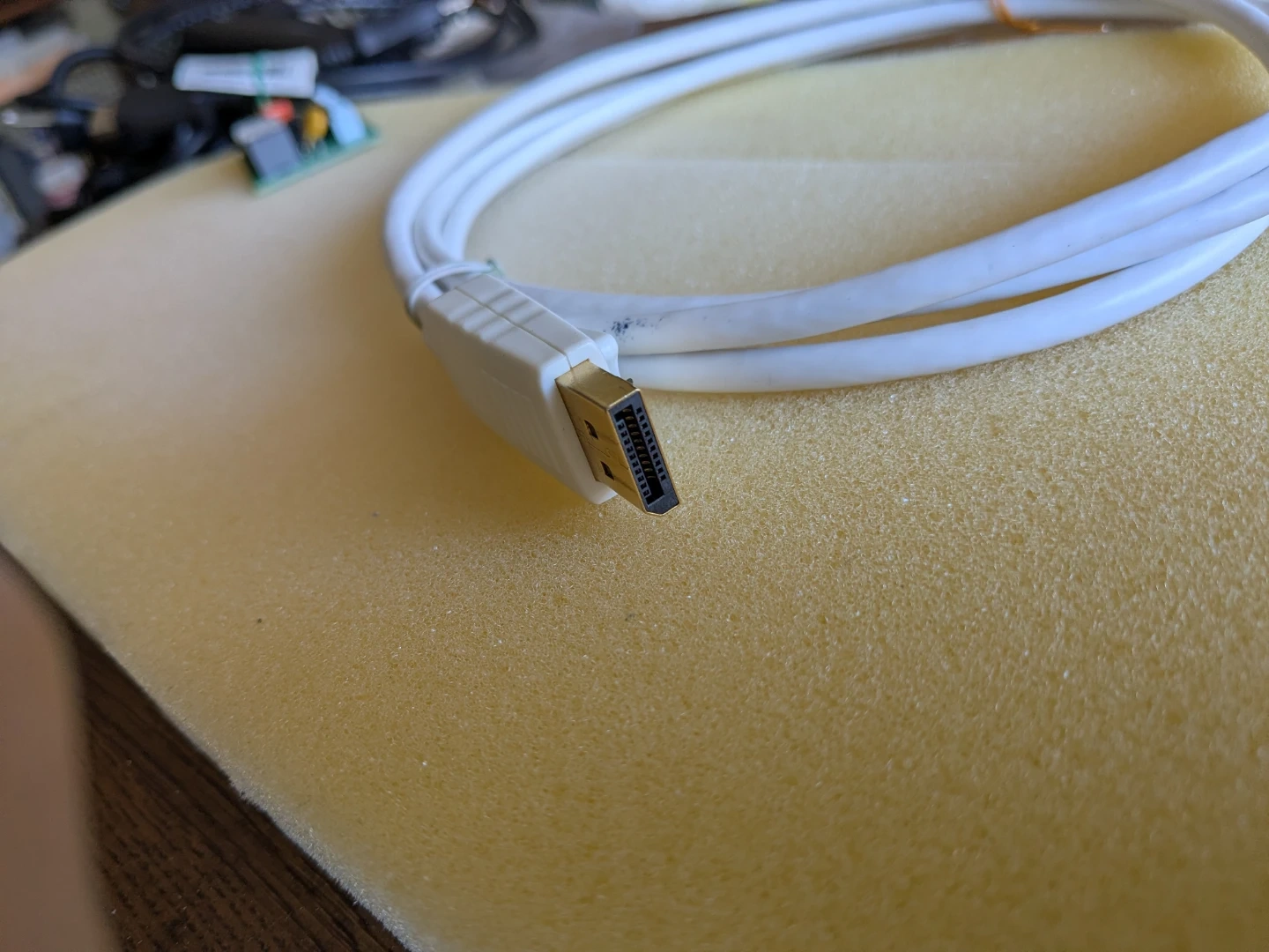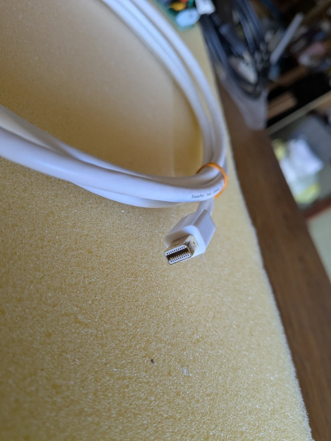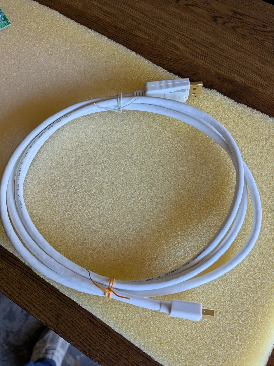 This white cable connects a DisplayPort source to a Mini DisplayPort monitor. It's about 6 feet long. Offers high-resolution video and audio transmission.