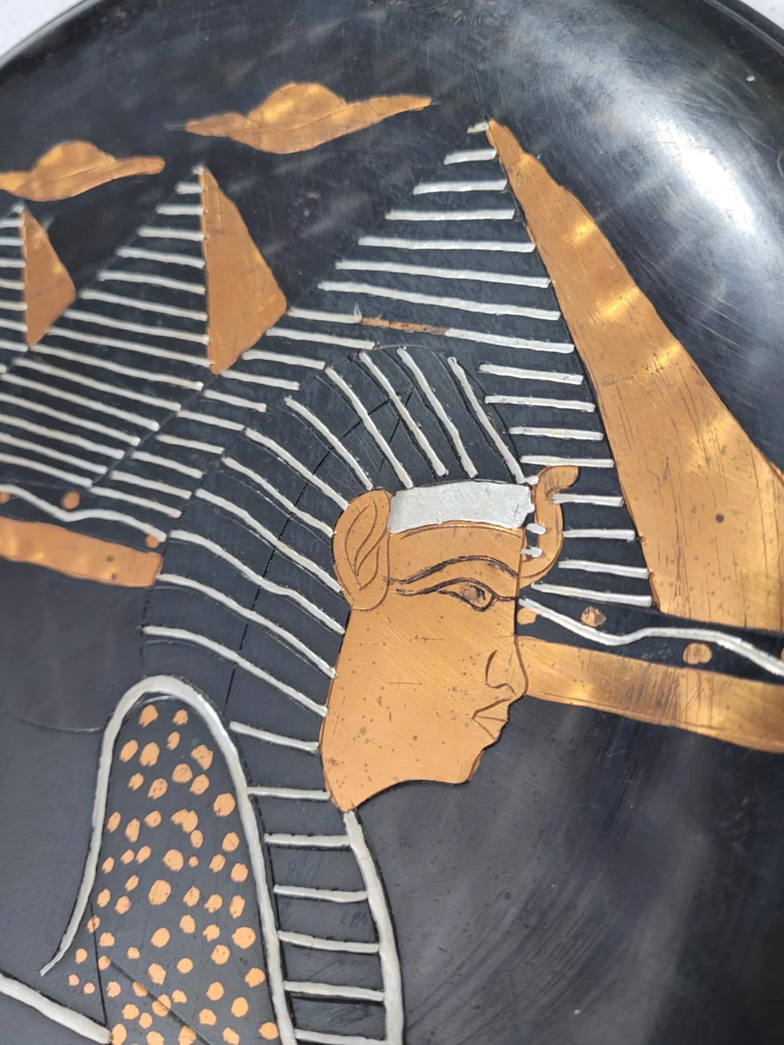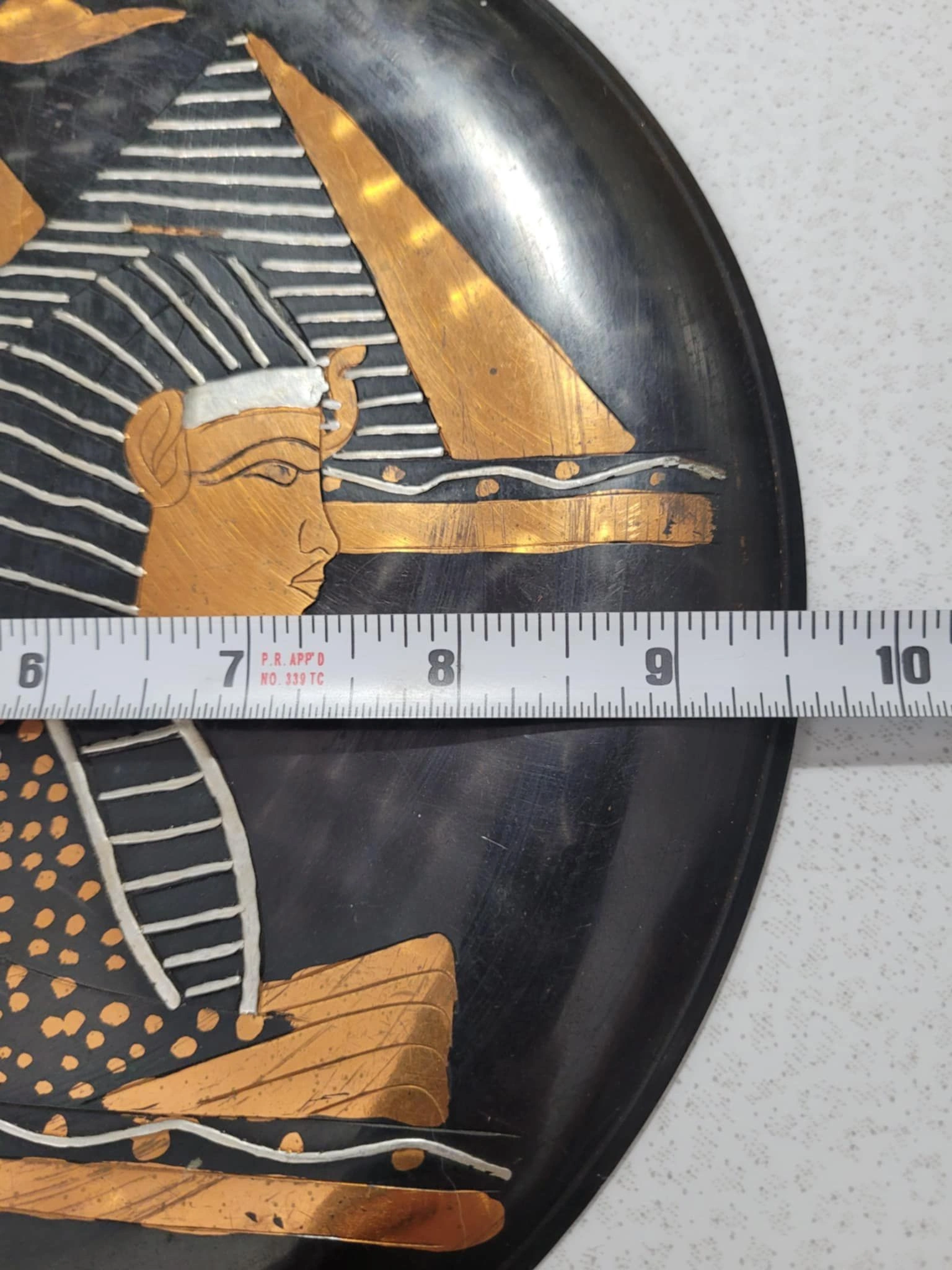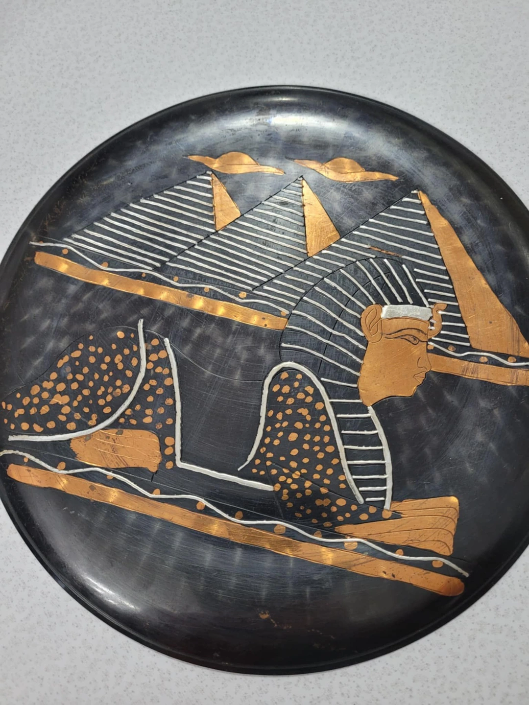 81Vintage Hand Carved Etched Egyptian Sphinx Pyramid Copper Metal 9.5 Inch Round Circle Plate!!! Dominant Color: Black copper gold Material: Metal