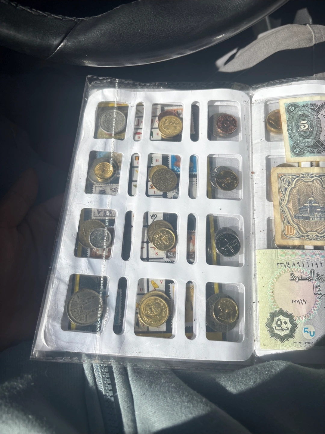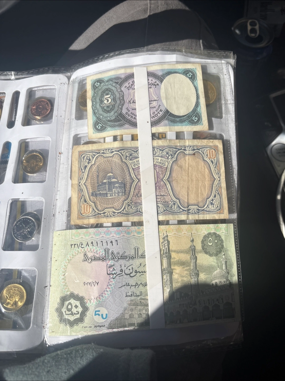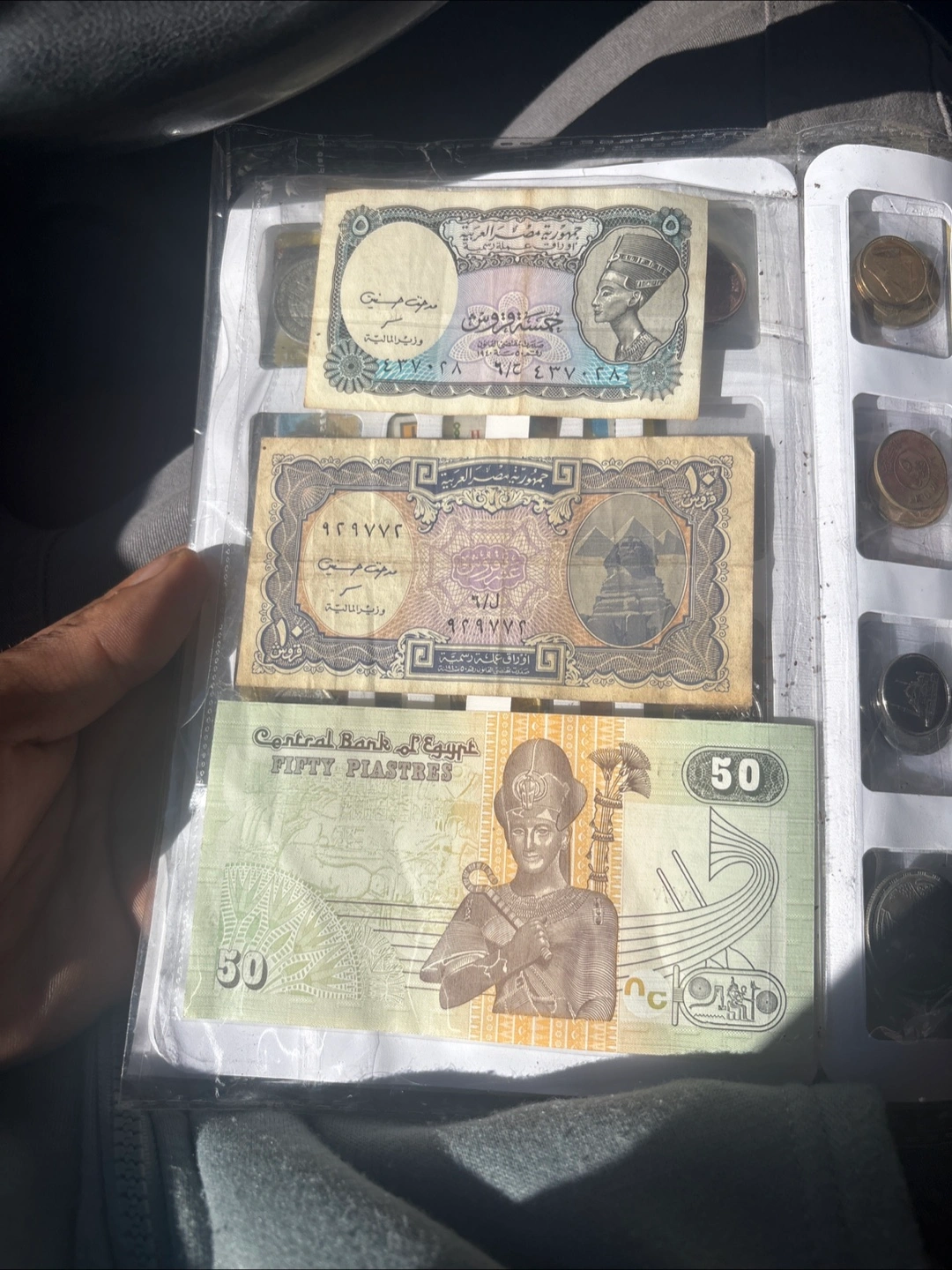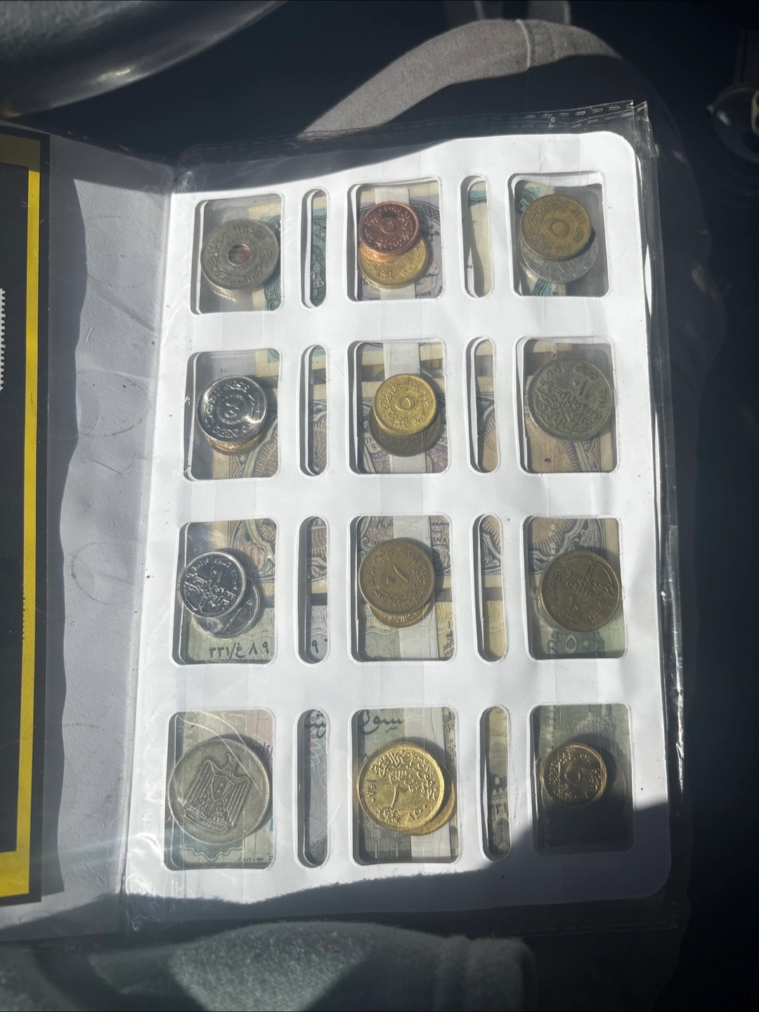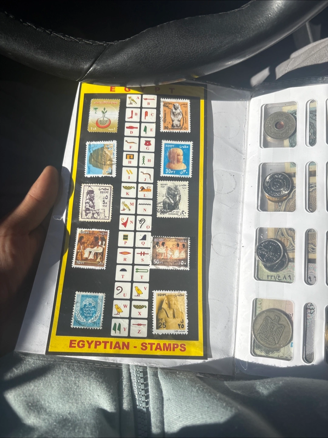 Here's a collection of Egyptian stamps and coins in a display case. It includes various denominations and designs. Perfect for collectors!