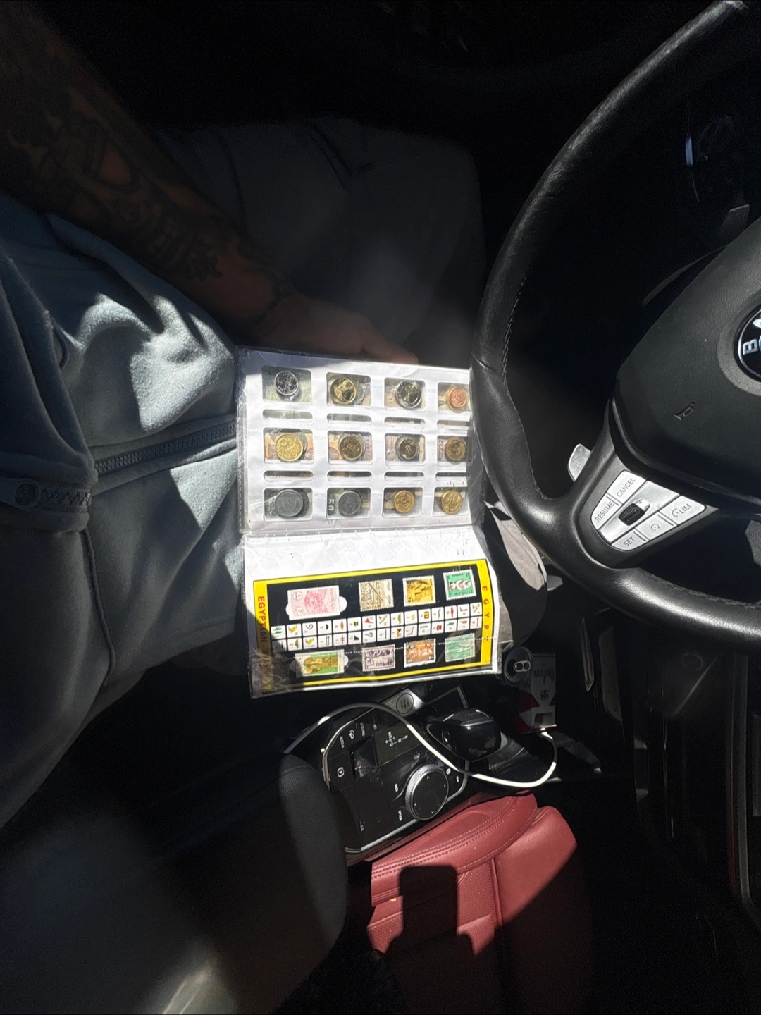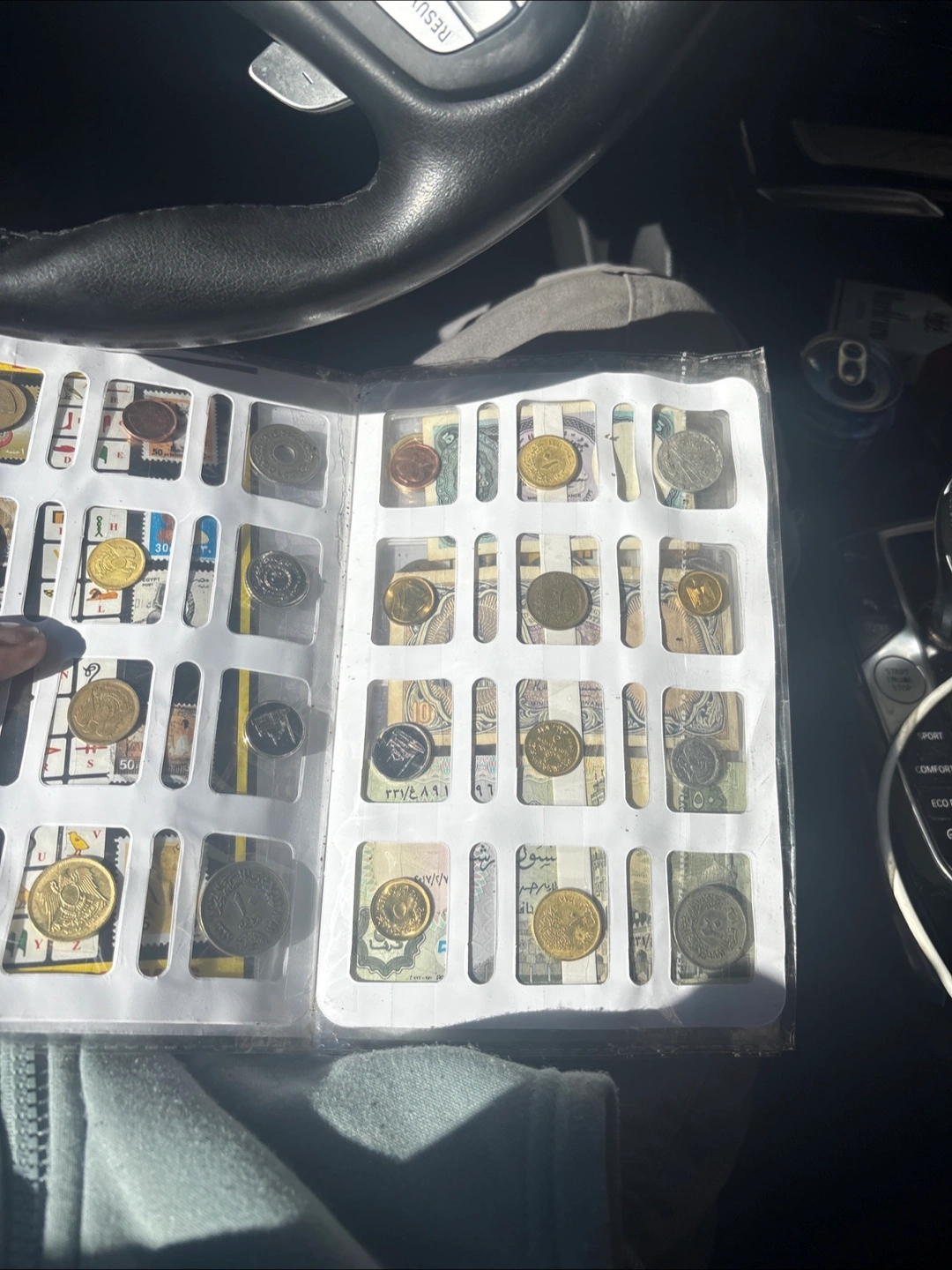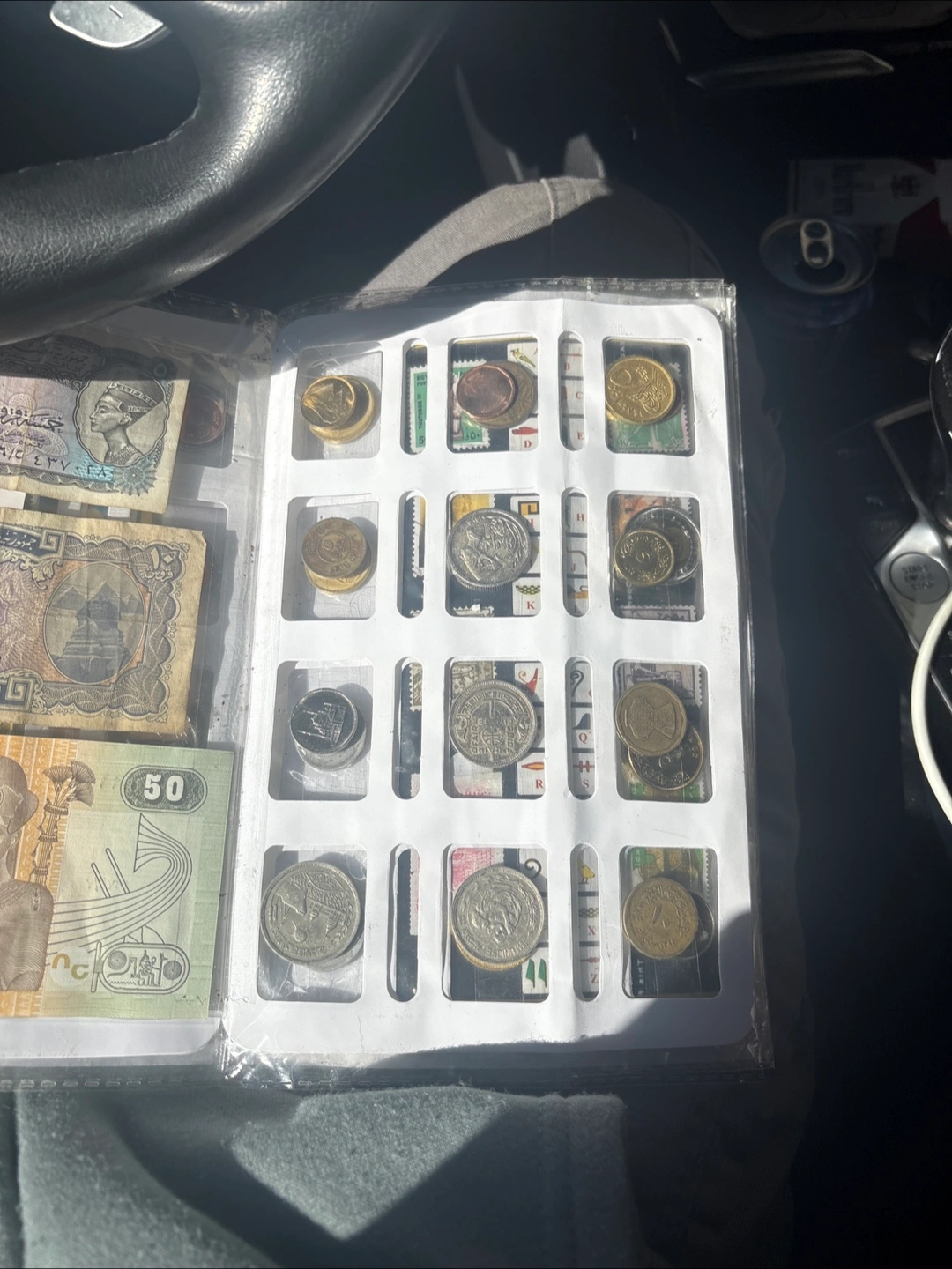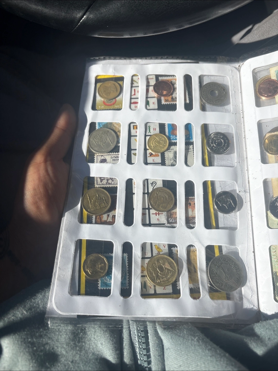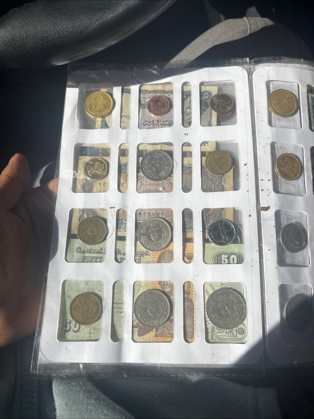 Here's a collection of Egyptian stamps and coins in a display case. It includes various denominations and designs. Perfect for collectors!