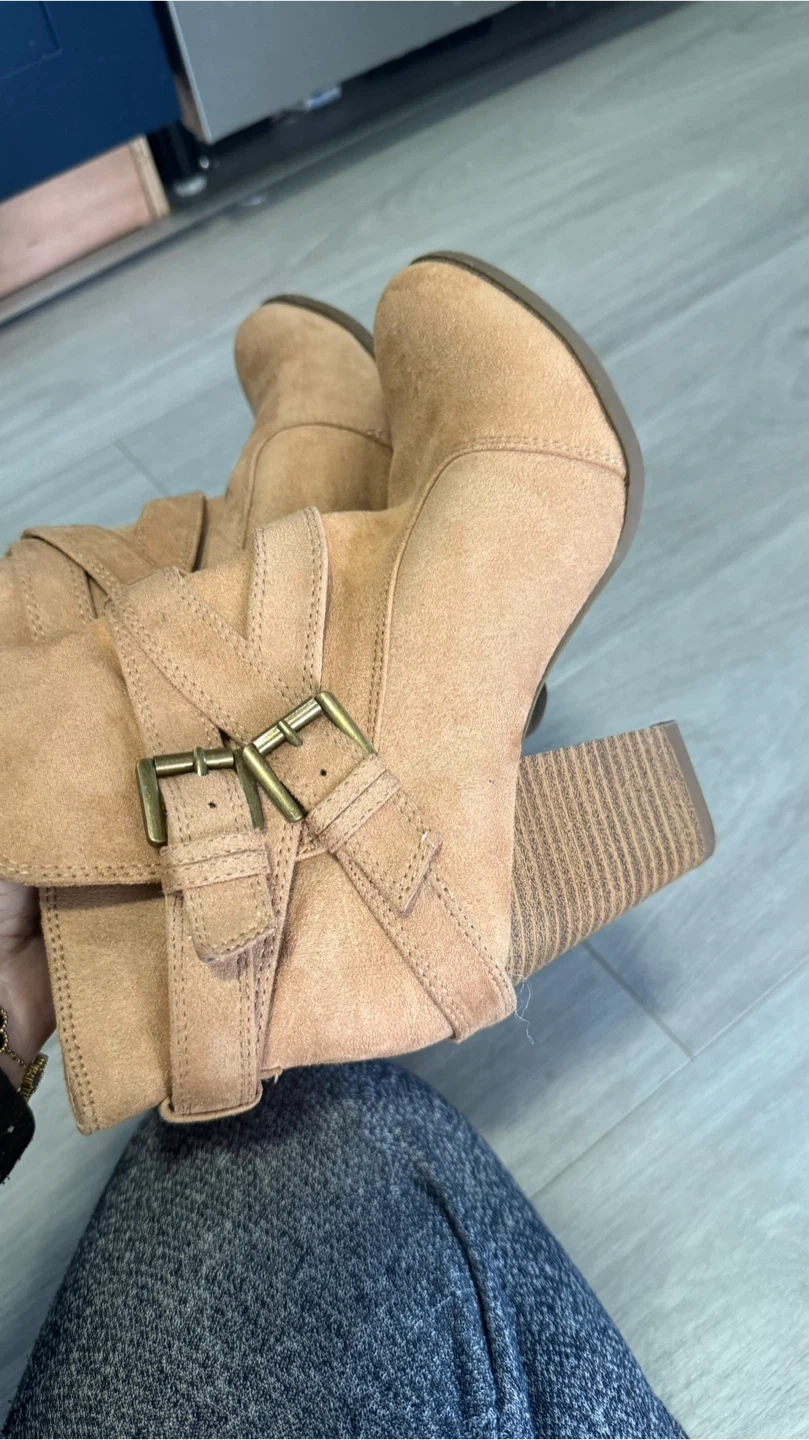 These tan suede ankle boots feature decorative buckles and straps. They have a comfortable heel height. Material is synthetic.