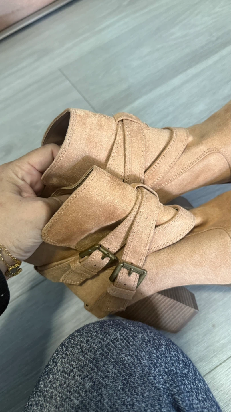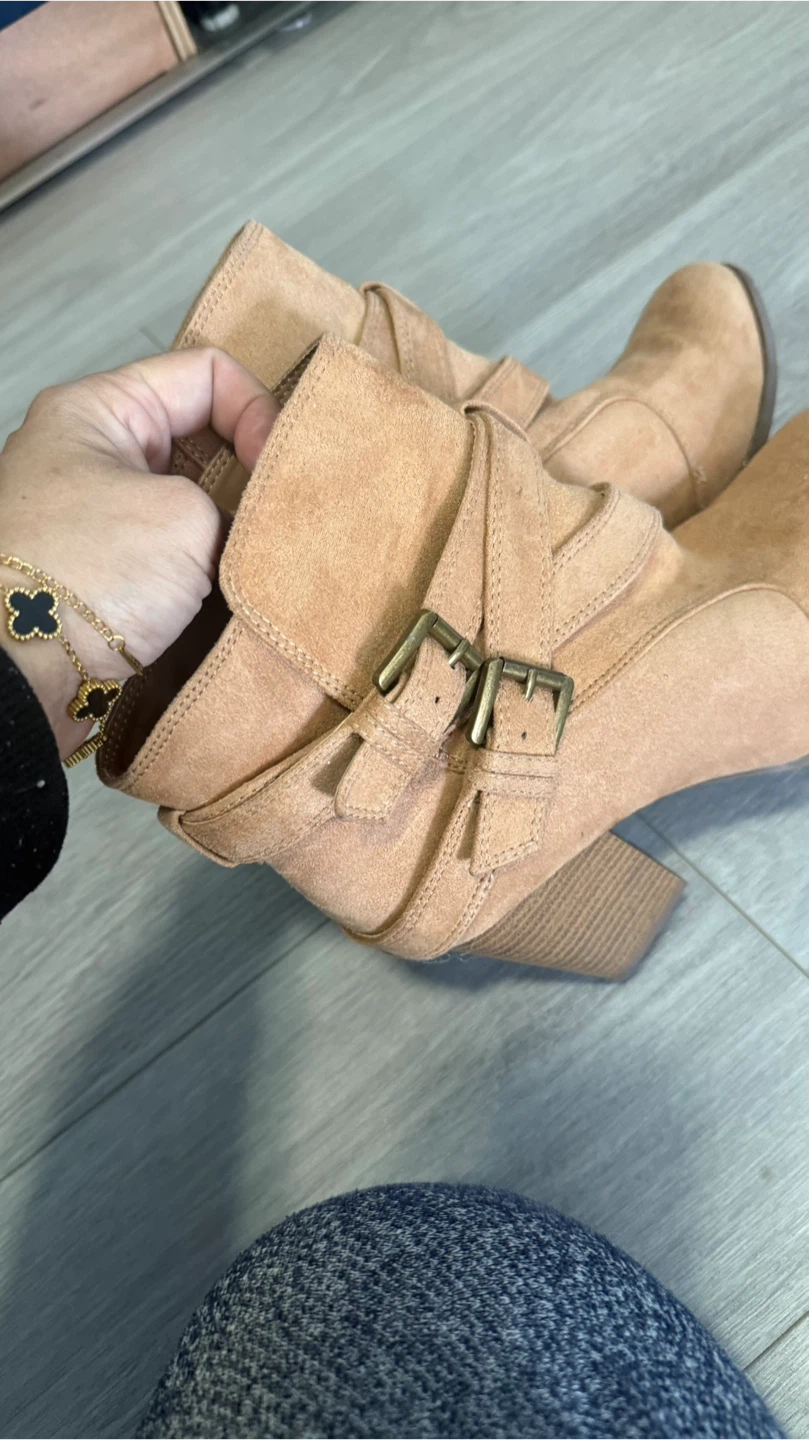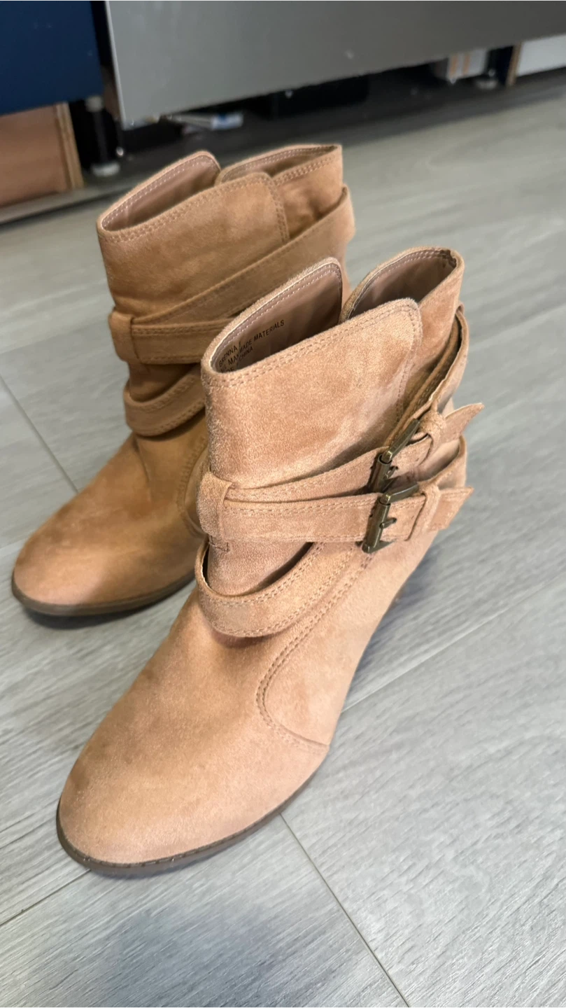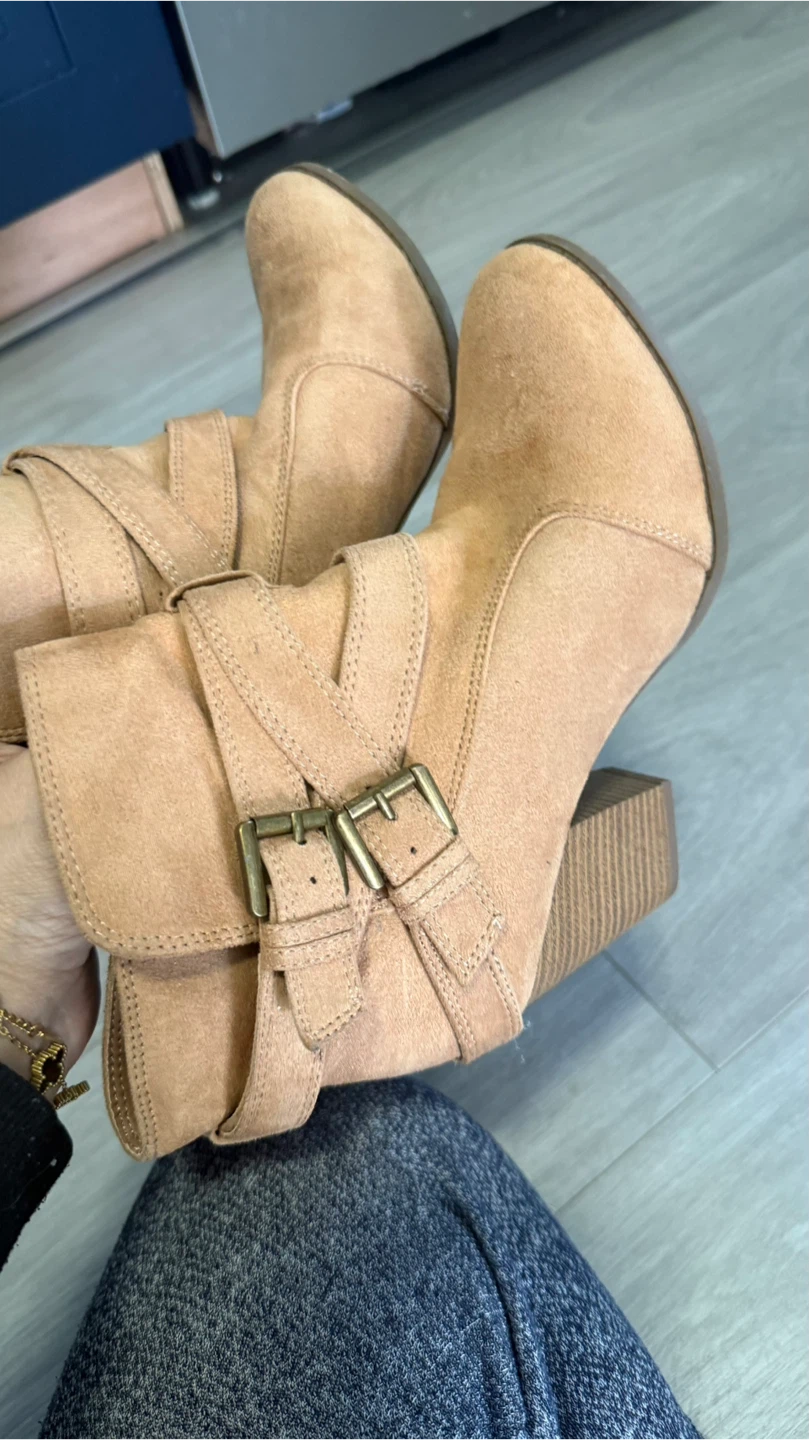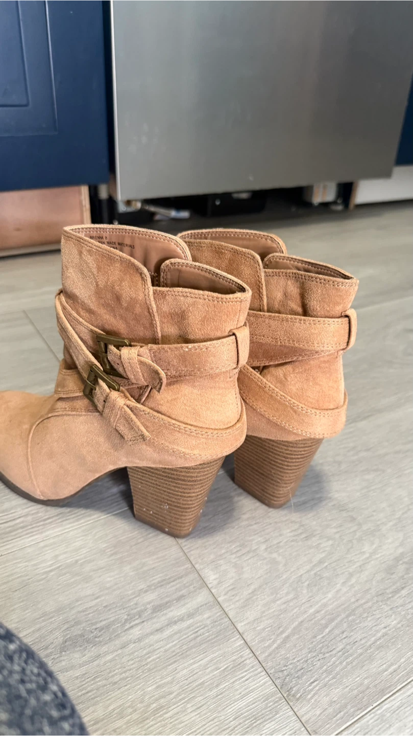 These tan suede ankle boots feature decorative buckles and straps. They have a comfortable heel height. Material is synthetic.