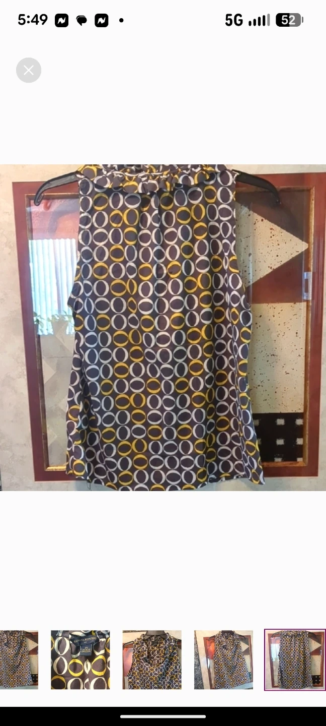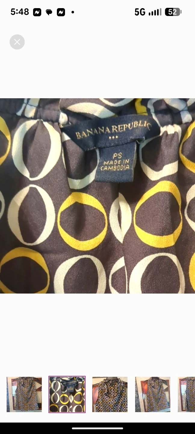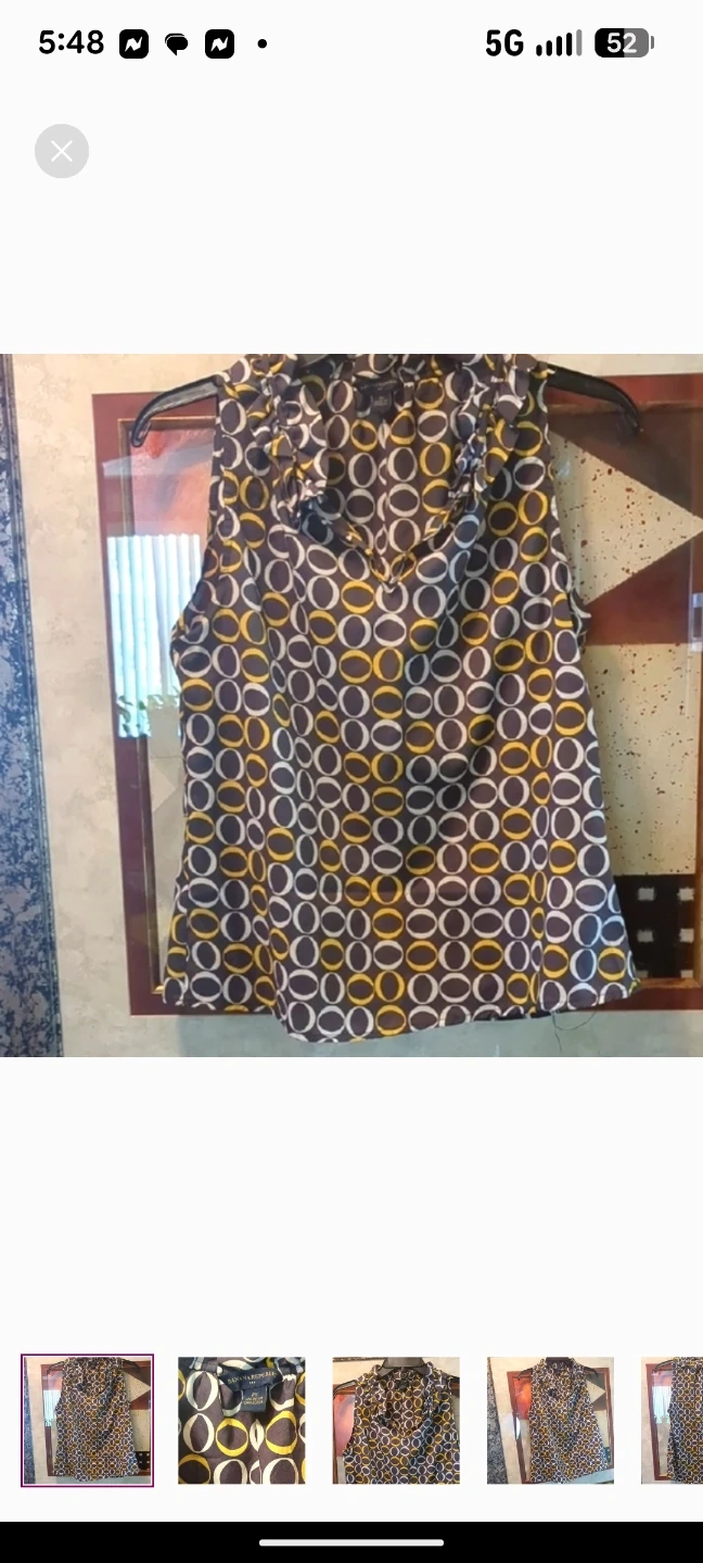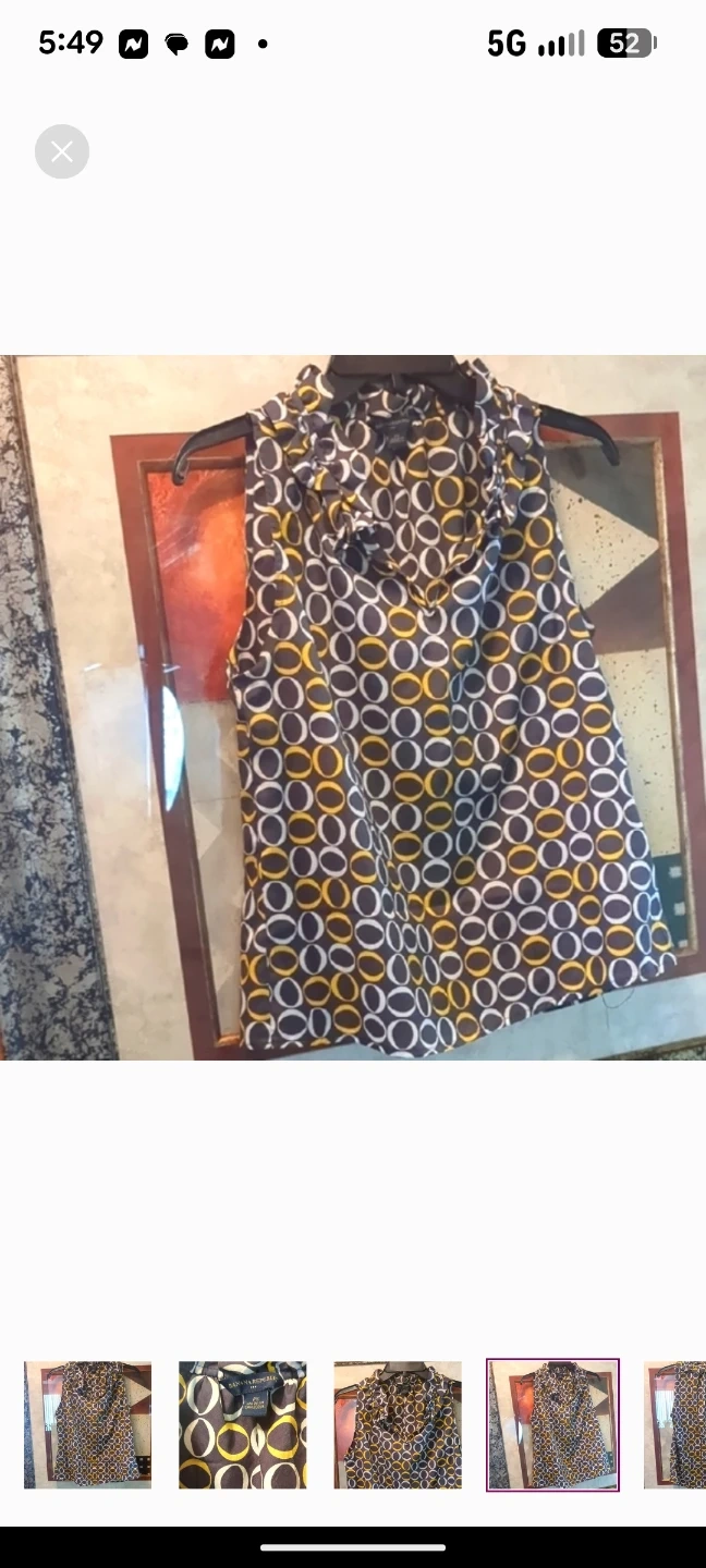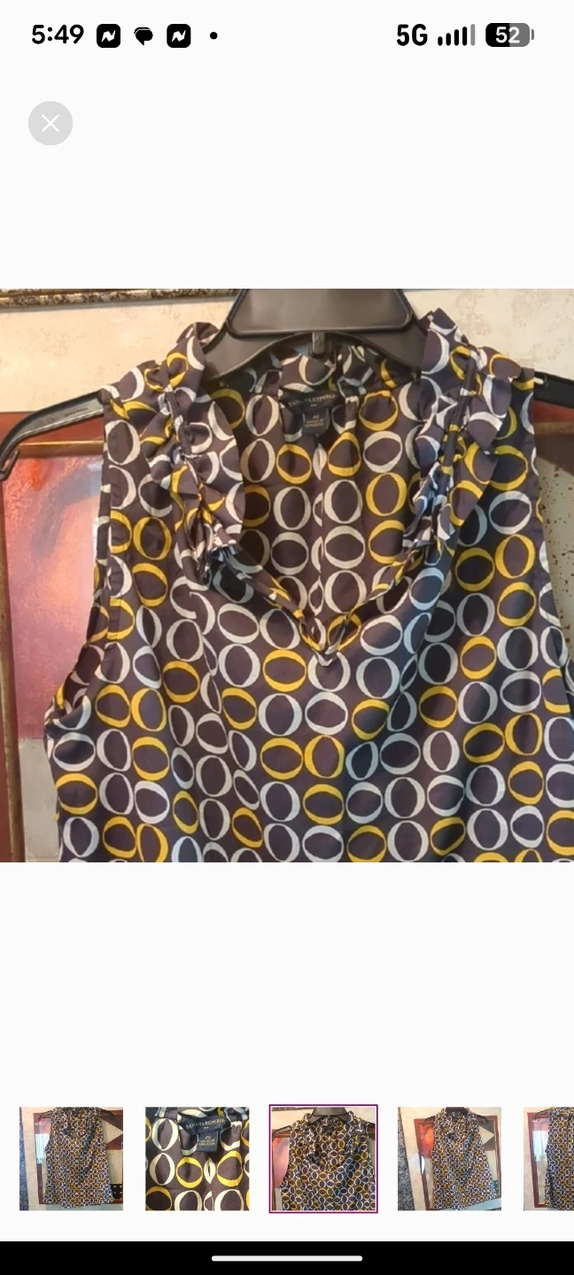 This chic Banana Republic blouse features a sleeveless design with delicate ruffles, highlighted in a sophisticated gray and yellow palette. The structured fabric ensures a flattering fit, making it a versatile addition to any wardrobe.