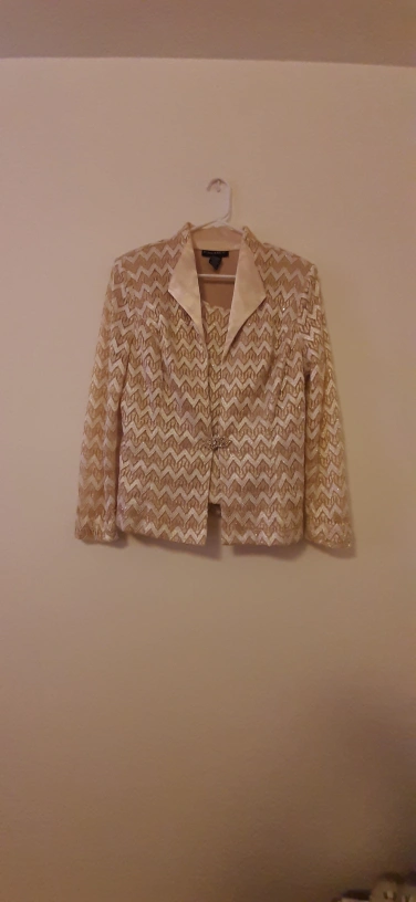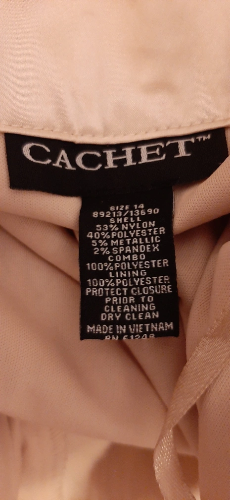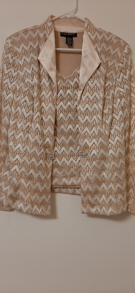 Selling a Cachet 2-piece suit in size 14. The suit is made of 53% nylon, 40% polyester, 5% metallic, and 2% spandex. The lining is 100% polyester. It's in great condition and ready for a new home!