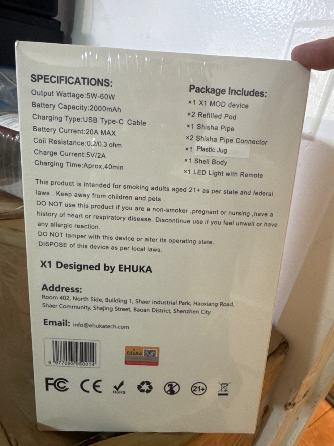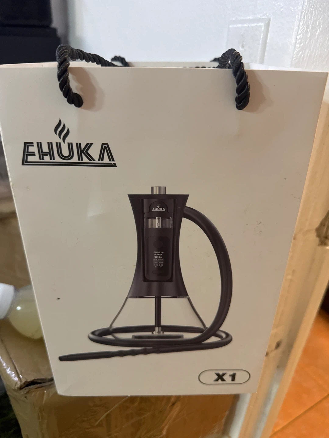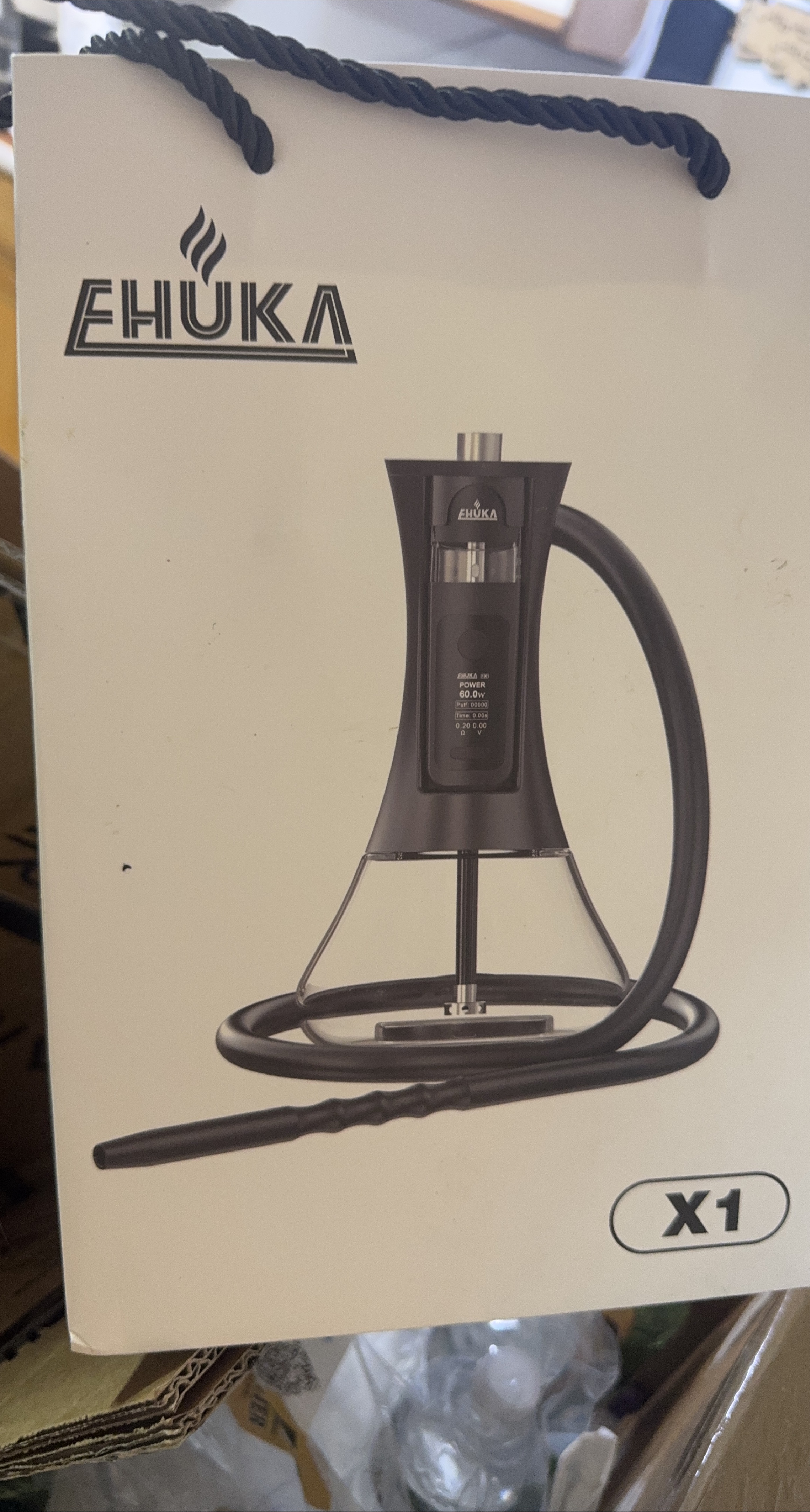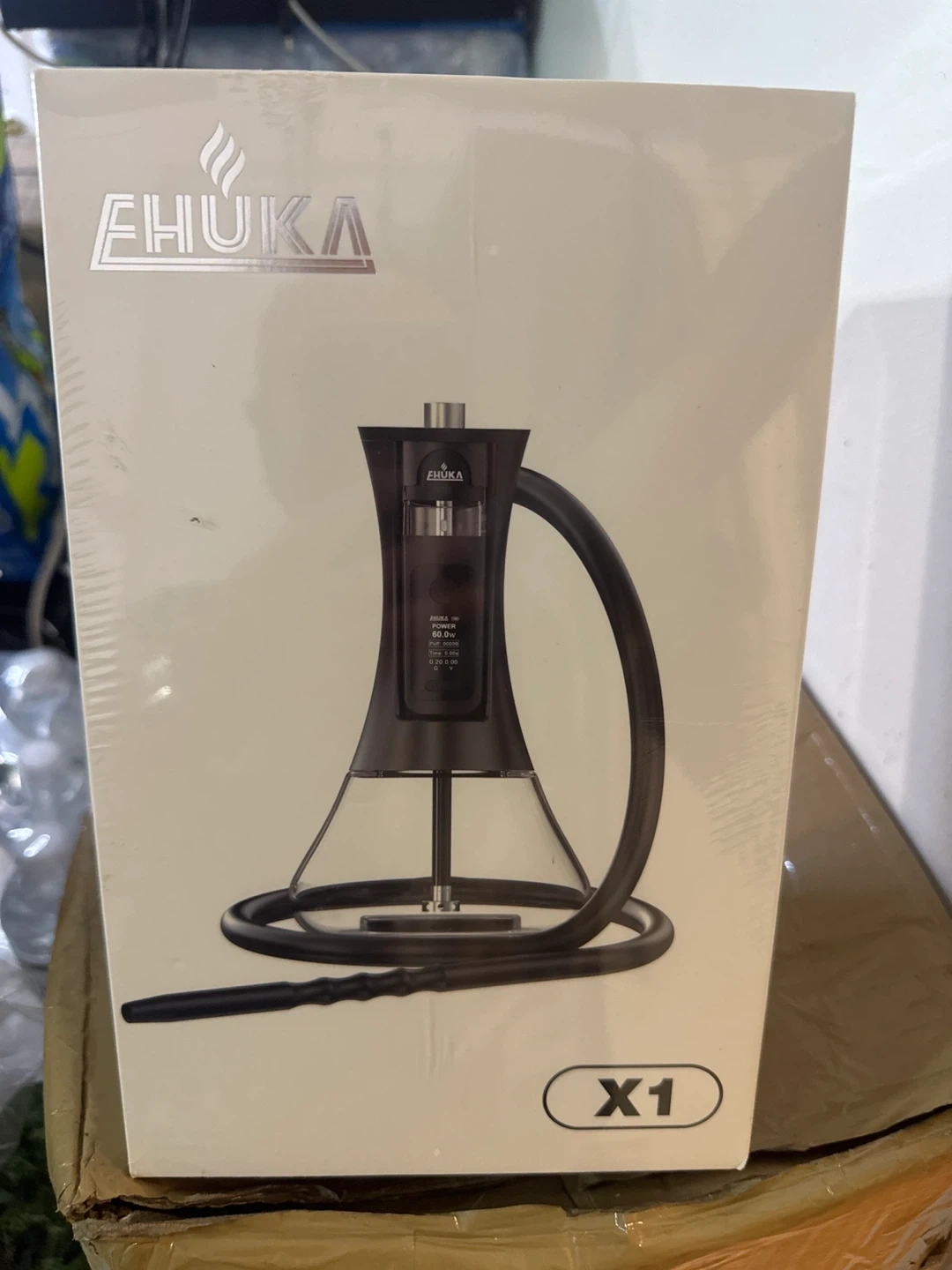 Selling a brand new EHUKA X1 shisha hookah! It's still in its original packaging and includes all the original components: - X1 MOD device - 2 Refilled Pods - 1 Shisha Pipe - 2 Shisha Pipe Connectors - 1 Plastic Jug - 1 Shell Body - 1 LED Light with Remote Specifications include output wattage of 5W-60W, a battery capacity of 2000mAh, and USB Type-C charging