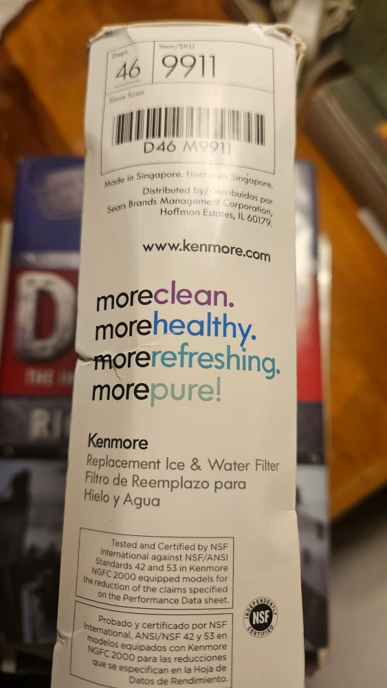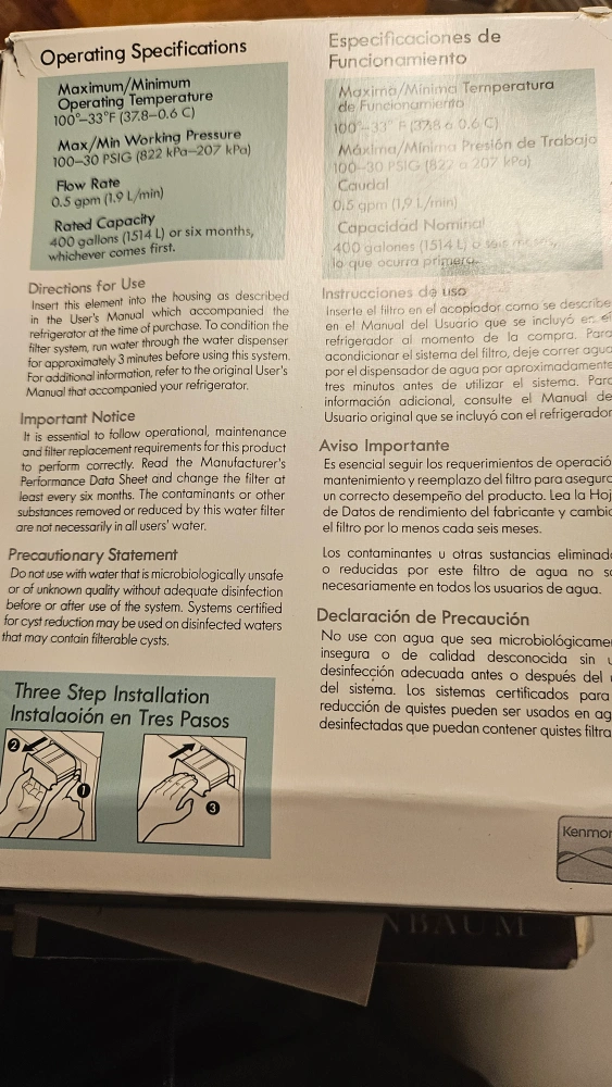 Selling a Kenmore Replacement Ice & Water Filter. This filter is designed to fit into the housing as described in the refrigerator manual. It has a flow rate of 0.5 gpm (1.9 L/min) and a rated capacity of 400 gallons (1514 L) or six months, whichever comes first! The box is included and new! Shippinh $5.00