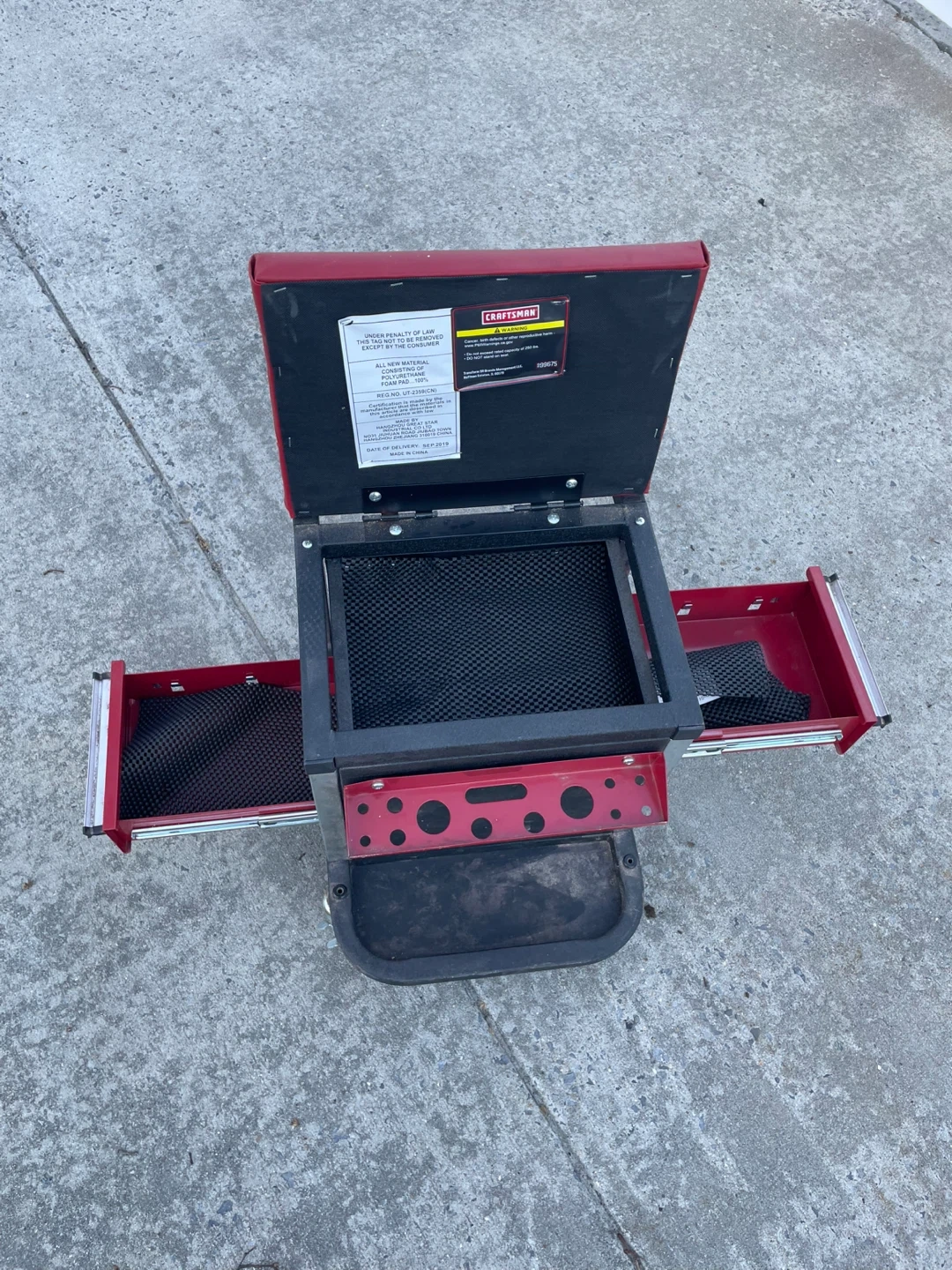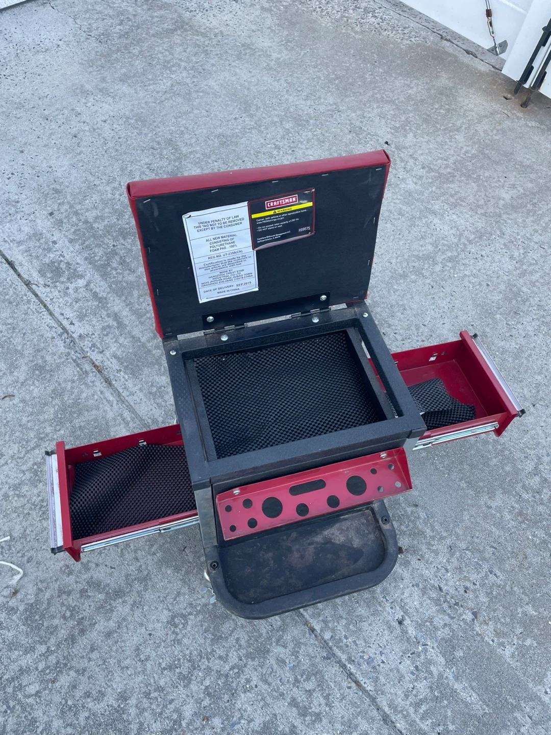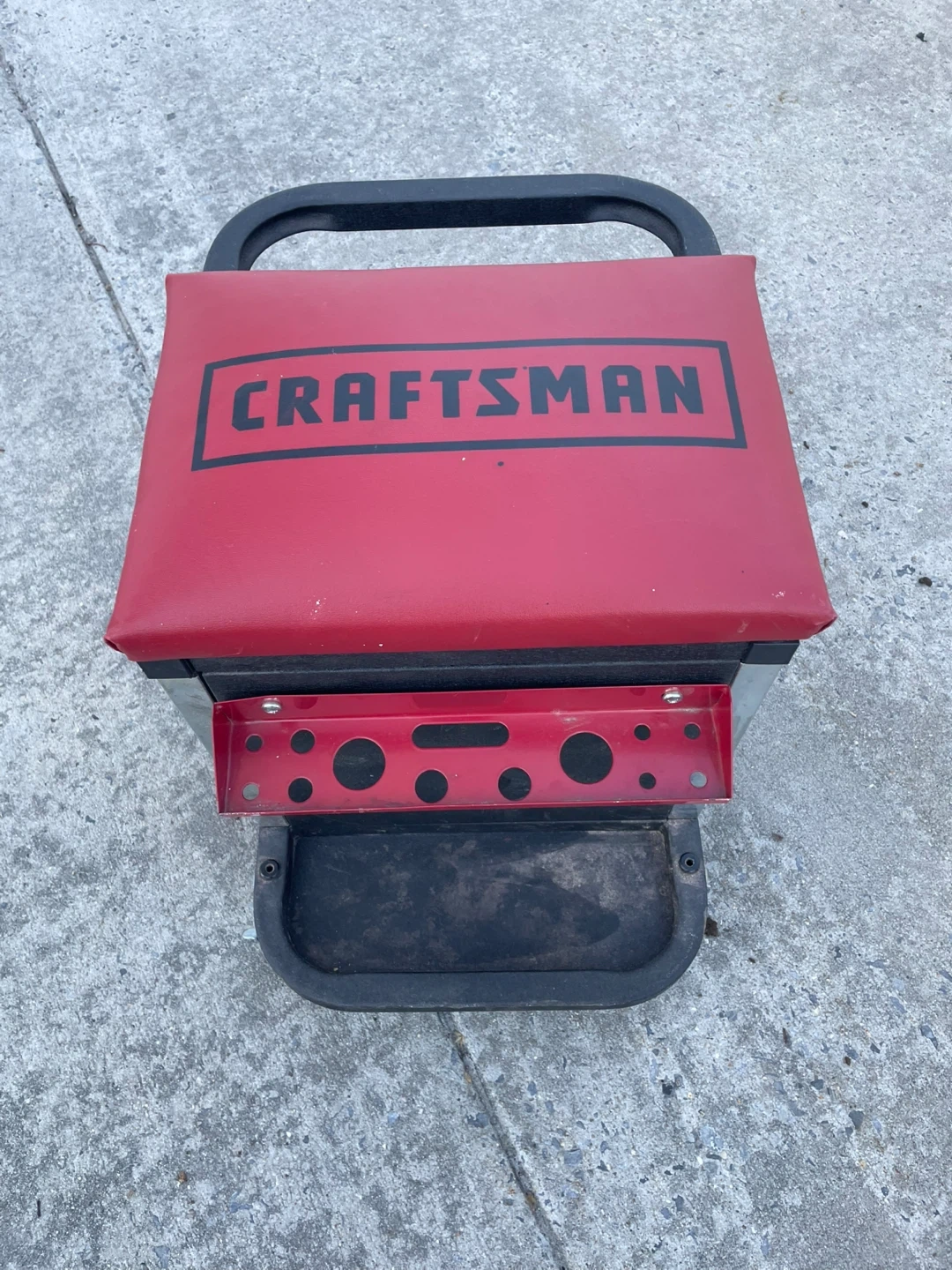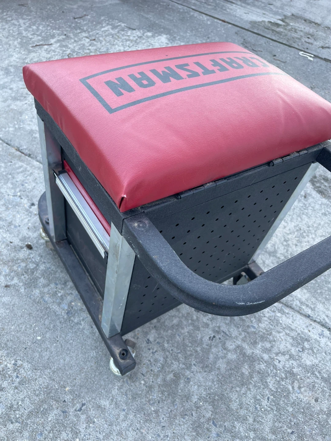 This Craftsman rolling tool seat features a red padded seat and two pull-out drawers for tool storage. It's designed for comfort and convenience in the workshop. The seat rolls on casters for easy mobility. Ideal for mechanics and DIY enthusiasts! Just needs a good cleaning.