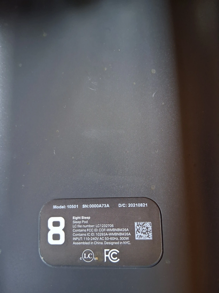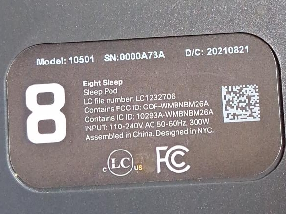 Selling an Eight Sleep Sleep Pod! It's in good condition and ready to help you get a better night's rest. Model number is 10501. D/C: 2021 August 21. Input: 110-240V AC 50-60Hz, 300W