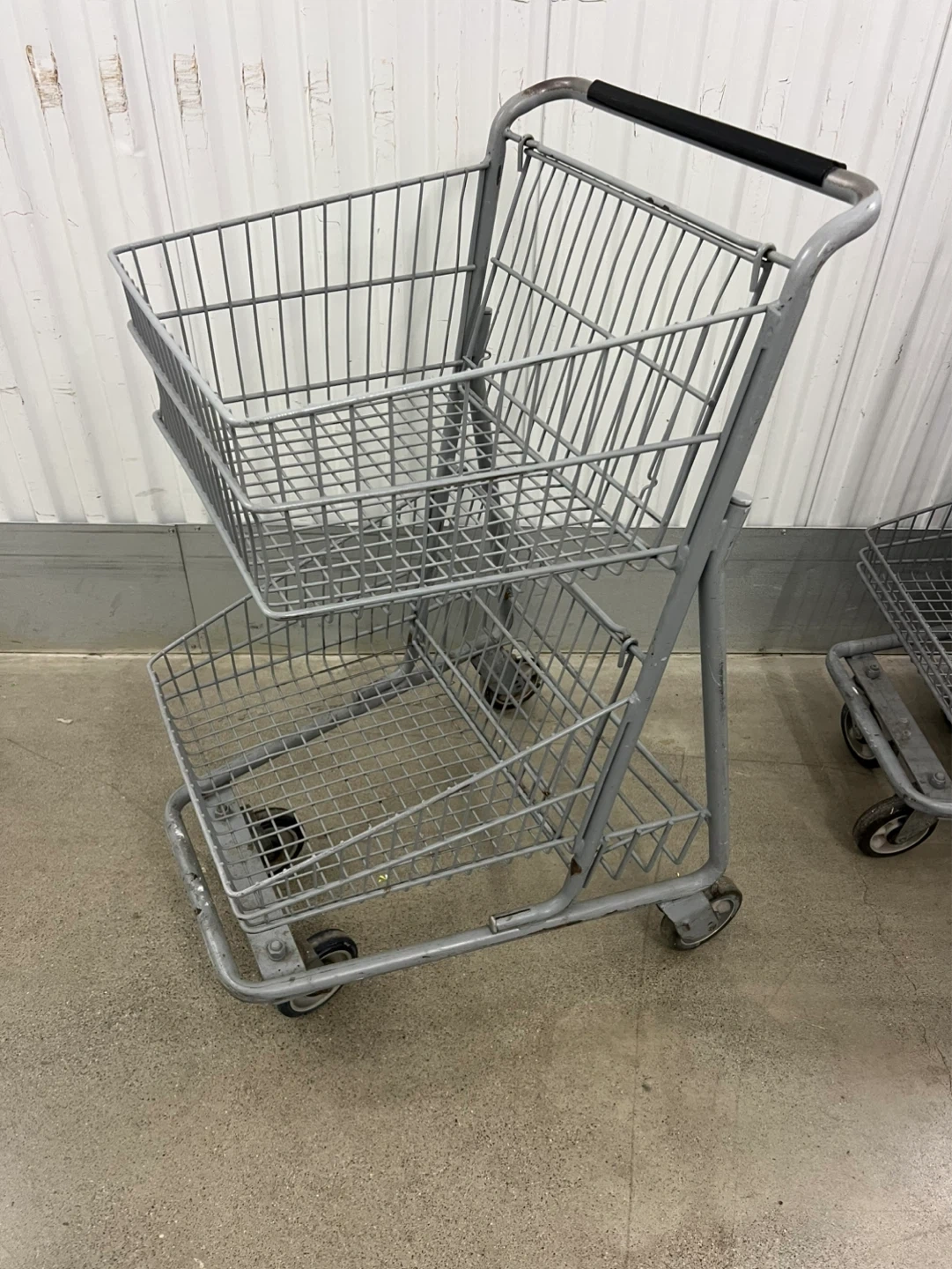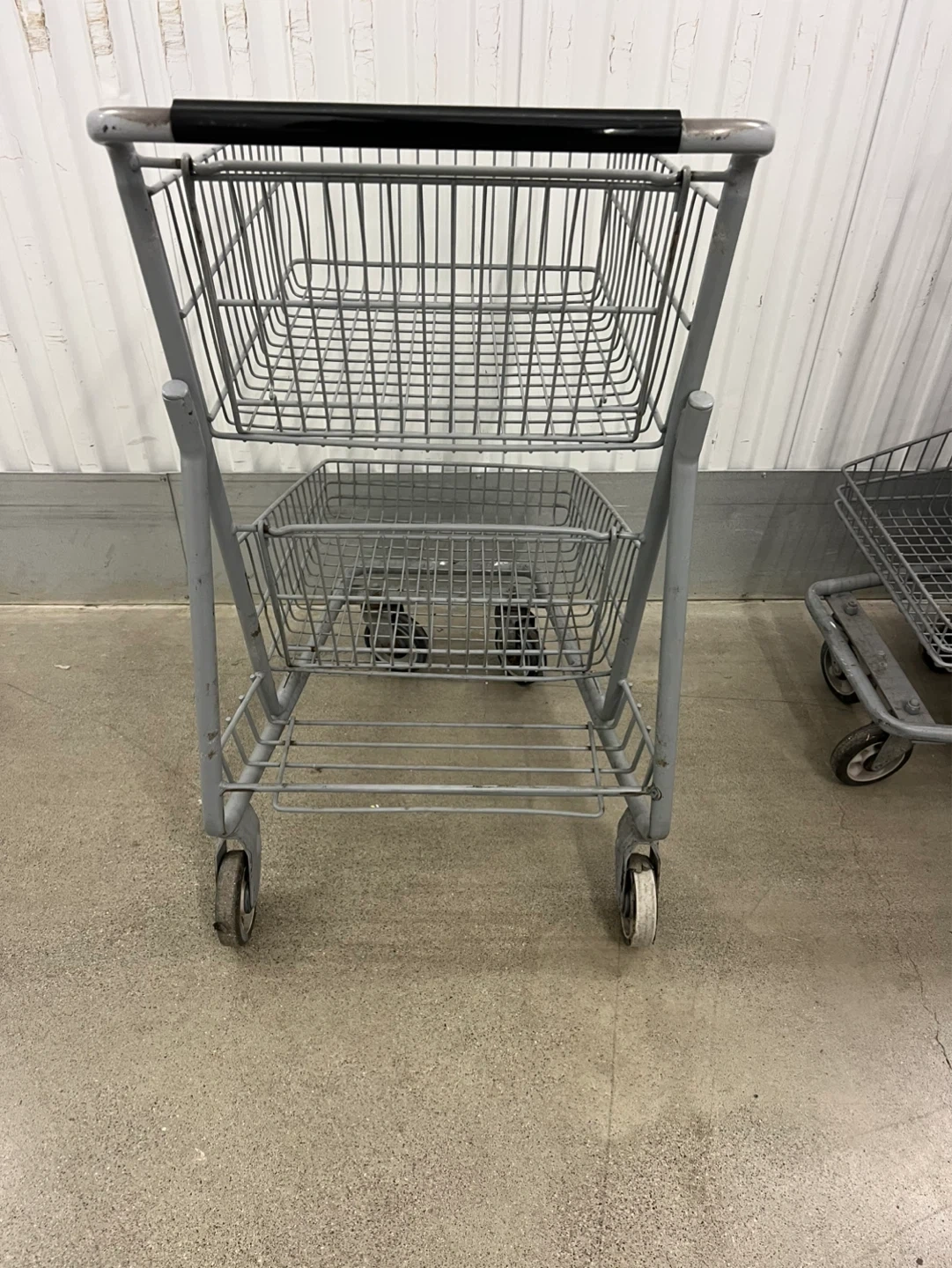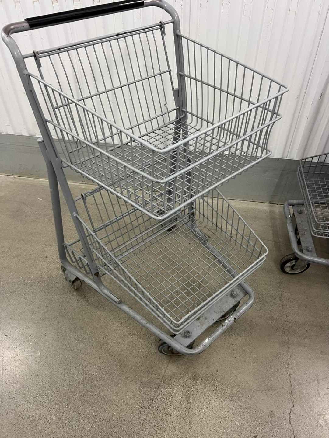 This metal shopping cart features two baskets for organizing items. Its durable construction makes it suitable for retail or home use. Rolls smoothly on four wheels.