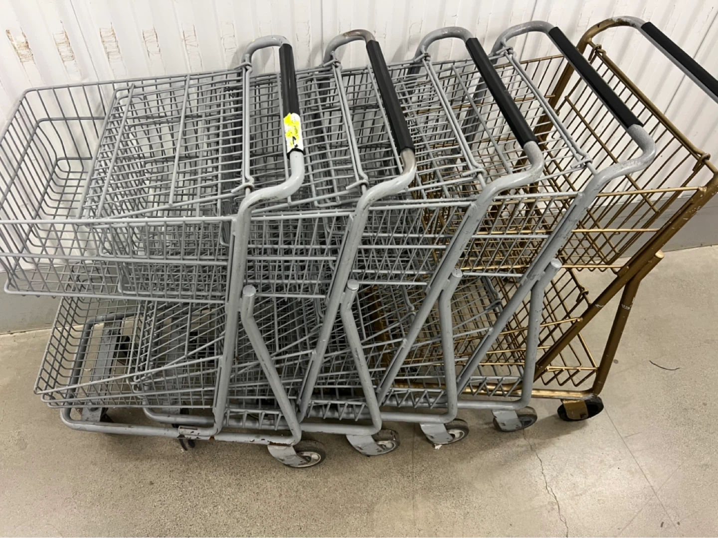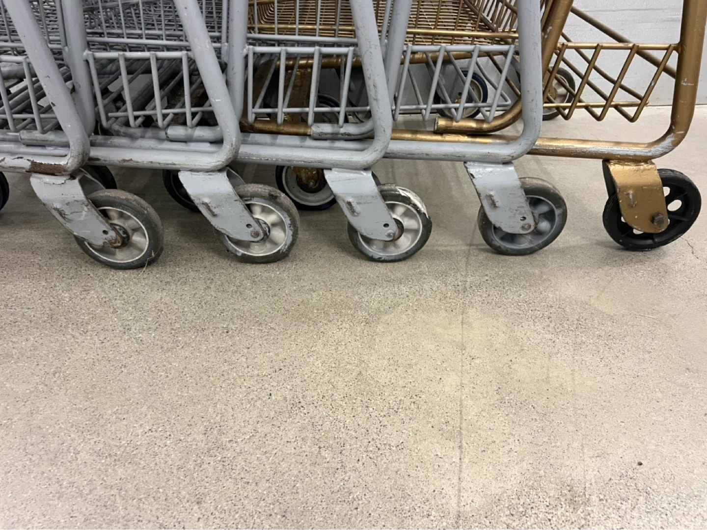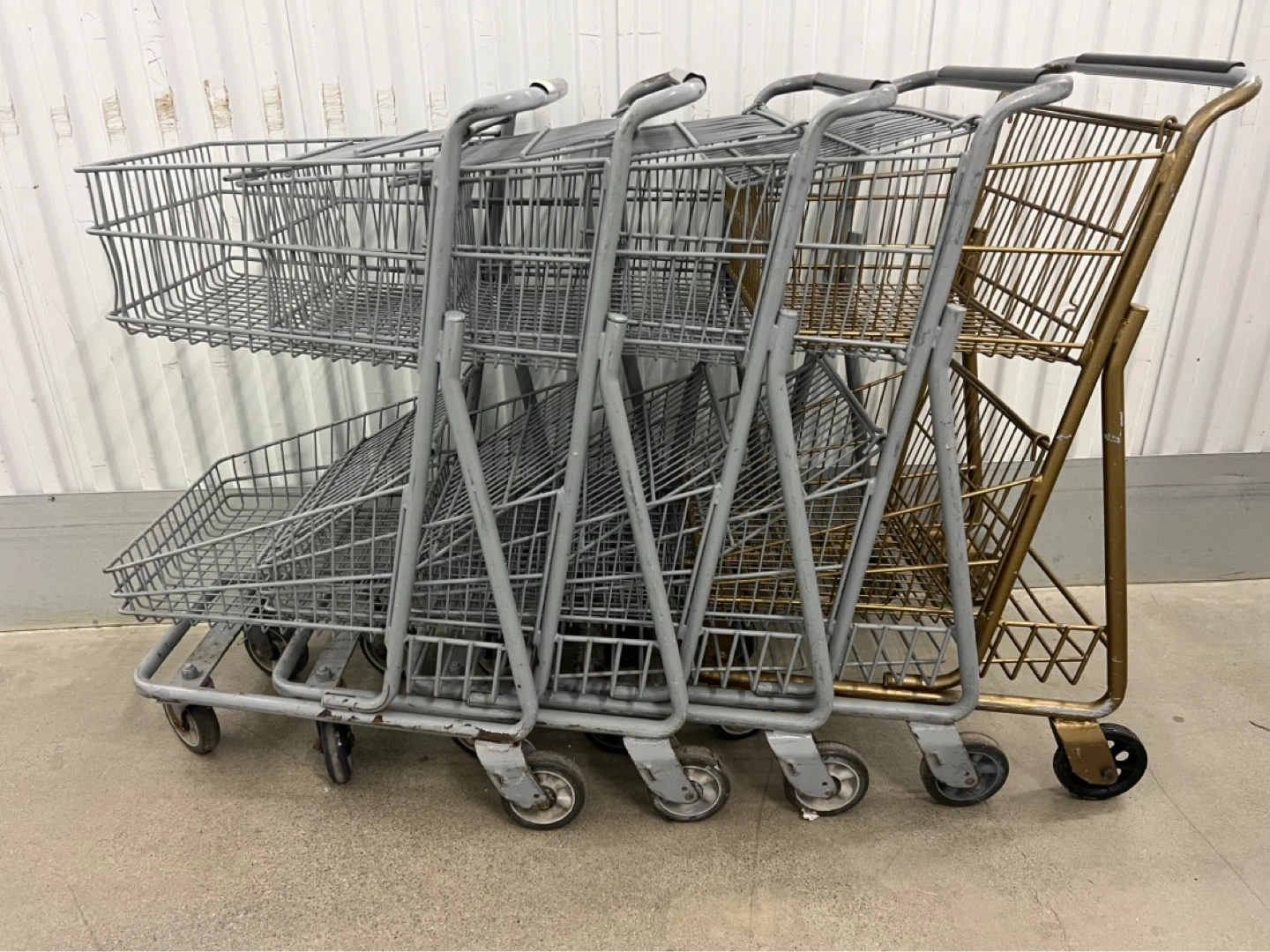 This metal shopping cart features two baskets for organizing items. Its durable construction makes it suitable for retail or home use. Rolls smoothly on four wheels.