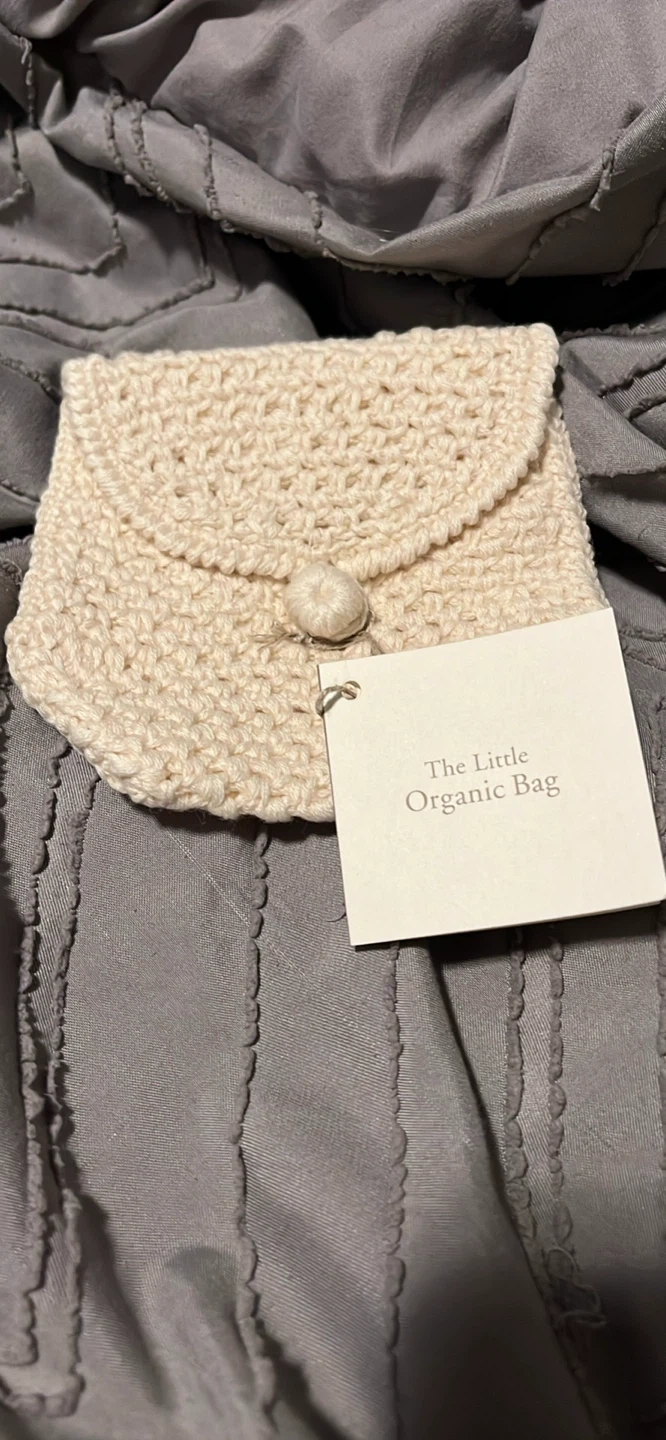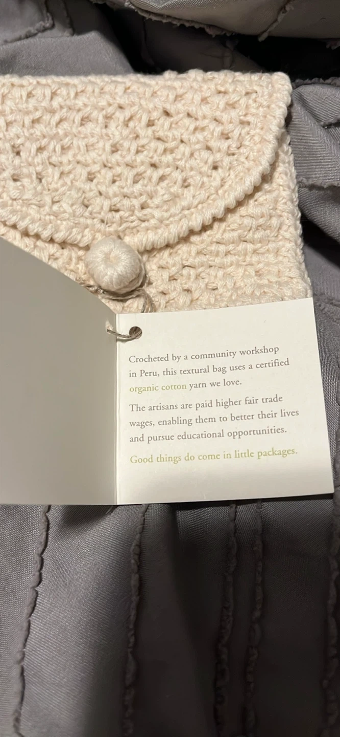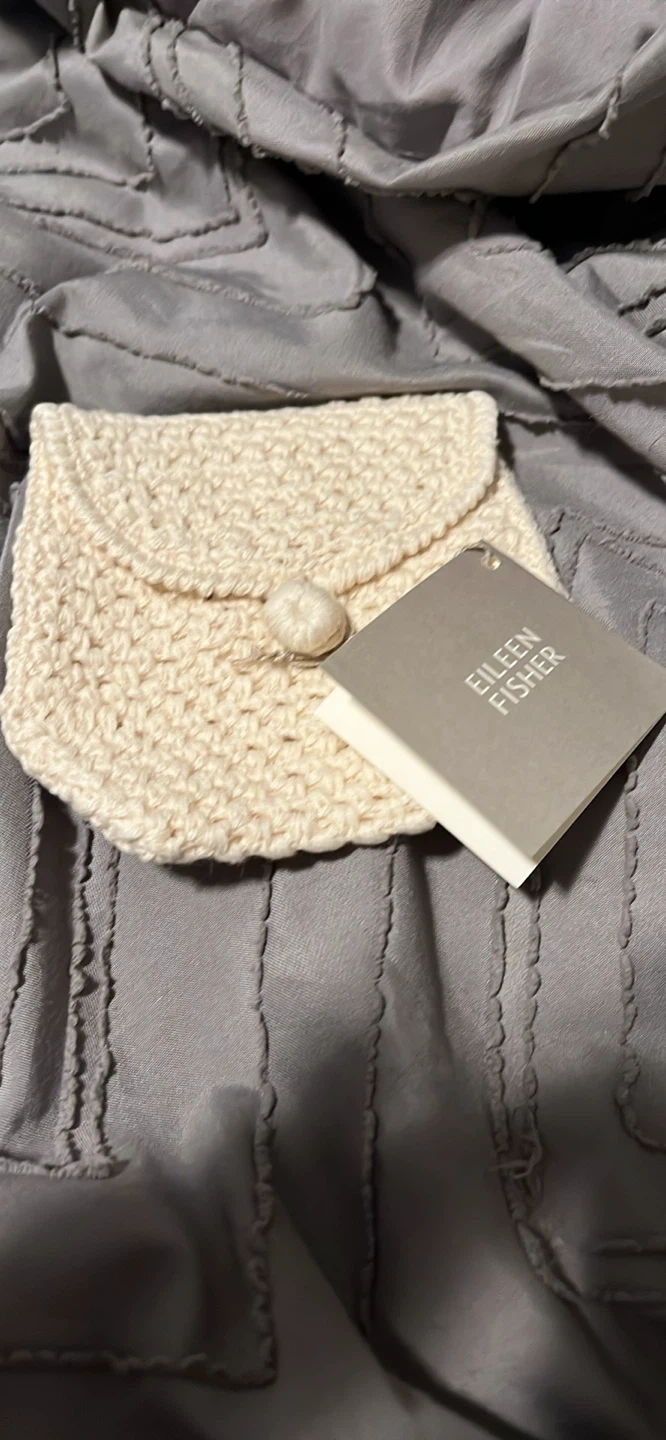 I'm selling a brand new Eileen Fisher "The Little Organic Bag"! This textural bag is crocheted by a community workshop in Peru using certified organic cotton yarn. The artisans are paid higher fair trade wages, enabling them to better their lives and pursue educational opportunities