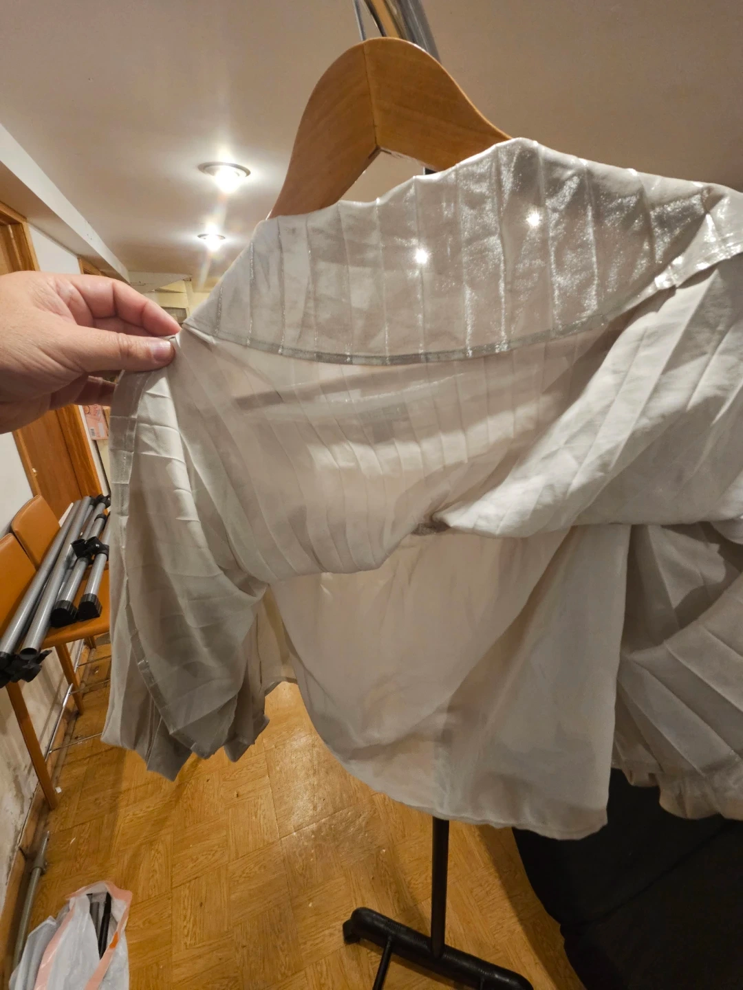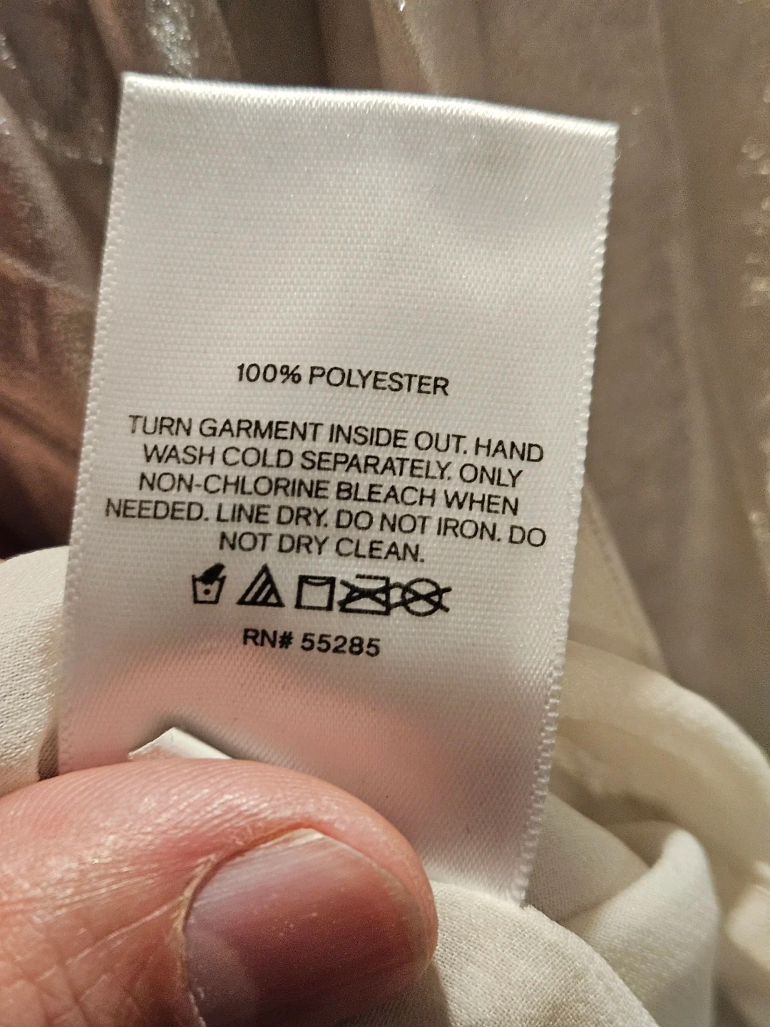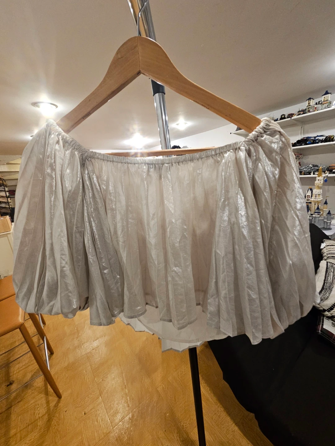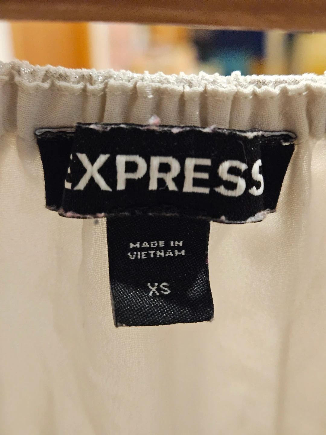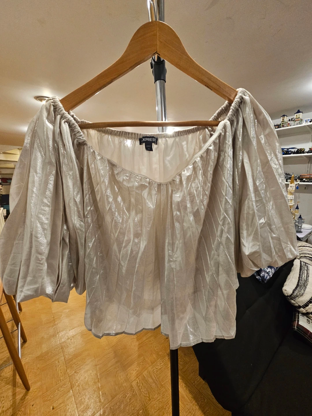 This Express top is silver and off-the-shoulder. It's made of 100% polyester. Hand wash cold separately.