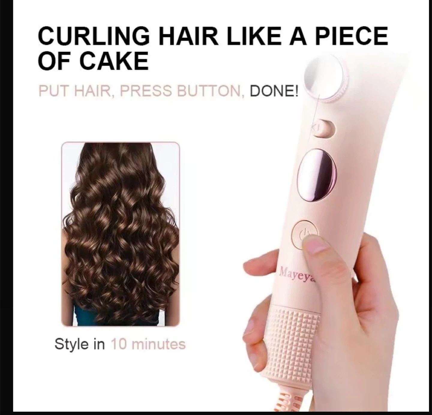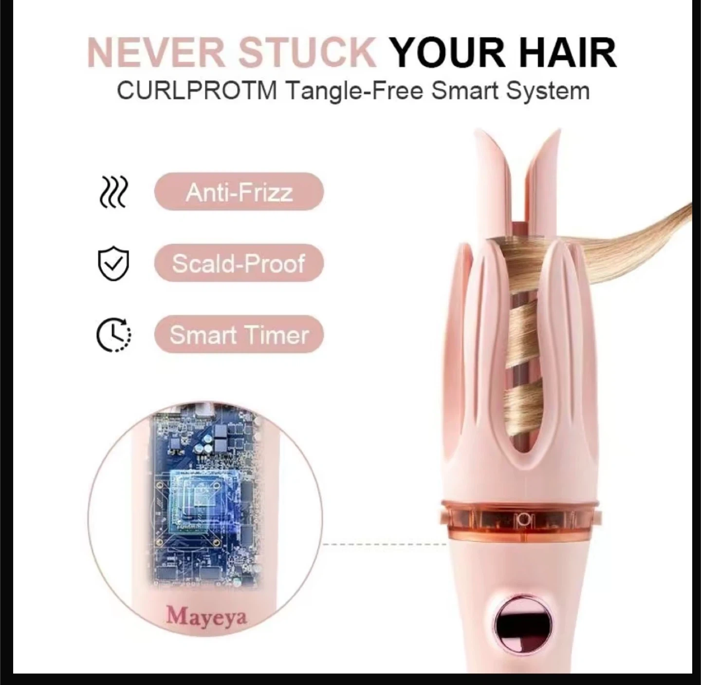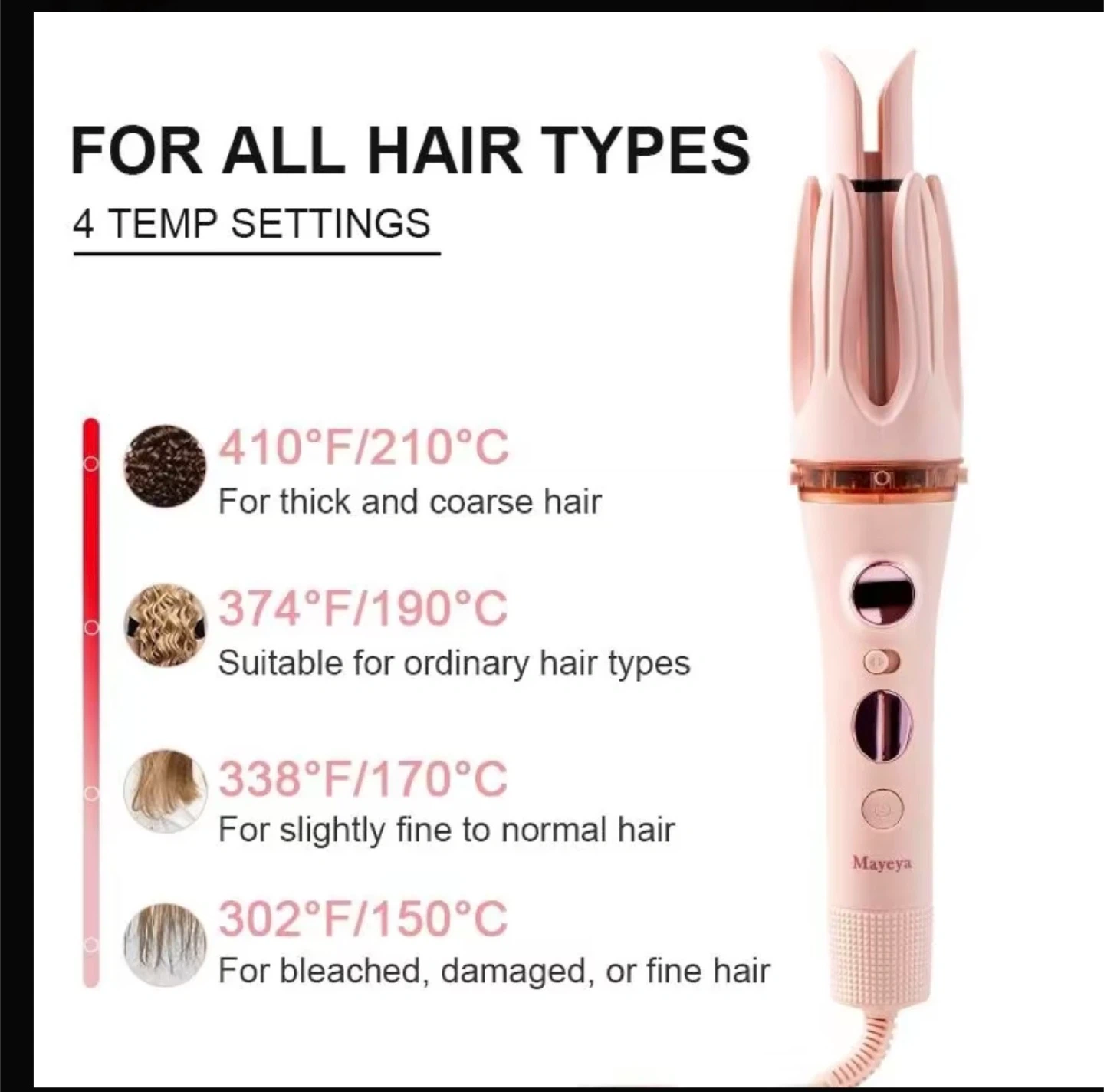 This Mayeya automatic curler creates natural waves with an LED display. It features adjustable temperature settings from 300°F to 420°F. Its tangle-free smart system and smart timer help prevent hair damage and scalding. This portable device works with dual voltage for travel convenience.