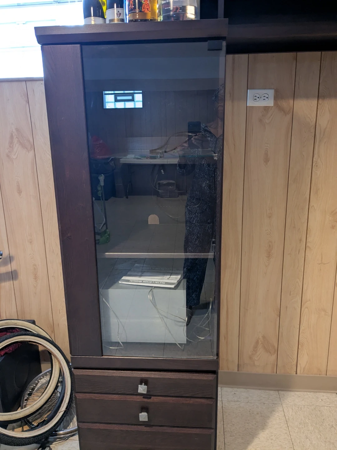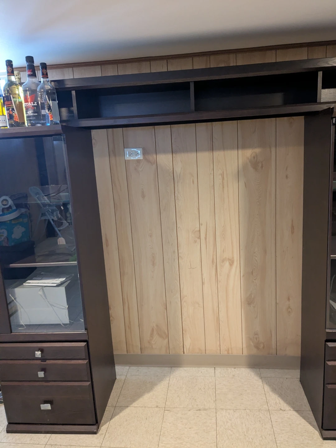 Sturdy, custom-built wall unit with open shelving and side storage—perfect for a TV setup, media center, office storage, or display wall. Features a wide upper shelf for décor, books, or electronics and two tall side units that provide generous storage space.