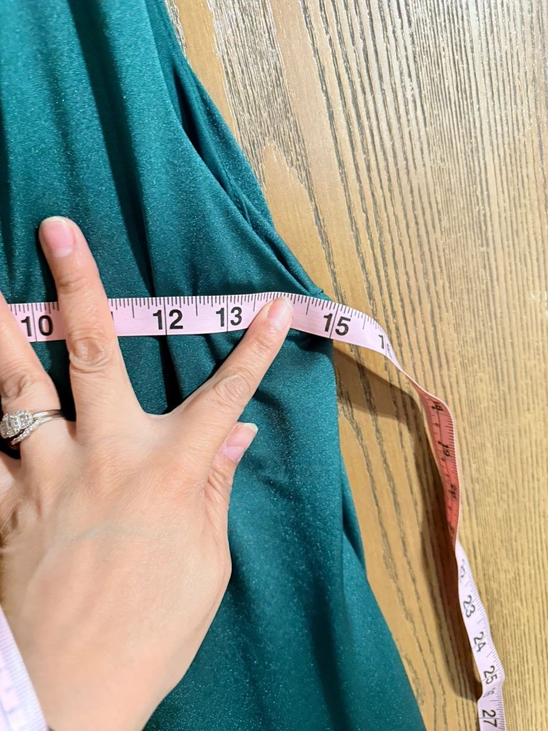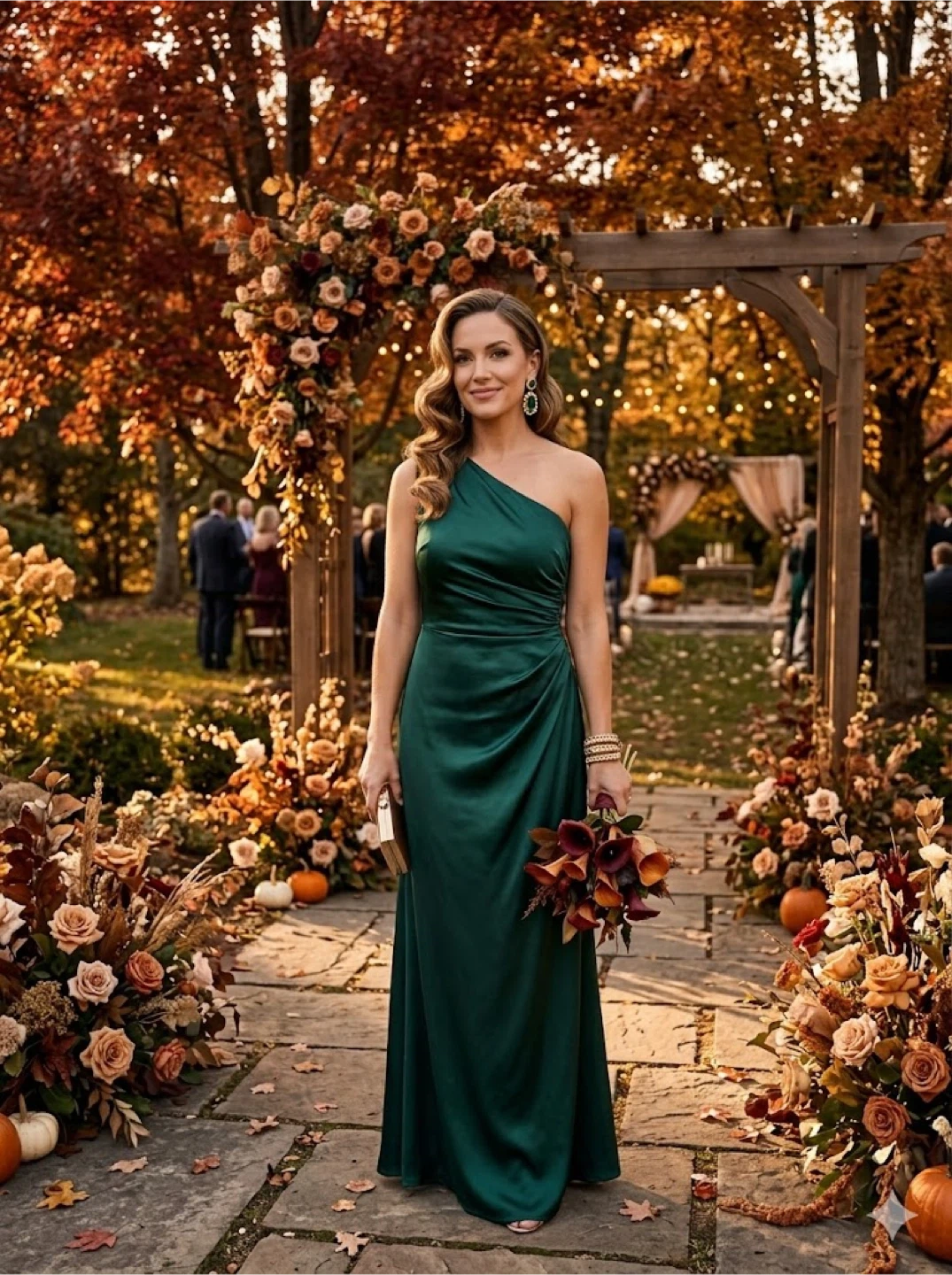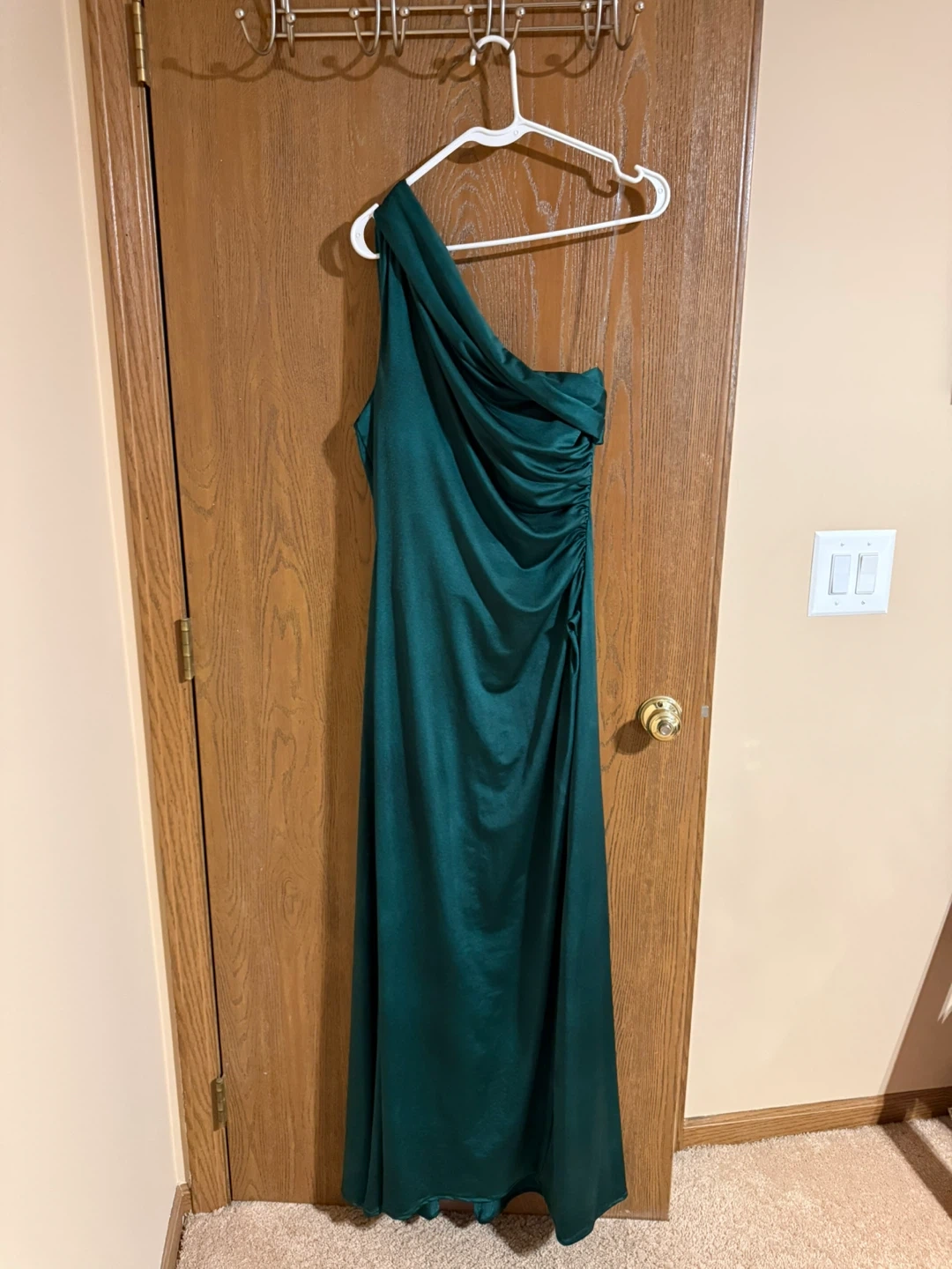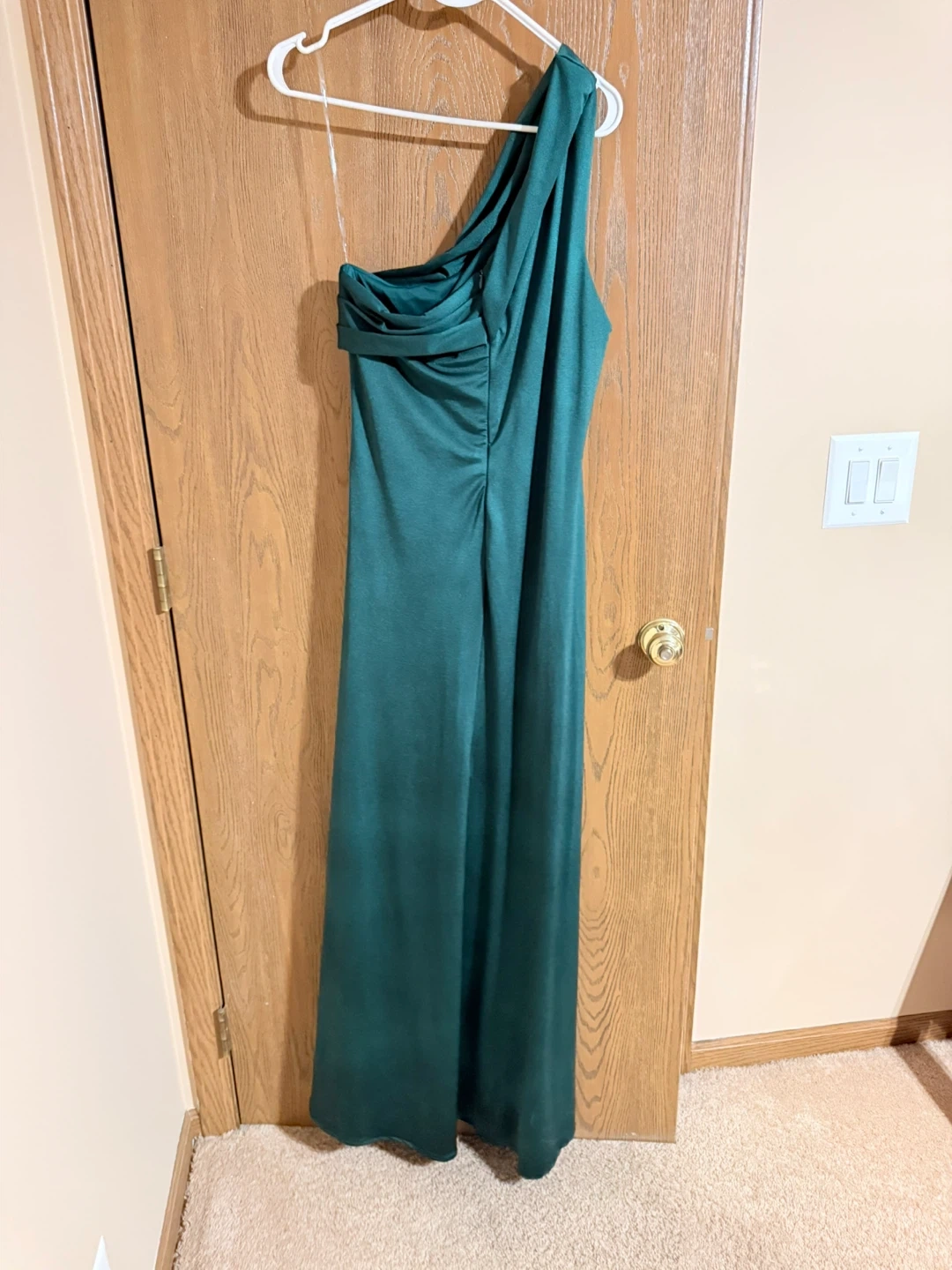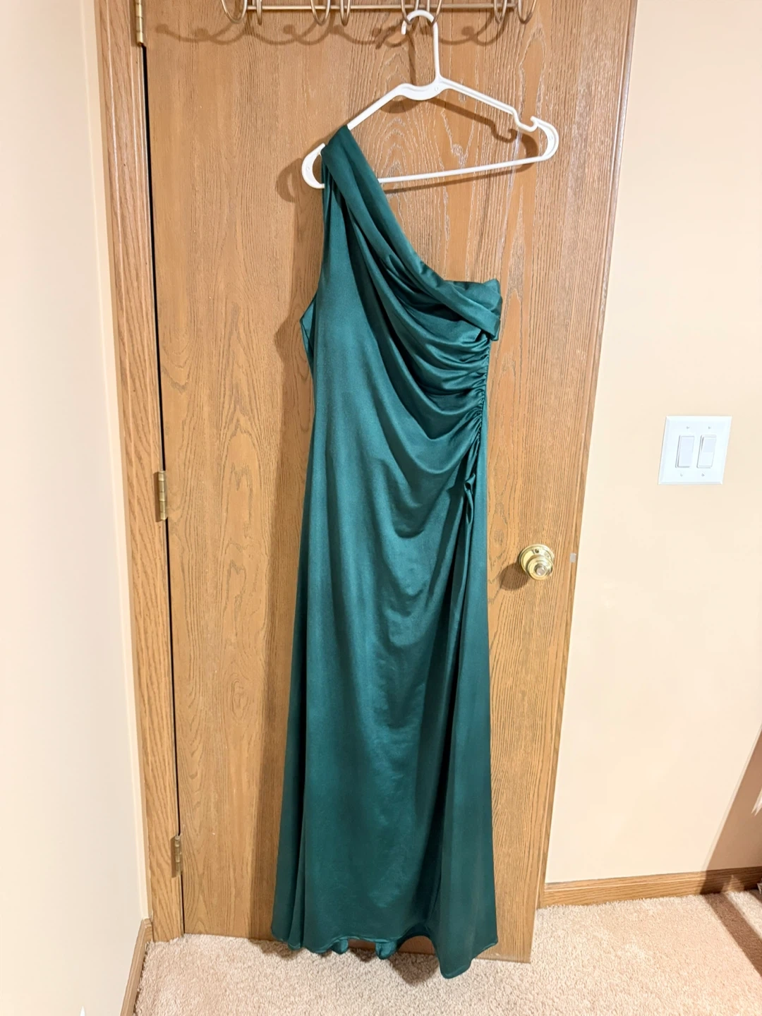 Elegant AS by DF gown in a deep green color. It features a flattering one-shoulder neckline and ruched detailing on the side. Made in USA, size large. Perfect for formal events or weddings!