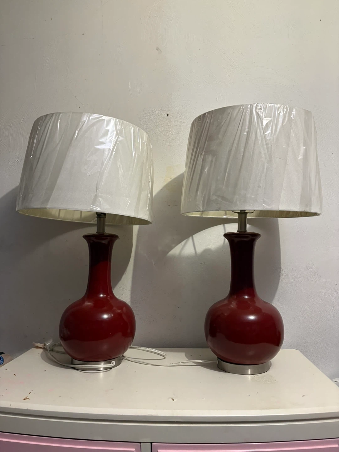 Selling a pair of table lamps with a unique red vase design! These lamps would add a touch of elegance to any room. Asking $20 for both!