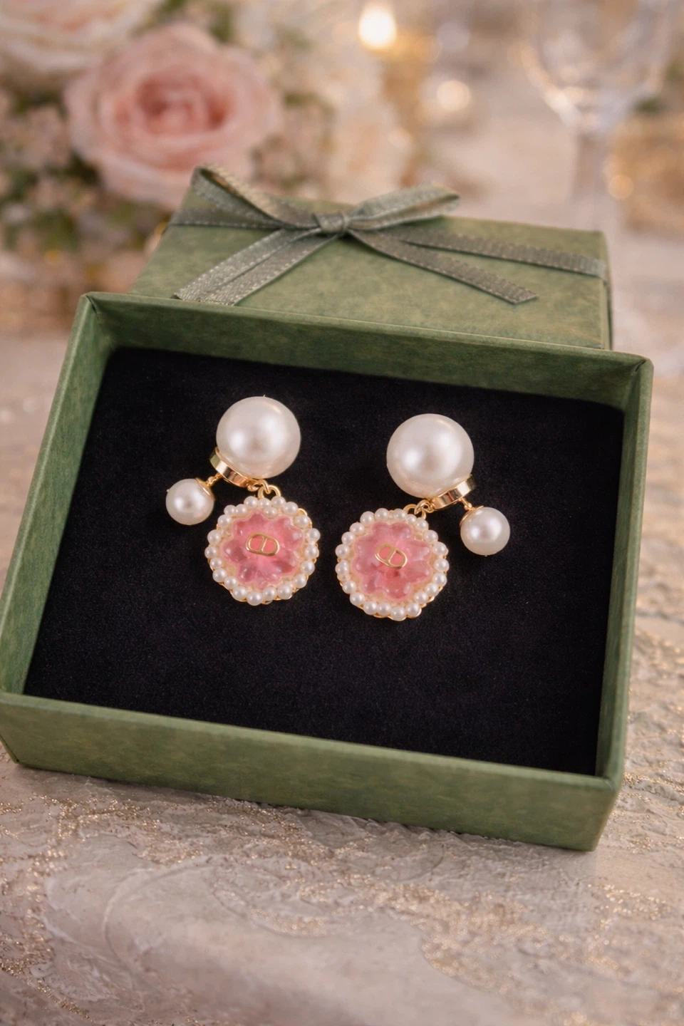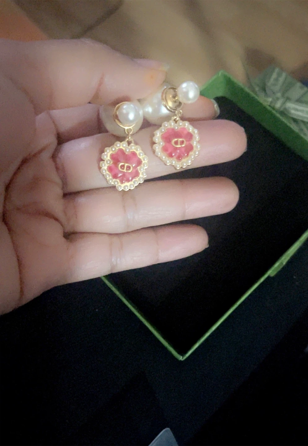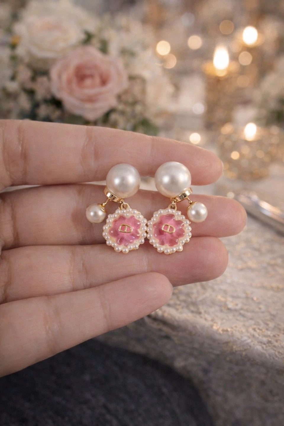 Chic Dior Beautiful pearl earrings with delicate pink floral details and gold-tone accents. Elegant, feminine, and perfect for Valentine’s Day. Comes in a gift box, ready to give. A lovely surprise for someone special 💖 ✨ Fast shipping • Limited stock • Great gift id www.rosecolletions.shop