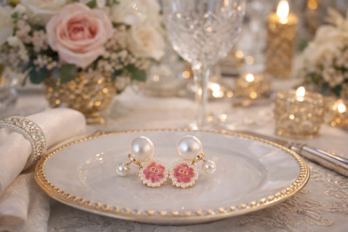 Dior Pearl and Pink Flower Earrings Valentine’s Gift