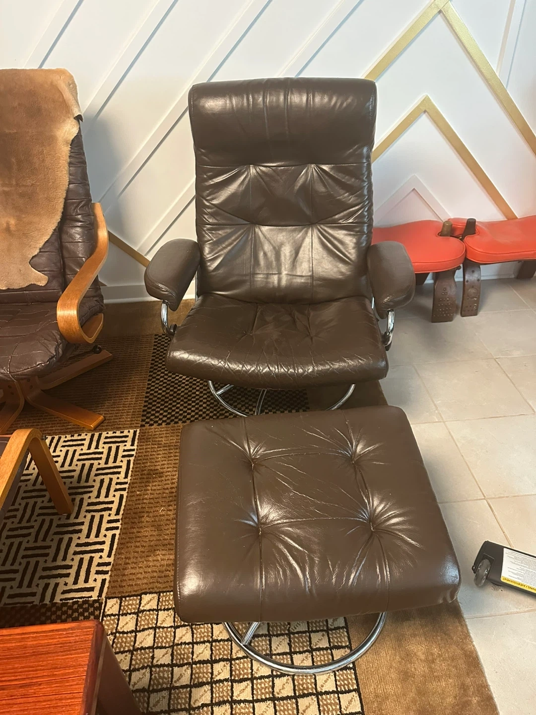 Selling a comfortable brown leather Ekornes chair with a matching ottoman. The chair has a swivel base and a high back for extra support. Although it shows some signs of use but is still in good condition, original leather and great for relaxing!