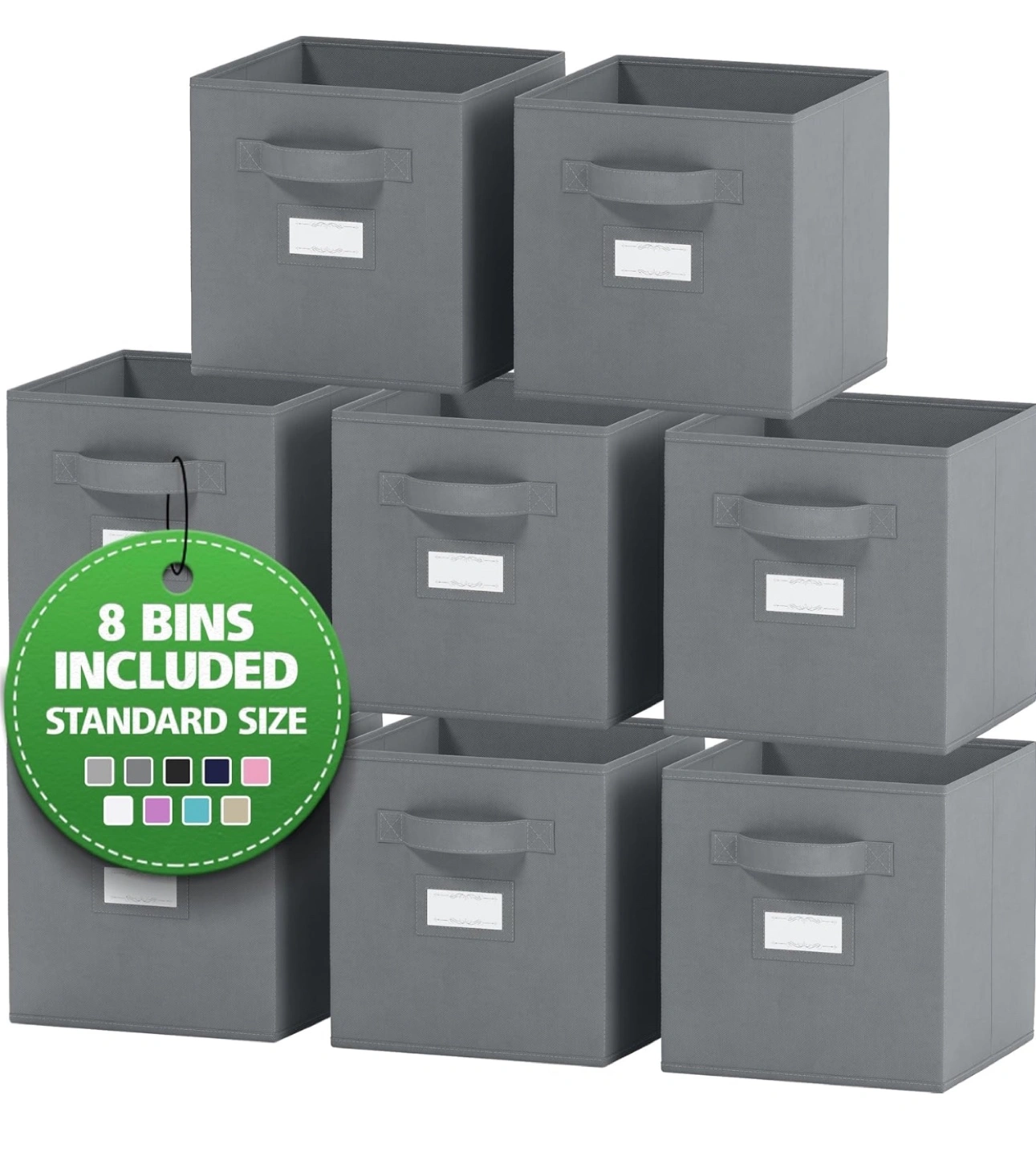 Set of eight gray fabric storage bins. Great for organizing closets, shelves, or drawers. Each bin features a convenient handle.