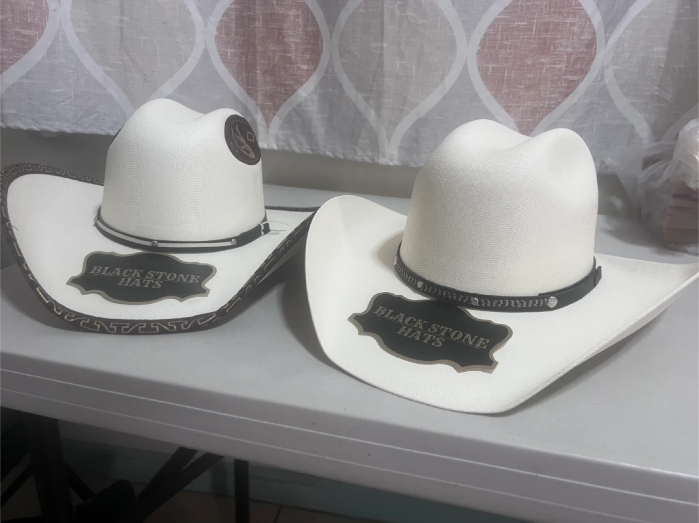 10Here are two cowboy hats for sale! One is a brown El Mayor Hats cowboy hat in size M. The other is a white Blackstone Hats cowboy hat.