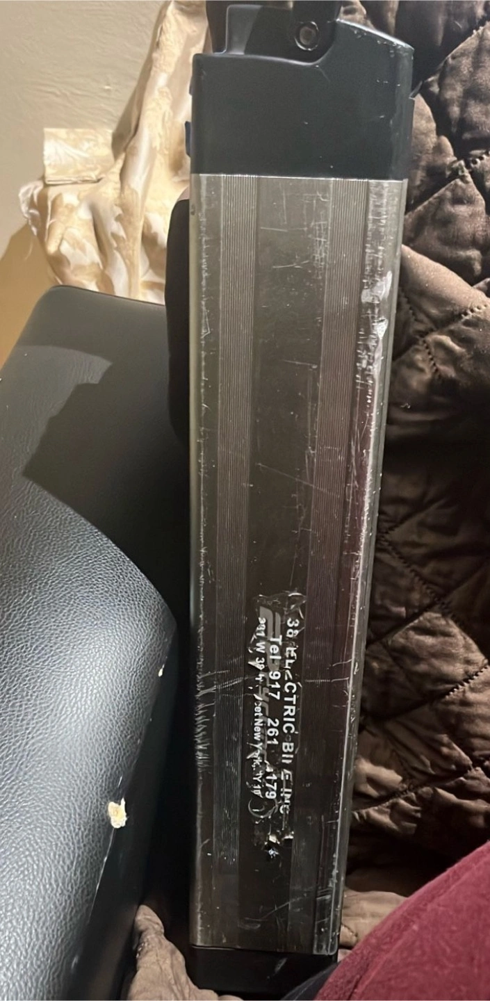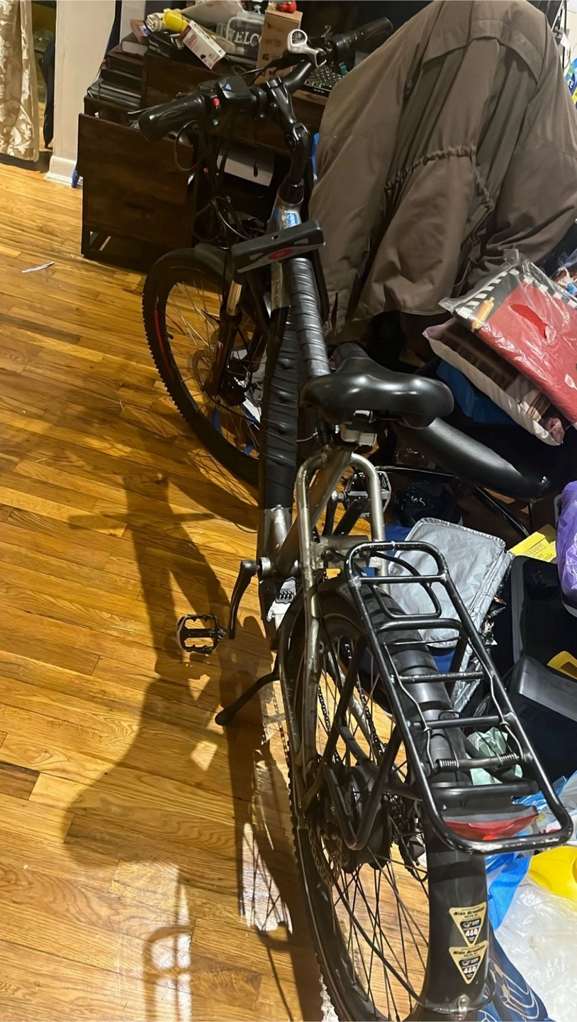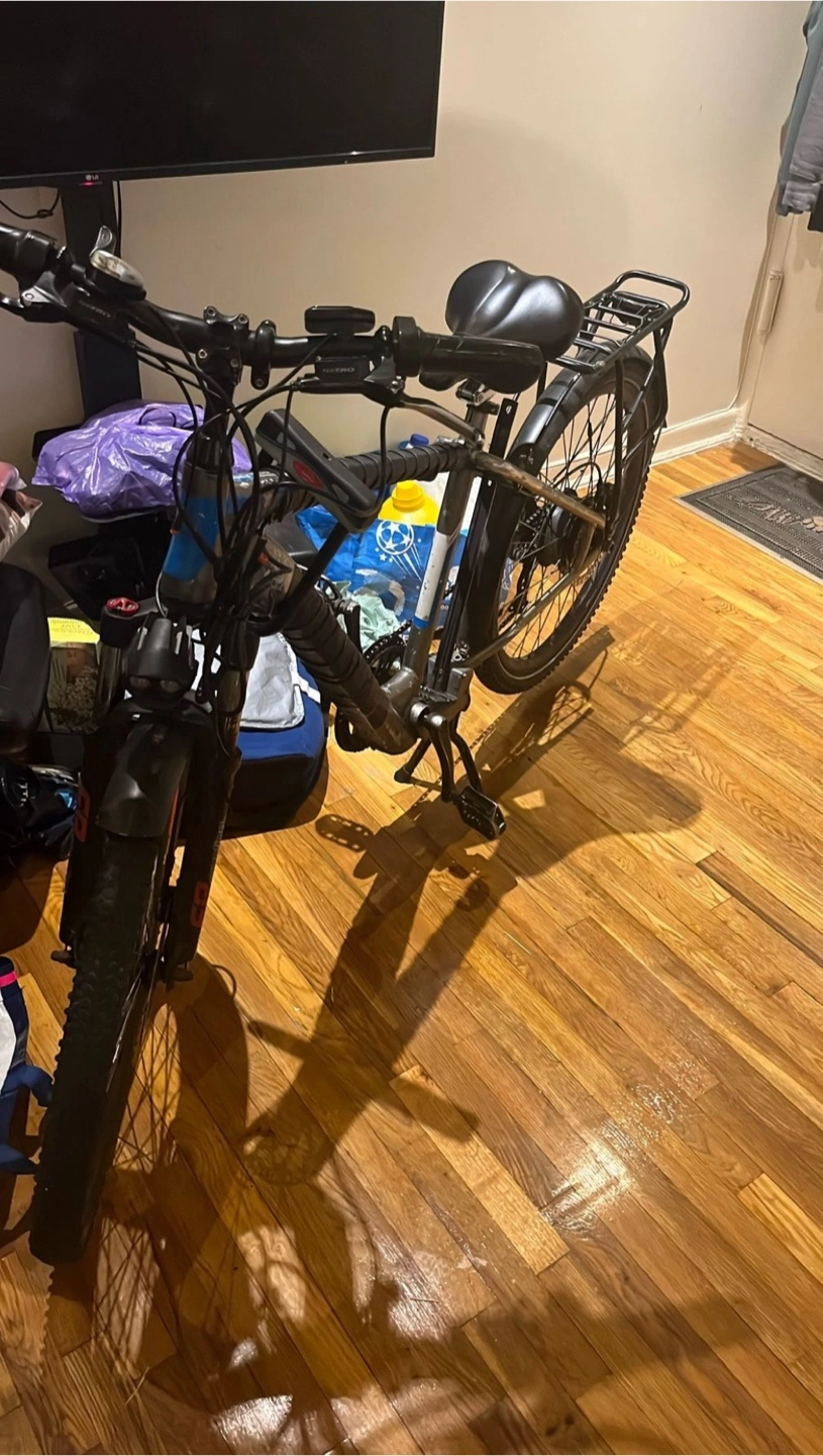 15Adult electric bike. Features include a rear rack, and what appears to be disc brakes. Battery included. Good for commuting or recreation.