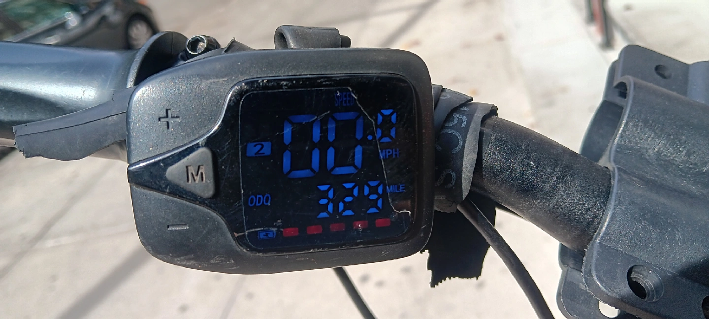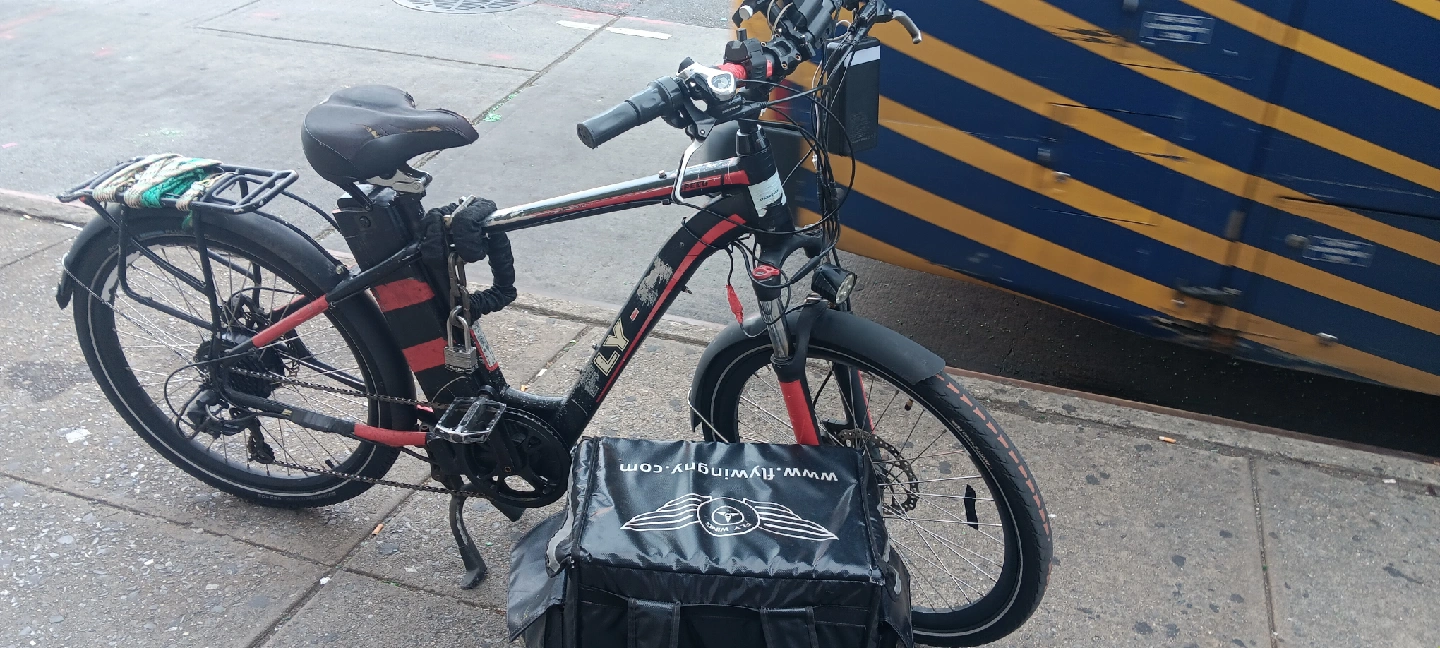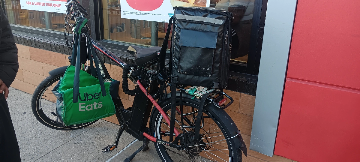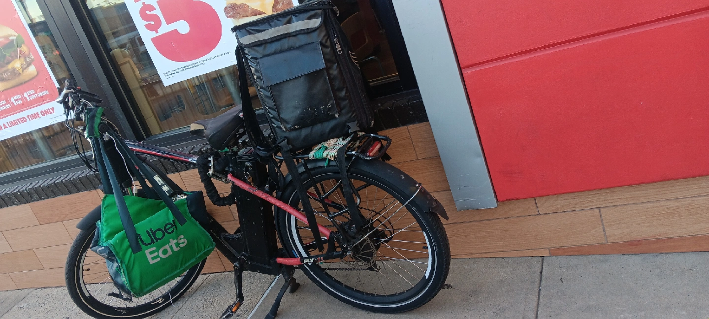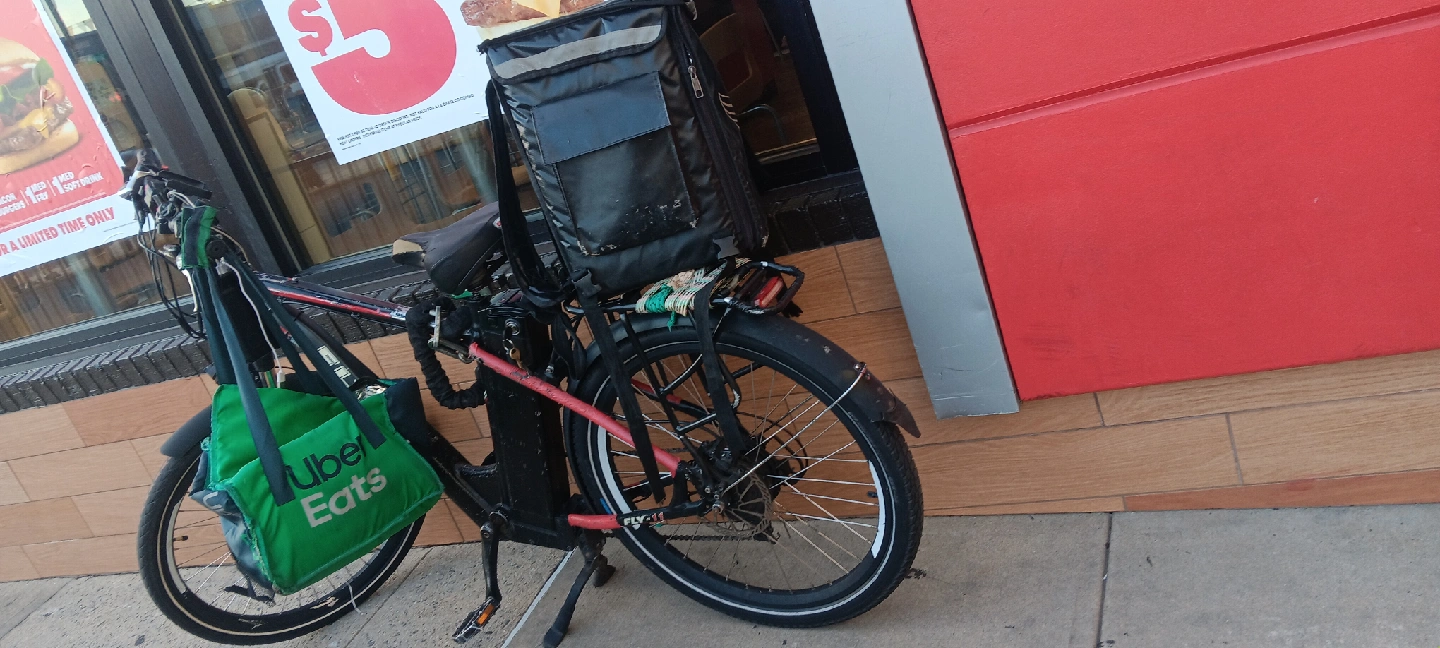 Selling an electric bike. It has a display that shows speed, mileage, and other info. There is an Uber Eats bag attached.