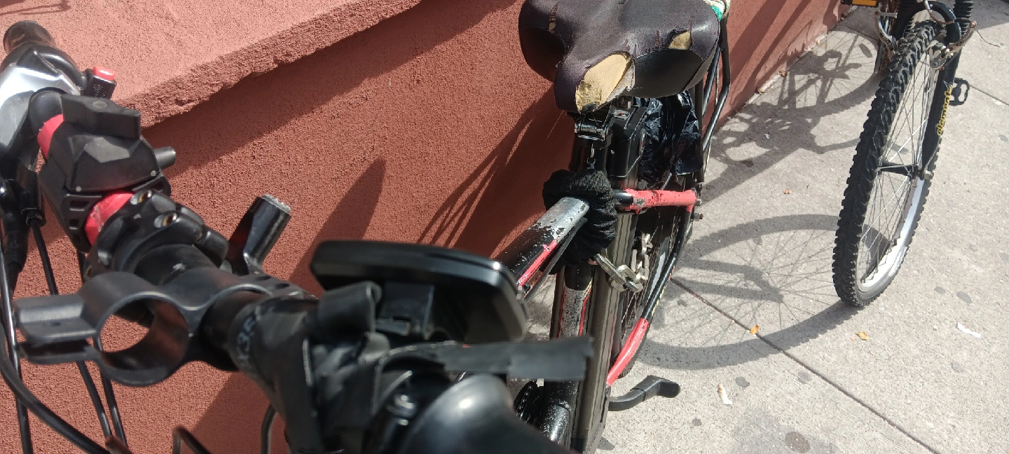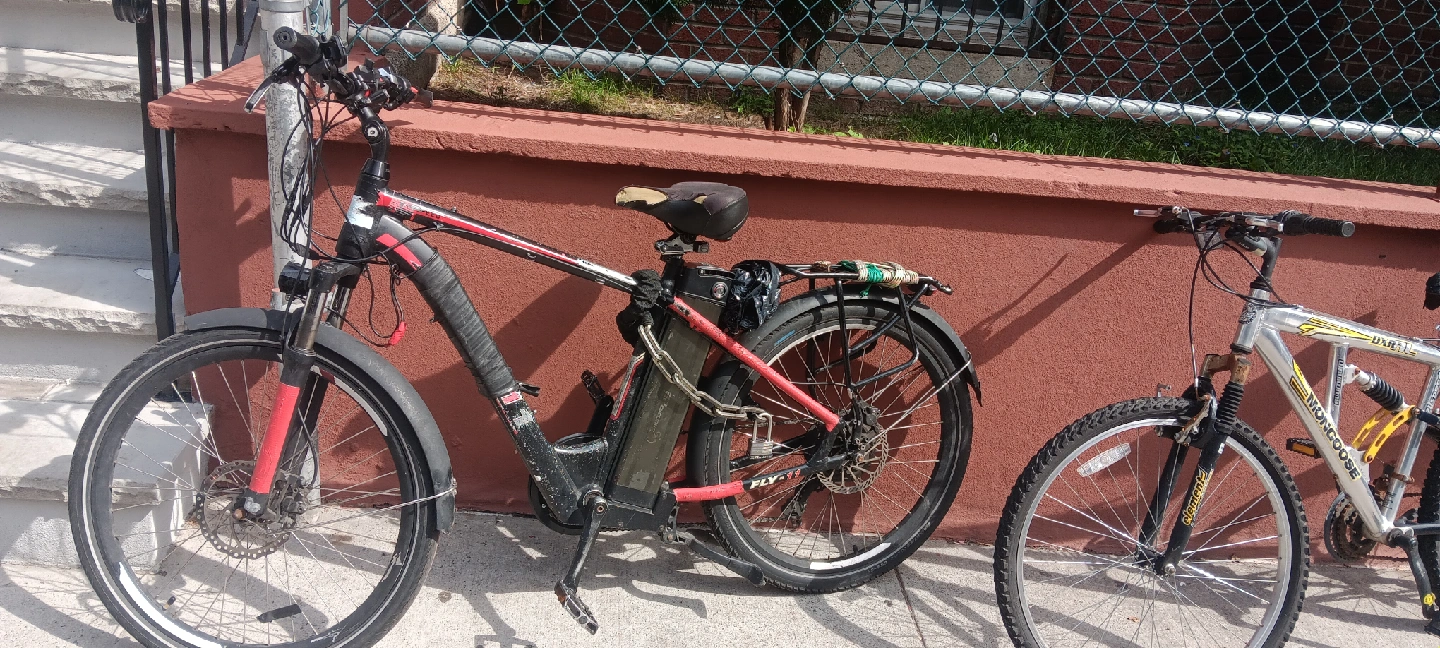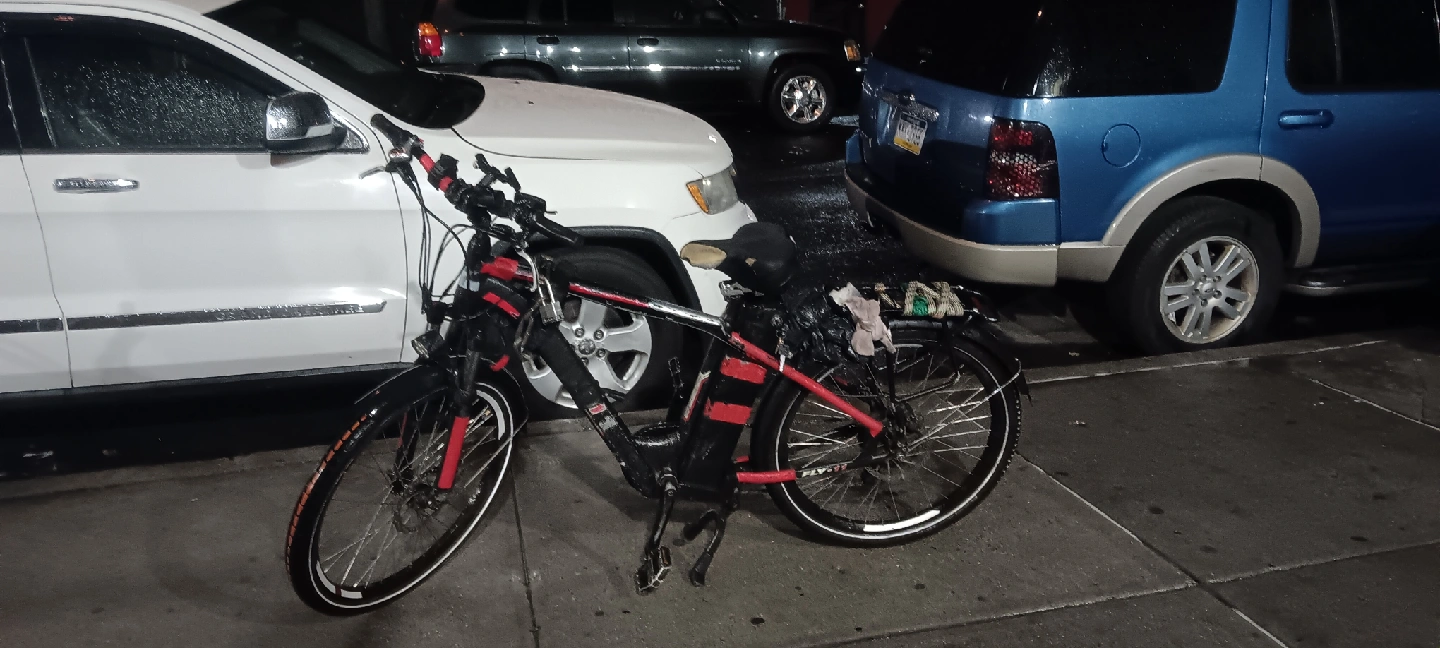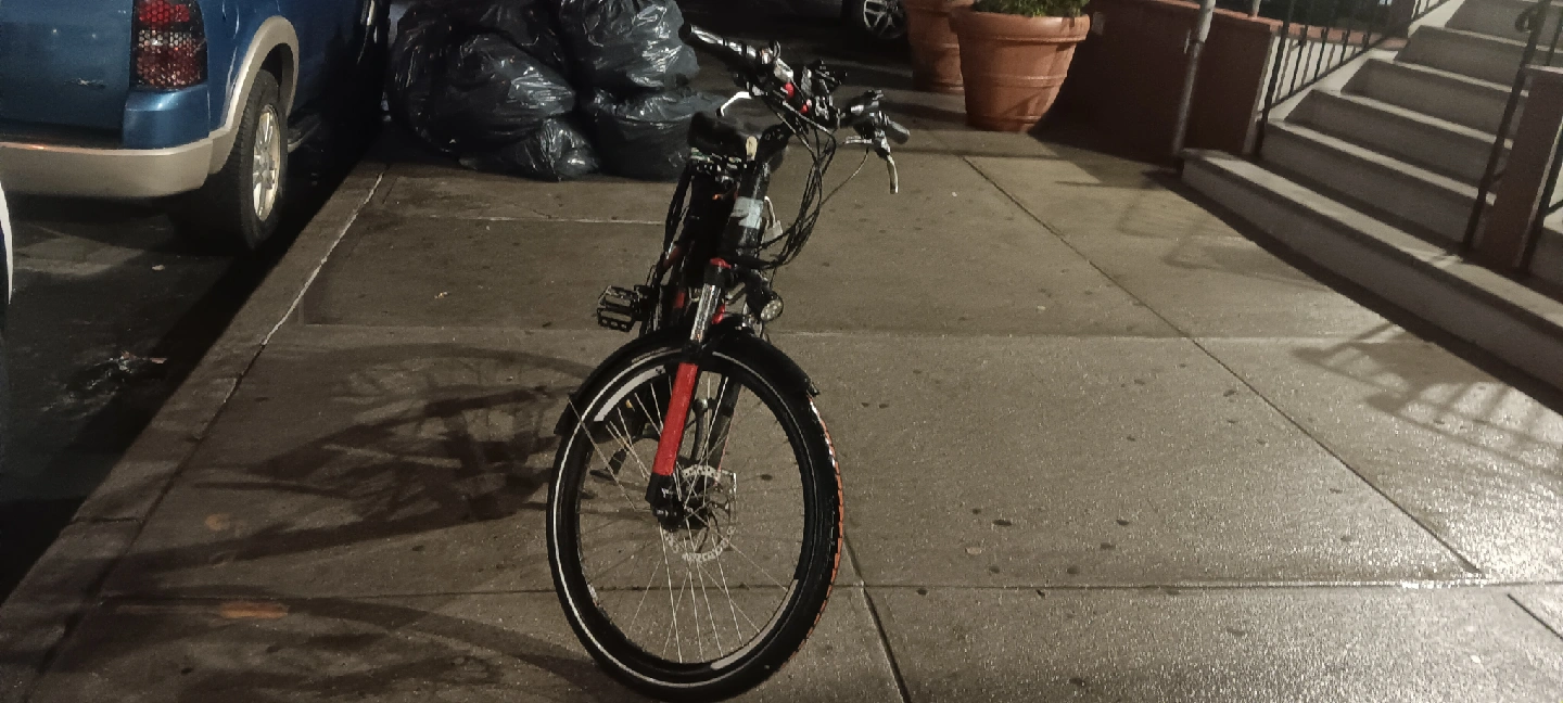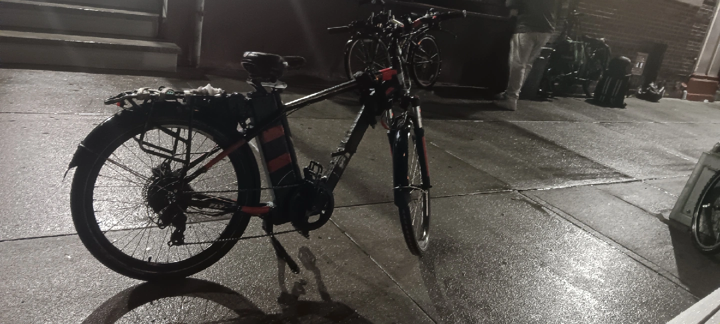 Selling an electric bike. It has a display that shows speed, mileage, and other info. There is an Uber Eats bag attached.