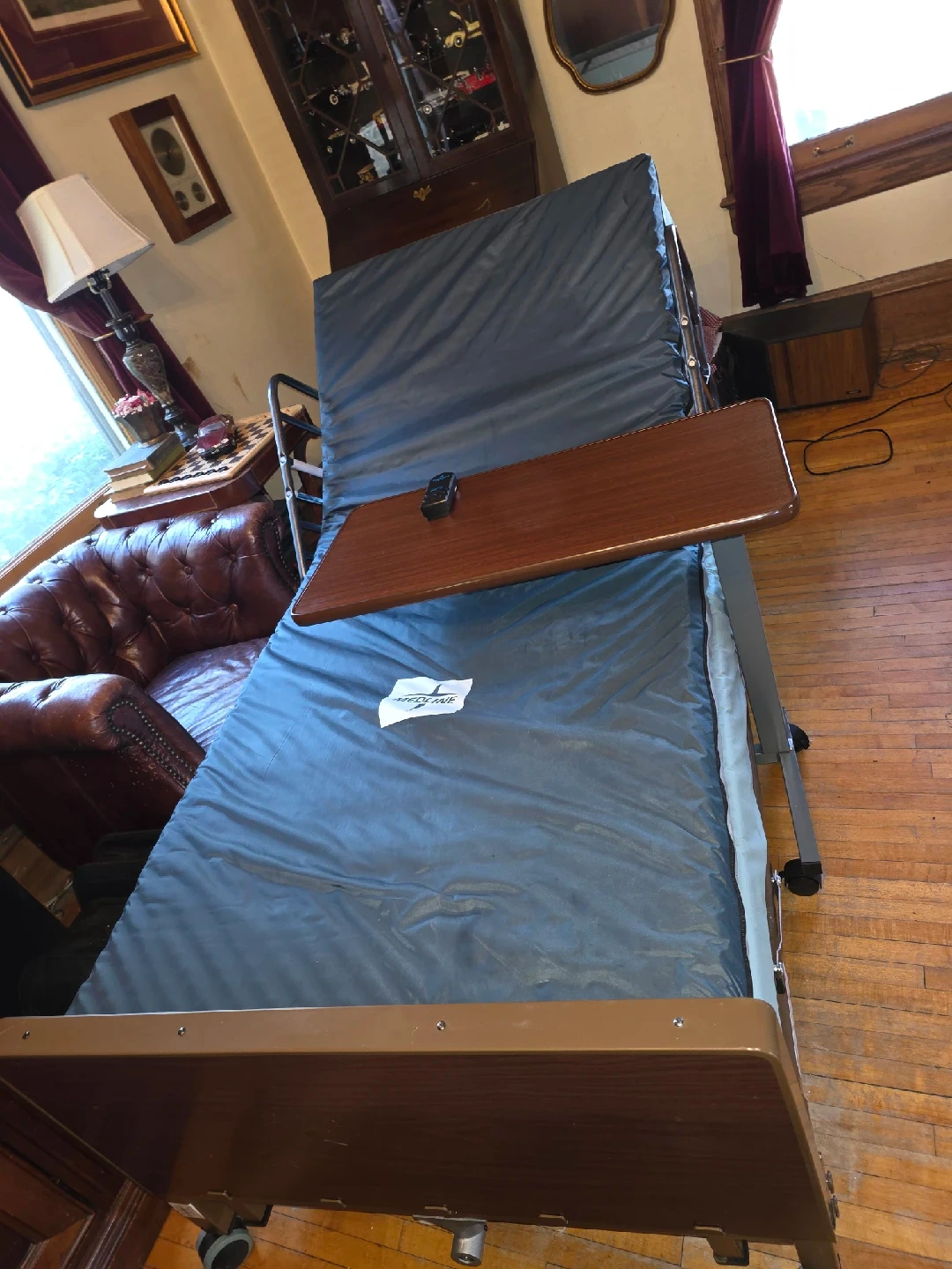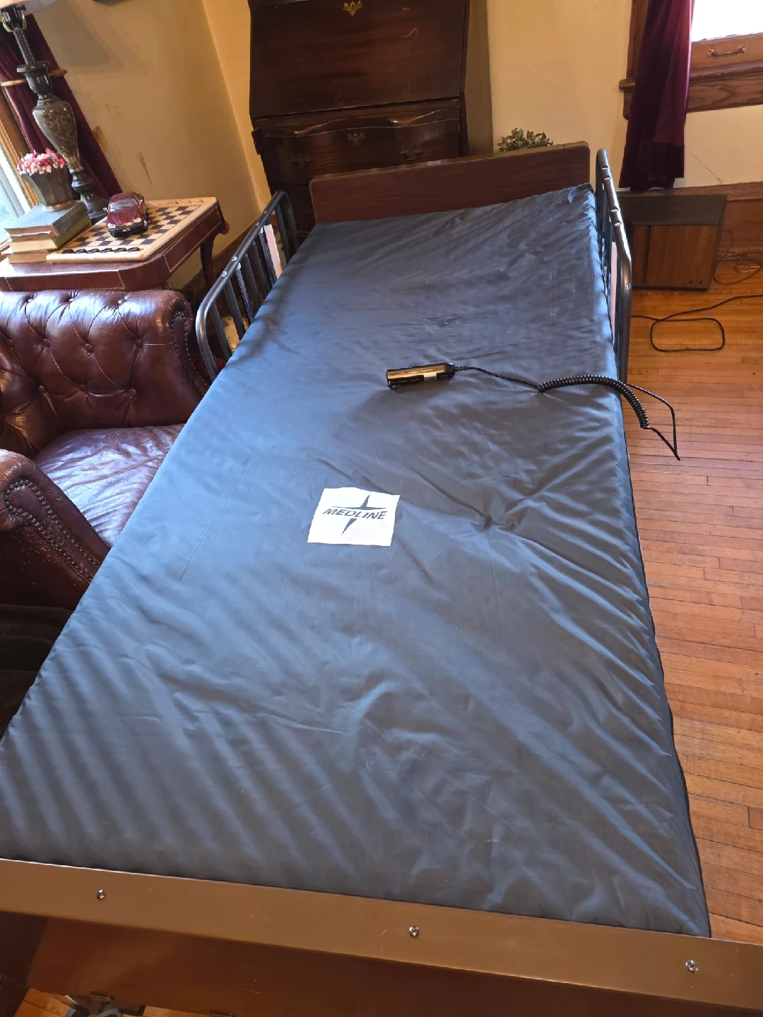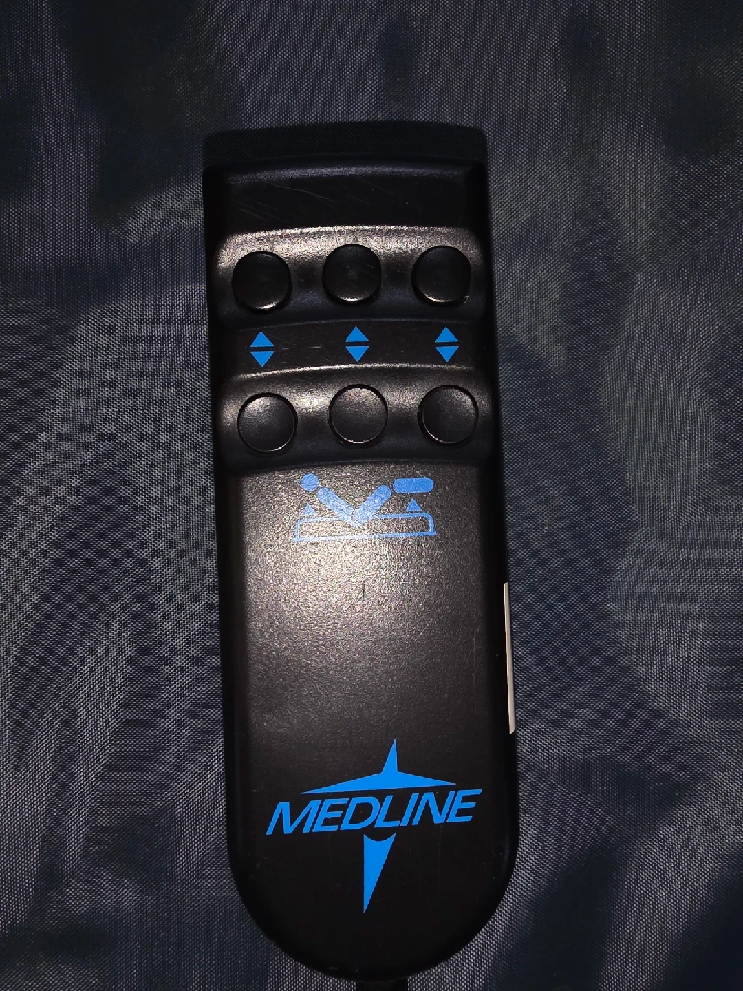 65Adjust sitting up and or elevating legs with the push of a button. Never Slept In.(My son sat on it for demo purposes) I got this because the we werent sure if I could navigate stairs on crutches but I did so I was able to sleep in my own bed. This also includes an un slept in Gel topper and new slide tray seen in pics. I also have an unused portable toilet and a used shower transfer bench and a new chair type device for carrying someone up and down stairs if those are of interest. 88x36x28 inches 224x90 x70 cm Brand: Medline