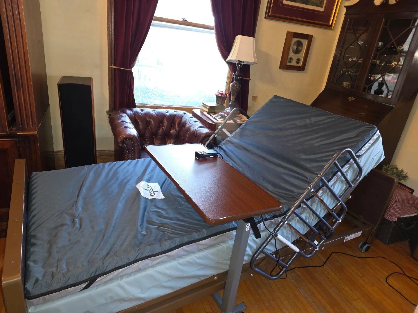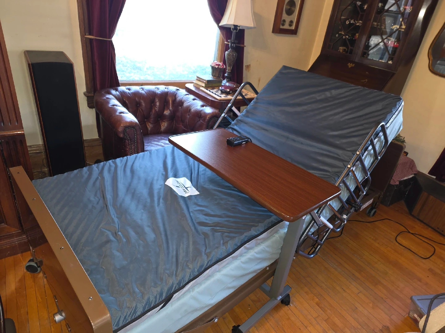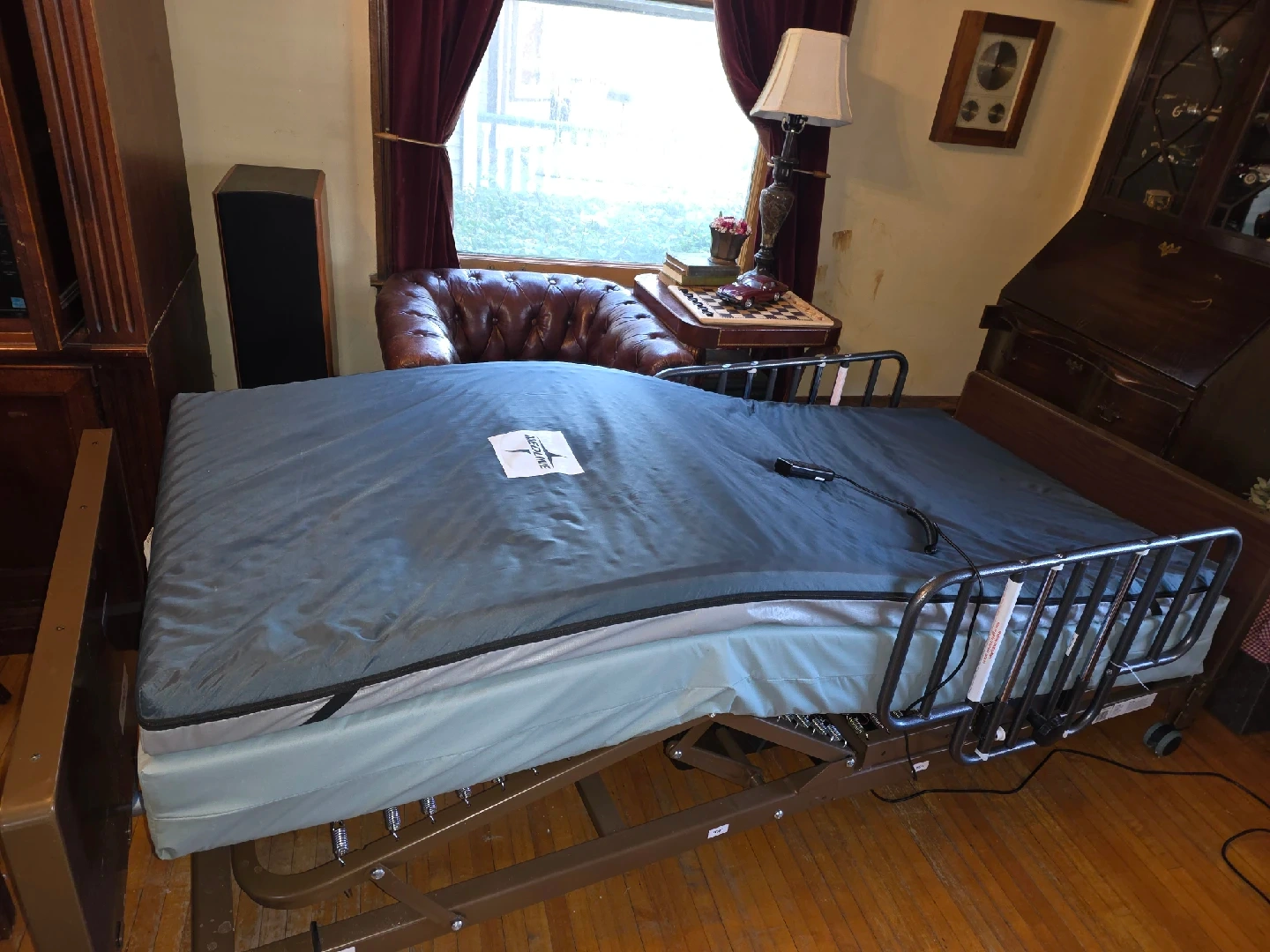 65Adjust sitting up and or elevating legs with the push of a button. Never Slept In.(My son sat on it for demo purposes) I got this because the we werent sure if I could navigate stairs on crutches but I did so I was able to sleep in my own bed. This also includes an un slept in Gel topper and new slide tray seen in pics. I also have an unused portable toilet and a used shower transfer bench and a new chair type device for carrying someone up and down stairs if those are of interest. 88x36x28 inches 224x90 x70 cm Brand: Medline